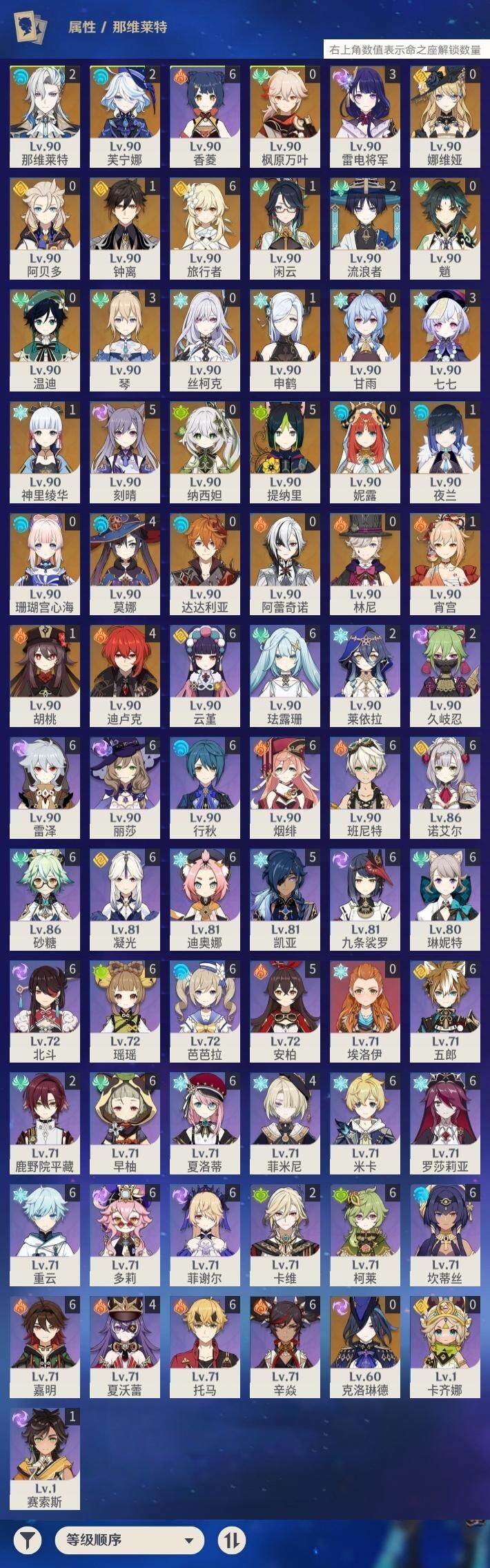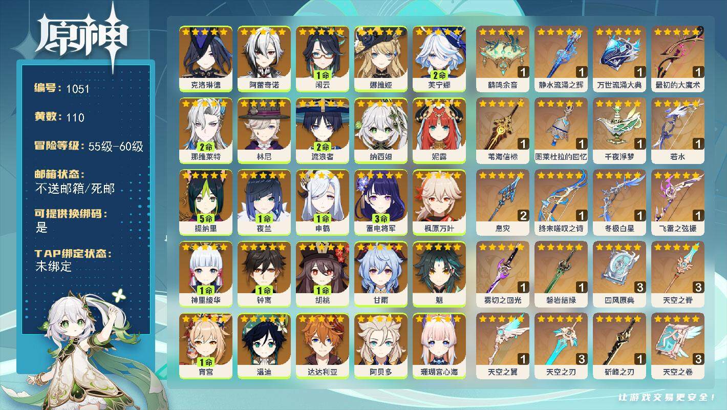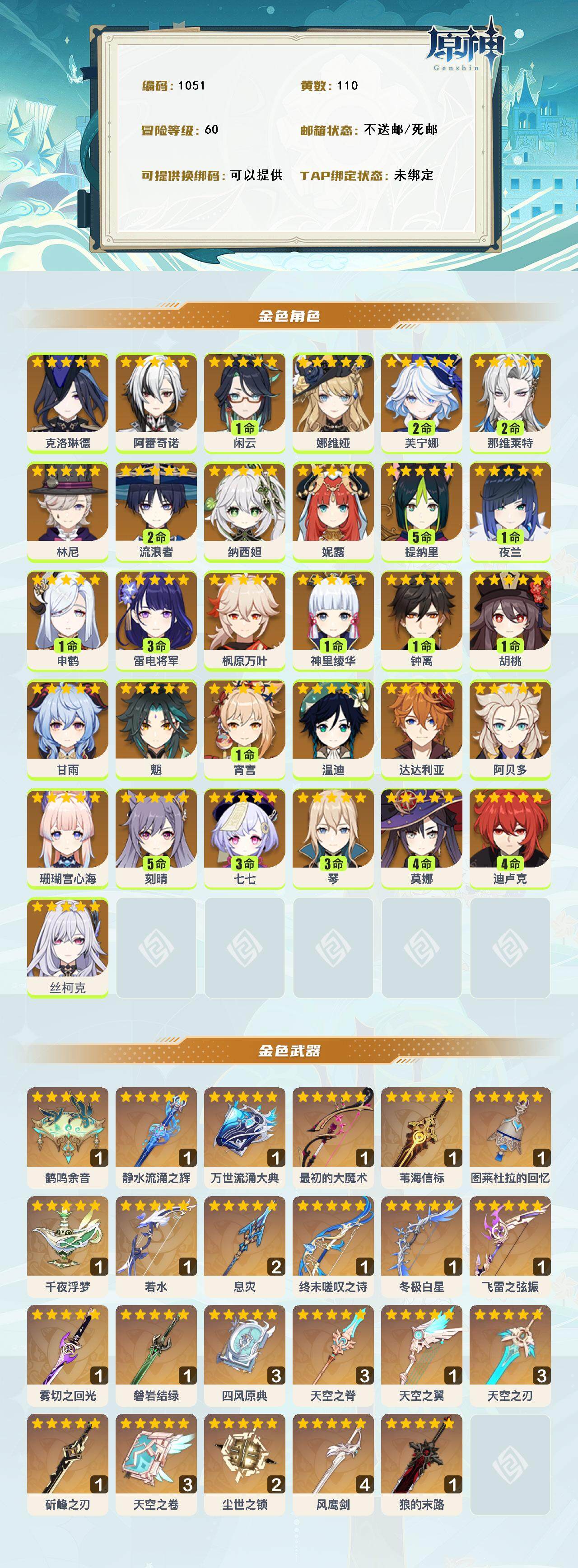 [14614684]60级/110黄/女主/31个五星角色/26个五星武器 0命克洛琳德0命阿蕾奇诺1命闲云0命娜维娅2命芙宁娜2命那维莱特0命林尼2命流浪者0命纳西妲0命妮露5命提纳里1命夜兰1命申鹤3命雷电将军0命枫原万叶1命神里绫华1命钟离1命胡桃0命甘雨0命魈1命宵宫0命温迪0命达达利亚0命阿贝多0命珊瑚宫心海5命刻晴3命七七3命琴4命莫娜4命迪卢克0命丝柯克精1鹤鸣余音精1静水流涌之辉精1万世流涌大典精1最初的大魔术精1苇海信标精1图莱杜拉的回忆精1千夜浮梦精1若水精2息灾精1终末嗟叹之诗精1冬极白星精1飞雷之弦振精1雾切之回光精1磐岩结绿精3四风原典精3天空之脊精1天空之翼精3天空之刃精1斫峰之刃精3天空之卷精2尘世之锁精4风鹰剑精1狼的末路