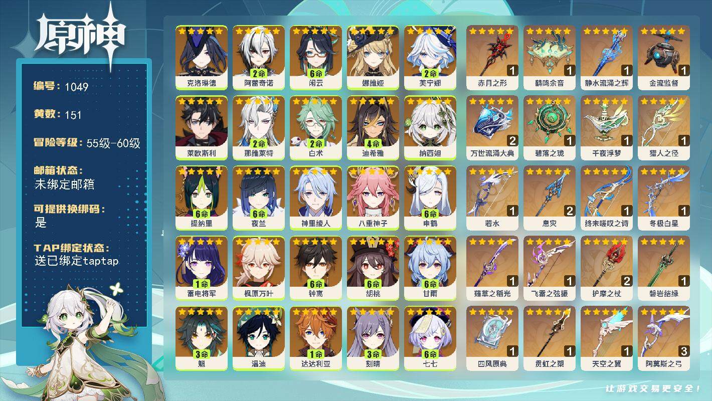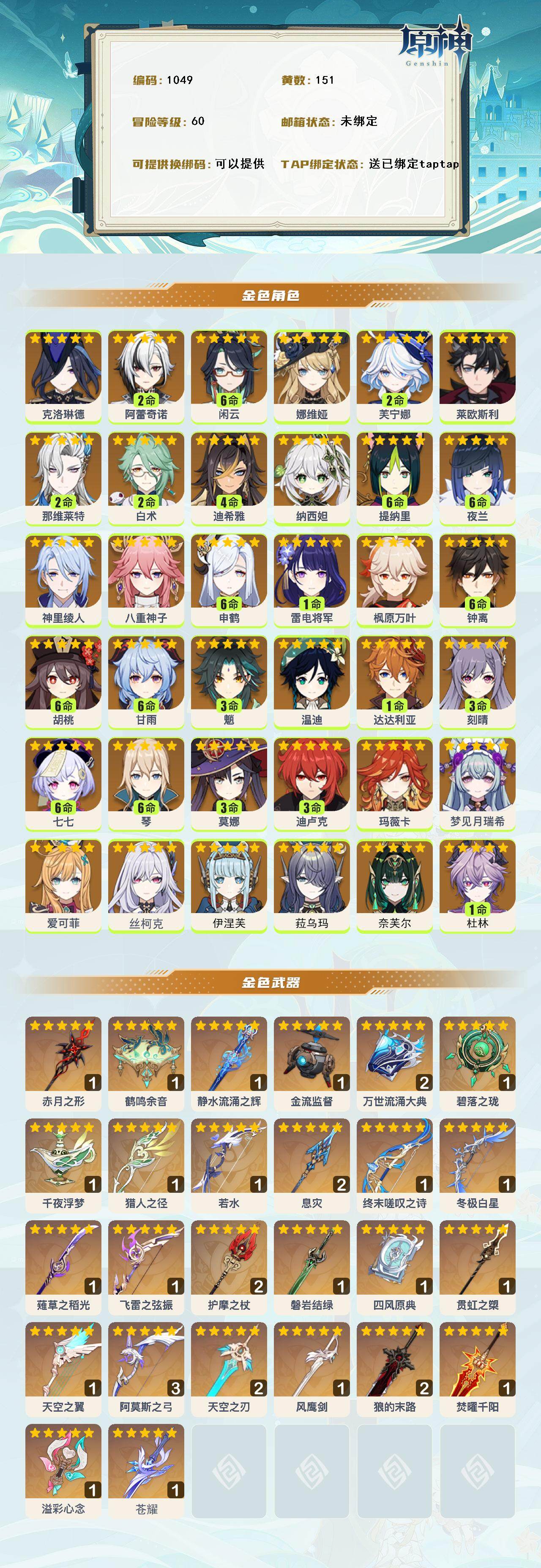 [14614794]60级/151黄/男主/36个五星角色/27个五星武器 0命克洛琳德2命阿蕾奇诺满命闲云0命娜维娅2命芙宁娜0命莱欧斯利2命那维莱特2命白术4命迪希雅0命纳西妲满命提纳里满命夜兰0命神里绫人0命八重神子满命申鹤1命雷电将军0命枫原万叶满命钟离满命胡桃满命甘雨3命魈0命温迪1命达达利亚3命刻晴满命七七满命琴3命莫娜3命迪卢克0命玛薇卡0命梦见月瑞希0命爱可菲0命丝柯克0命伊涅芙0命菈乌玛0命奈芙尔1命杜林精1赤月之形精1鹤鸣余音精1静水流涌之辉精1金流监督精2万世流涌大典精1碧落之珑精1千夜浮梦精1猎人之径精1若水精2息灾精1终末嗟叹之诗精1冬极白星精1薙草之稻光精1飞雷之弦振精2护摩之杖精1磐岩结绿精1四风原典精1贯虹之槊精1天空之翼精3阿莫斯之弓精2天空之刃精1风鹰剑精2狼的末路精1焚曜千阳精1溢彩心念精1苍耀