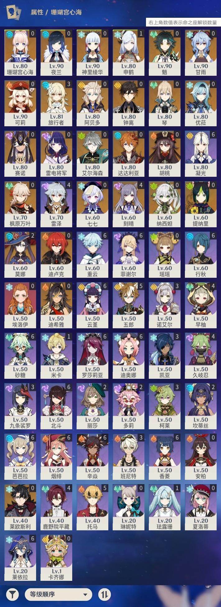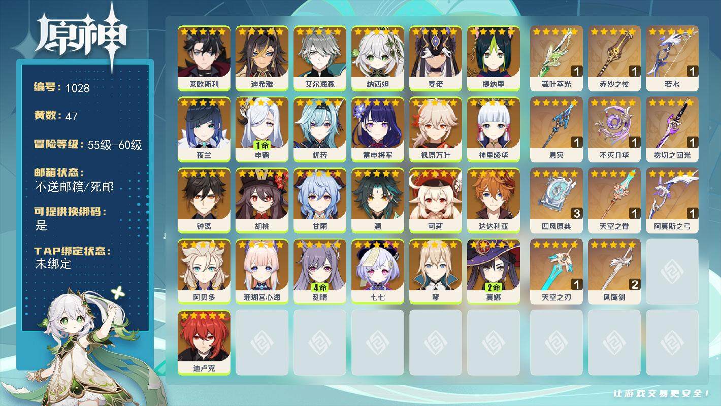 [14618080]58级/47黄/女主/25个五星角色/12个五星武器 0命莱欧斯利0命迪希雅0命艾尔海森0命纳西妲0命赛诺0命提纳里0命夜兰1命申鹤0命优菈0命雷电将军0命枫原万叶0命神里绫华0命钟离0命胡桃0命甘雨0命魈0命可莉0命达达利亚0命阿贝多0命珊瑚宫心海4命刻晴0命七七0命琴2命莫娜0命迪卢克精1裁叶萃光精1赤沙之杖精1若水精1息灾精1不灭月华精1雾切之回光精3四风原典精1天空之脊精1阿莫斯之弓精1天空之刃精2风鹰剑