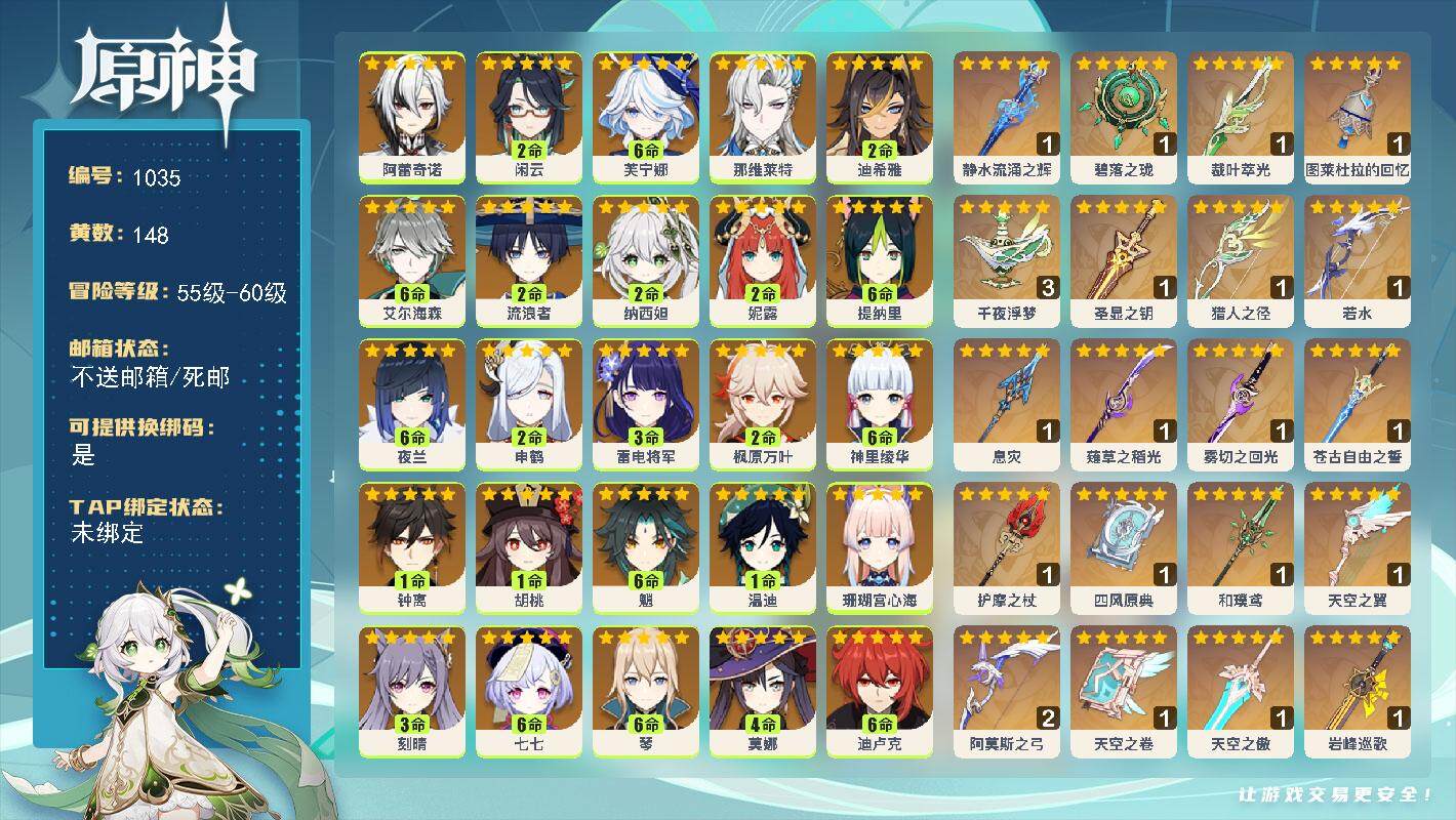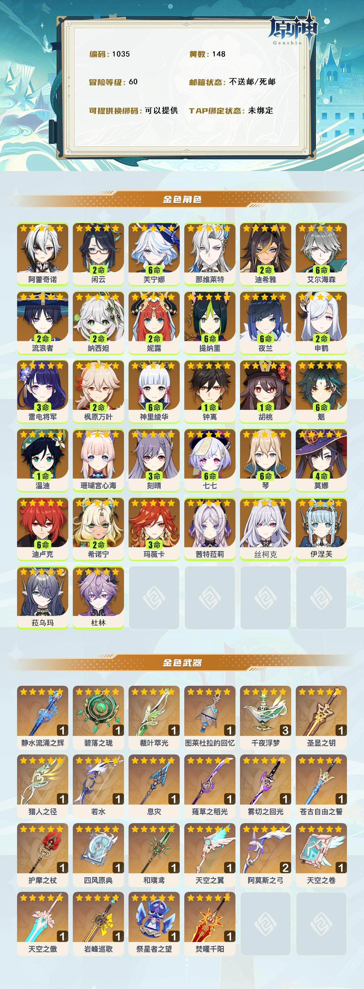 [14618873]60级/148黄/女主/32个五星角色/27个五星武器 0命阿蕾奇诺2命闲云满命芙宁娜0命那维莱特2命迪希雅满命艾尔海森2命流浪者2命纳西妲2命妮露满命提纳里满命夜兰2命申鹤3命雷电将军2命枫原万叶满命神里绫华1命钟离1命胡桃满命魈1命温迪0命珊瑚宫心海3命刻晴满命七七满命琴4命莫娜满命迪卢克2命希诺宁3命玛薇卡0命茜特菈莉0命丝柯克0命伊涅芙0命菈乌玛0命杜林精1静水流涌之辉精1碧落之珑精1裁叶萃光精1图莱杜拉的回忆精3千夜浮梦精1圣显之钥精1猎人之径精1若水精1息灾精1薙草之稻光精1雾切之回光精1苍古自由之誓精1护摩之杖精1四风原典精1和璞鸢精1天空之翼精2阿莫斯之弓精1天空之卷精1天空之傲精1岩峰巡歌精1祭星者之望精1焚曜千阳