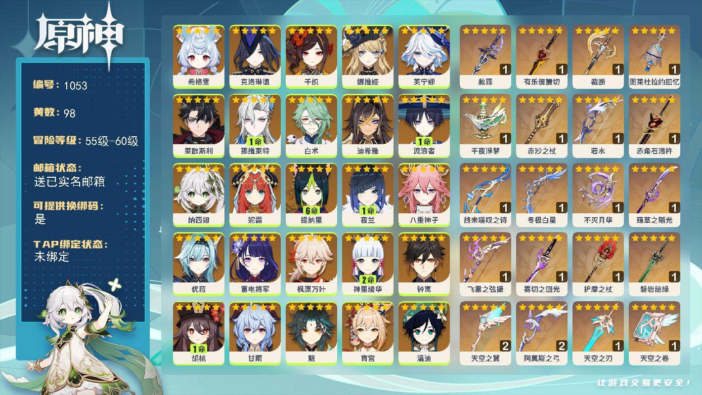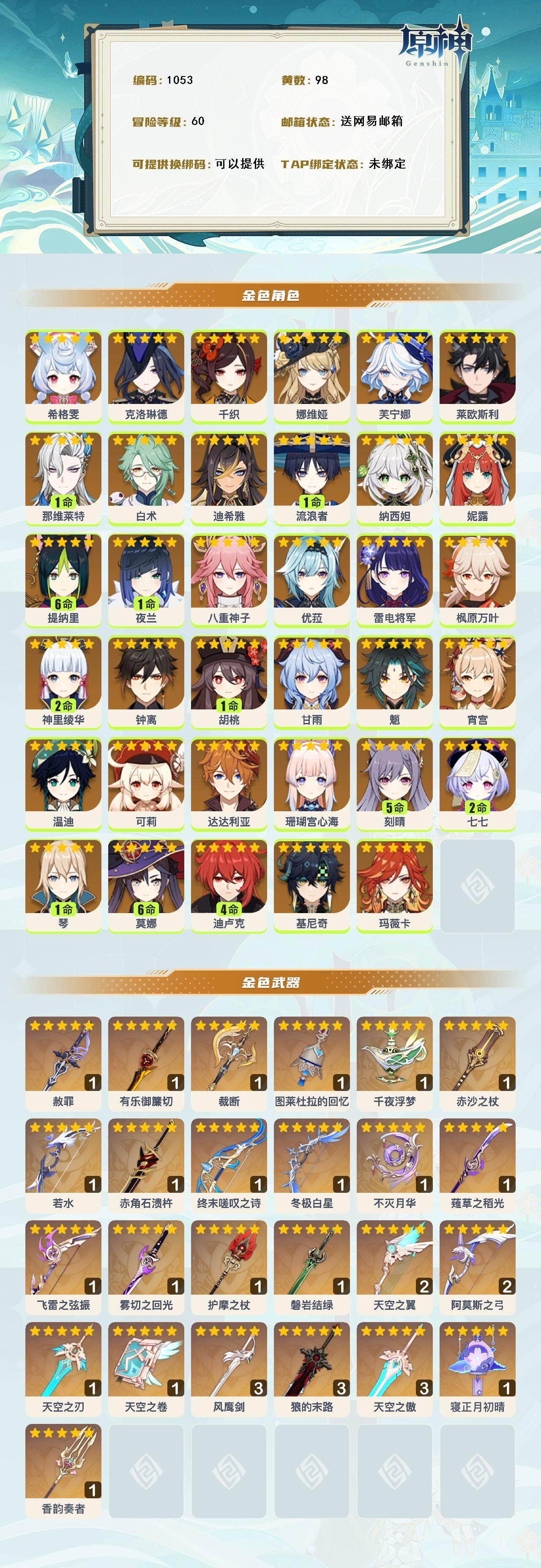 [14619685]60级/98黄/女主/35个五星角色/25个五星武器 0命希格雯0命克洛琳德0命千织0命娜维娅0命芙宁娜0命莱欧斯利1命那维莱特0命白术0命迪希雅1命流浪者0命纳西妲0命妮露满命提纳里1命夜兰0命八重神子0命优菈0命雷电将军0命枫原万叶2命神里绫华0命钟离1命胡桃0命甘雨0命魈0命宵宫0命温迪0命可莉0命达达利亚0命珊瑚宫心海5命刻晴2命七七1命琴满命莫娜4命迪卢克0命基尼奇0命玛薇卡精1赦罪精1有乐御簾切精1裁断精1图莱杜拉的回忆精1千夜浮梦精1赤沙之杖精1若水精1赤角石溃杵精1终末嗟叹之诗精1冬极白星精1不灭月华精1薙草之稻光精1飞雷之弦振精1雾切之回光精1护摩之杖精1磐岩结绿精2天空之翼精2阿莫斯之弓精1天空之刃精1天空之卷精3风鹰剑精3狼的末路精3天空之傲精1寝正月初晴精1香韵奏者