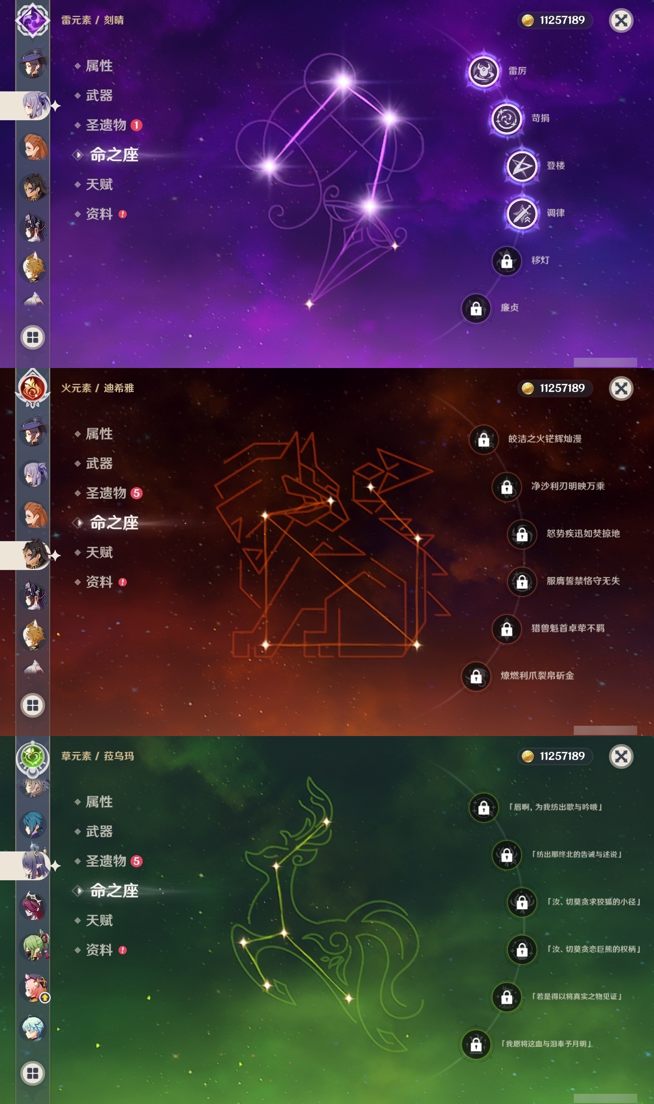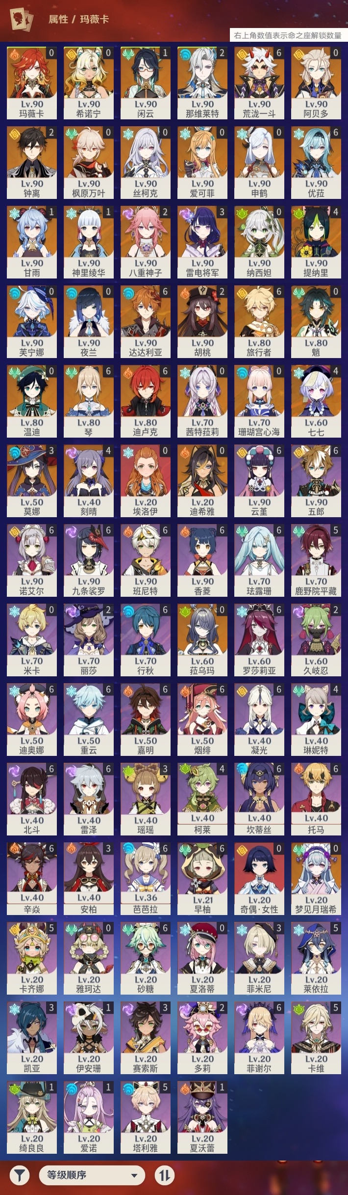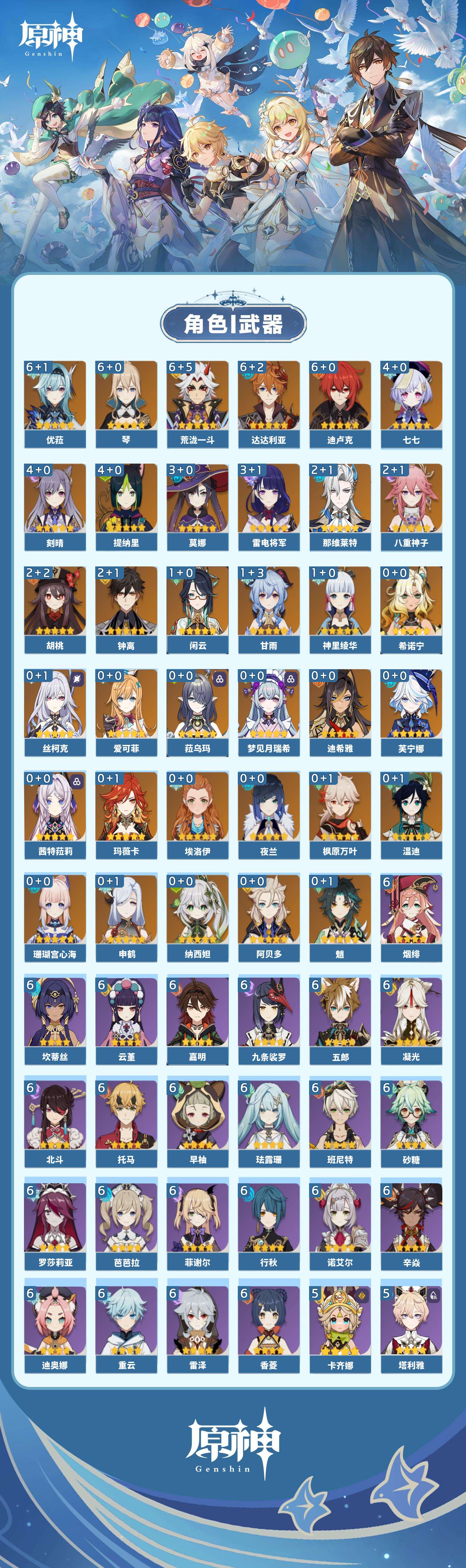 【原神】满命,冒险等级:60,五星数量:59,五星角色:达达利亚 6命迪卢克 6命琴 6命优菈 6命荒泷一斗 6命刻晴 4命七七 4命提纳里 4命雷电将军 3命莫娜 3命那维莱特 2命胡桃 2命钟离 2命八重神子 2命闲云 1命甘雨 1命神里绫华 1命珊瑚宫心海希诺宁温迪玛薇卡茜特菈莉迪希雅梦见月瑞希申鹤阿贝多夜兰芙宁娜爱可菲丝柯克纳西妲菈乌玛枫原万叶魈__五星武器:天空之翼 5精赤角石溃杵 5精阿莫斯之弓 3精护摩之杖 2精四风原典 2精天空之刃 2精冬极白星 2精星鹫赤羽焚曜千阳万世流涌大典苍耀苍古自由之誓和璞鸢松籁响起之时天空之傲天空之脊天空之卷无工之剑薙草之稻光终末嗟叹之诗息灾神乐之真意贯虹之槊__四星角色:班尼特 6命行秋 6命九条裟罗 6命香菱 6命珐露珊 6命凝光 6命迪奥娜 6命砂糖 6命坎蒂丝 6命芭芭拉 6命云堇 6命早柚 6命托马 6命五郎 6命烟绯 6命重云 6命辛焱 6命诺艾尔 6命罗莎莉亚 6命雷泽 6命菲谢尔 6命北斗 6命嘉明 6命卡齐娜 5命鹿野院平藏 5命莱依拉 5命卡维 5命塔利雅 5命柯莱 4命琳妮特 4命瑶瑶 3命菲米尼 3命赛索斯 3命久岐忍 2命多莉 2命绮良良 1命夏沃蕾 1命伊安珊 1命爱诺 1命埃洛伊奇偶·女性米卡夏洛蒂