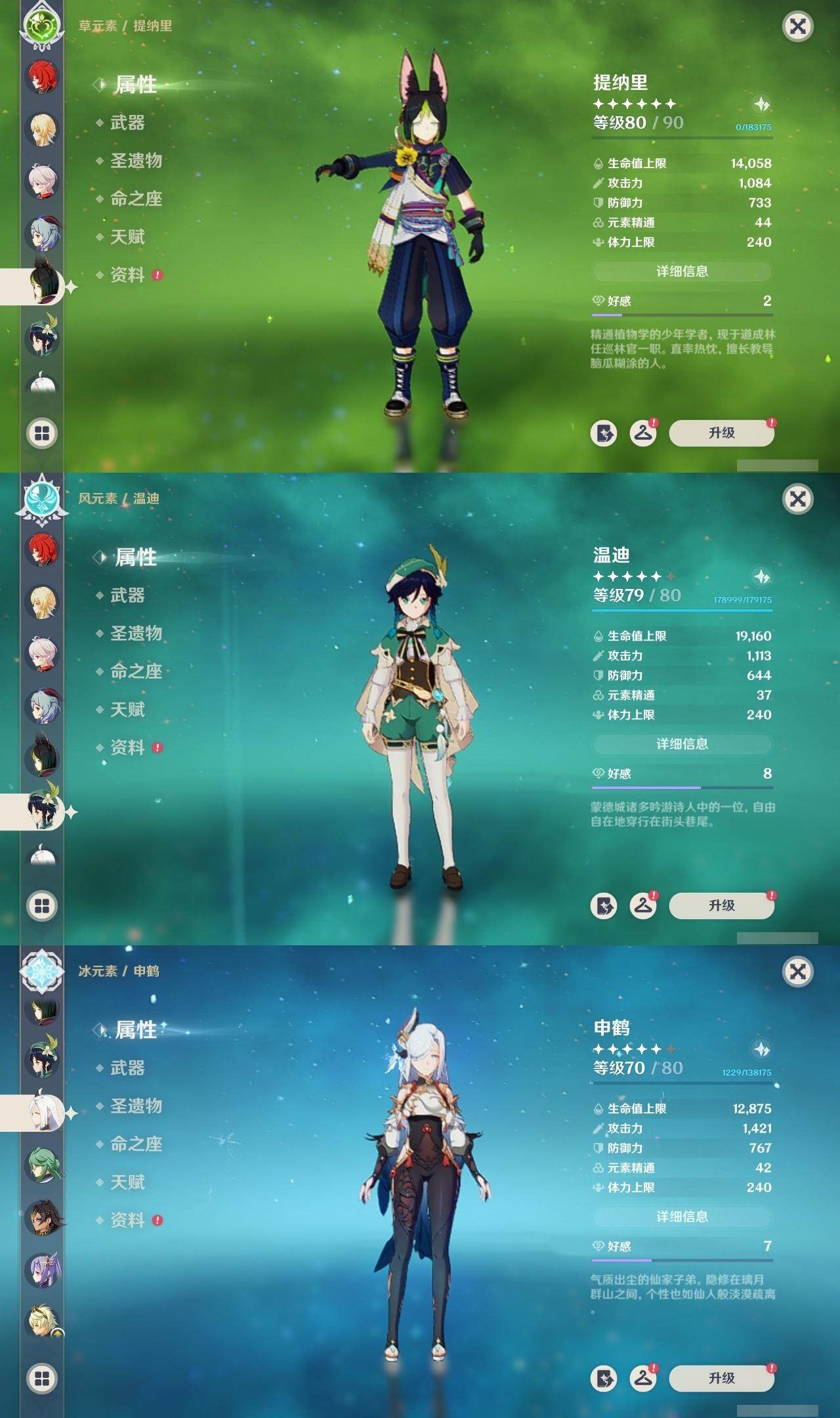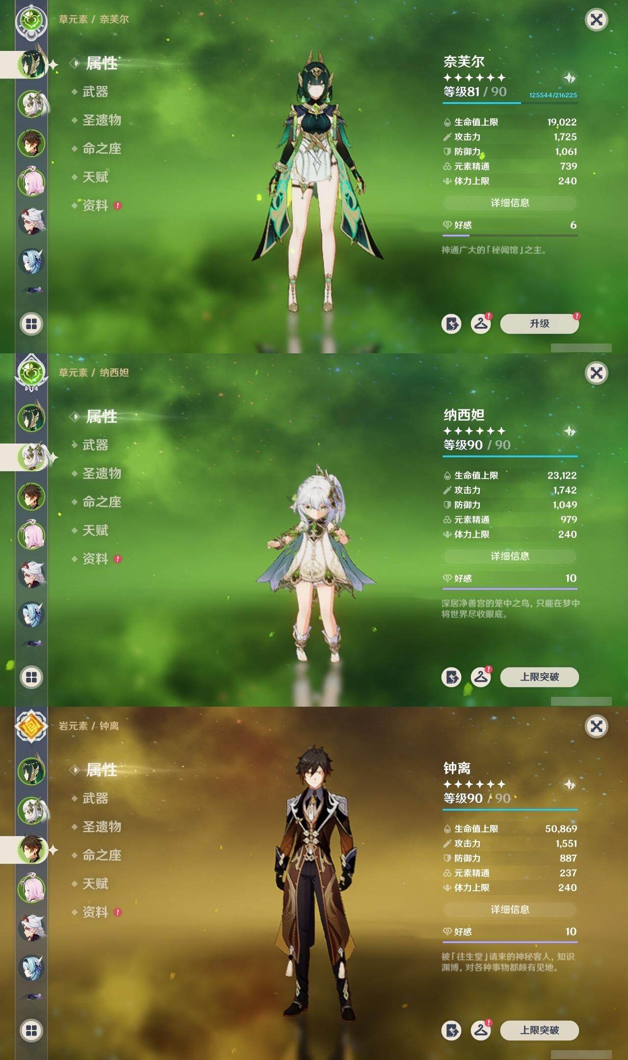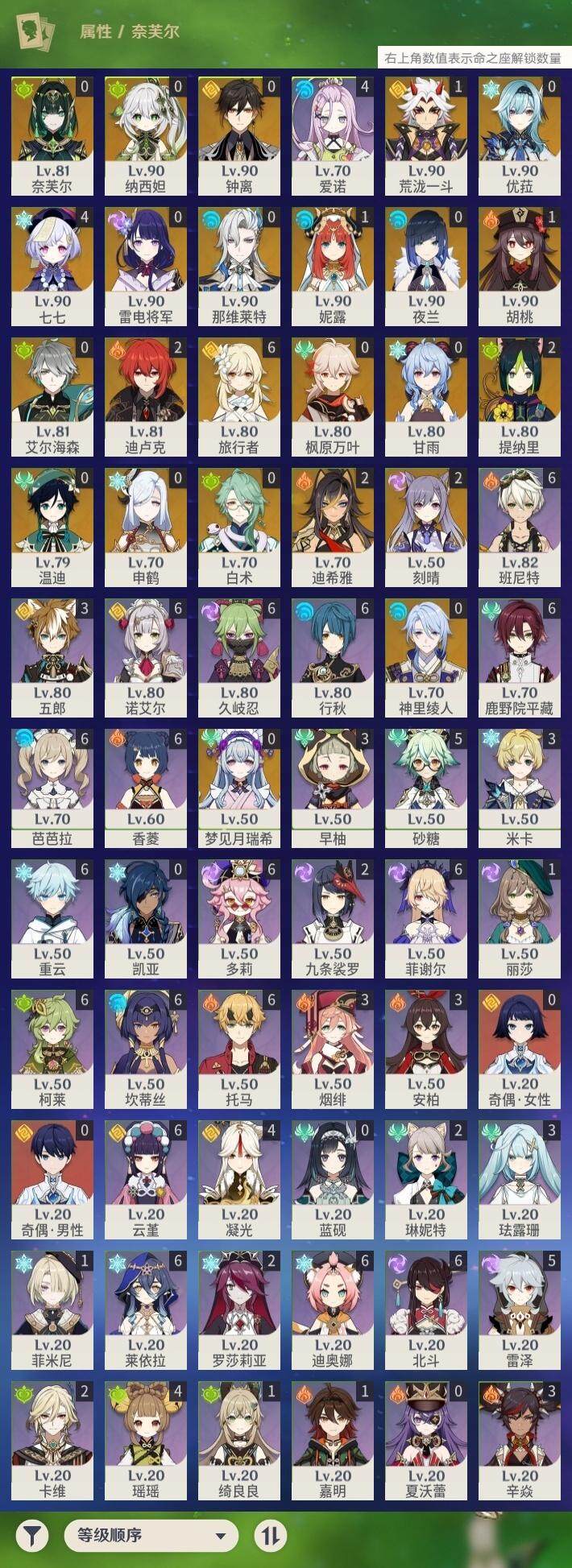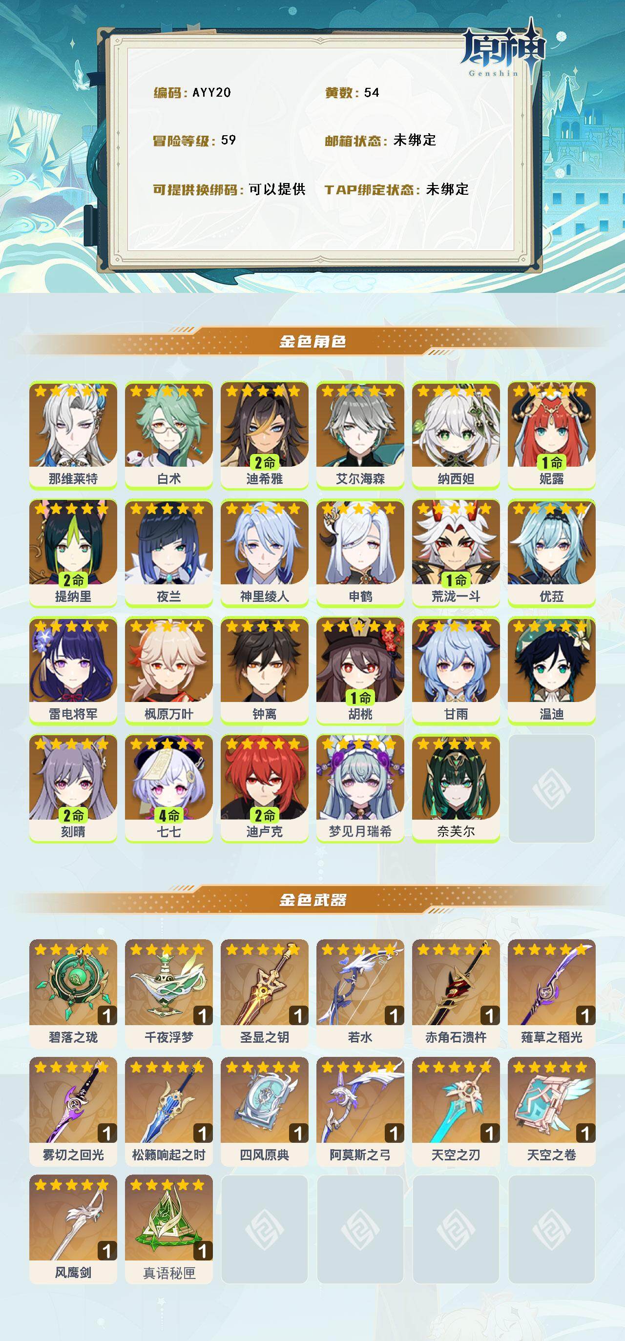 [14620992]59级/54黄/女主/23个五星角色/16个五星武器 0命那维莱特0命白术2命迪希雅0命艾尔海森0命纳西妲1命妮露2命提纳里0命夜兰0命神里绫人0命申鹤1命荒泷一斗0命优菈0命雷电将军0命枫原万叶0命钟离1命胡桃0命甘雨0命温迪2命刻晴4命七七2命迪卢克0命梦见月瑞希0命奈芙尔精1碧落之珑精1千夜浮梦精1圣显之钥精1若水精1赤角石溃杵精1薙草之稻光精1雾切之回光精1松籁响起之时精1四风原典精1阿莫斯之弓精1天空之刃精1天空之卷精1风鹰剑精1真语秘匣