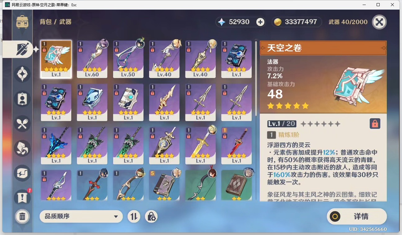 [14631400]【邮箱】:未绑定 52930原石 【总黄数】:3 【冒险等级】:45 【0命金色角色】:杜林温迪 【1精武器】:天空之卷