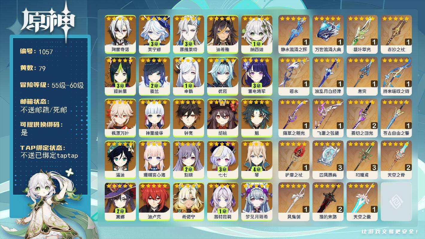 [14634636]60级/79黄/女主/25个五星角色/19个五星武器 0命阿蕾奇诺3命芙宁娜3命那维莱特0命迪希雅1命纳西妲3命提纳里2命夜兰1命申鹤0命优菈3命雷电将军0命枫原万叶0命神里绫华0命钟离0命胡桃0命魈0命温迪0命珊瑚宫心海2命刻晴3命七七4命琴2命莫娜0命迪卢克0命希诺宁1命茜特菈莉0命梦见月瑞希精1静水流涌之辉精1万世流涌大典精1裁叶萃光精1赤沙之杖精1若水精1波乱月白经津精1息灾精1终末嗟叹之诗精1薙草之稻光精1飞雷之弦振精2雾切之回光精1苍古自由之誓精1护摩之杖精3四风原典精3和璞鸢精2天空之脊精1风鹰剑精2狼的末路精1天空之傲