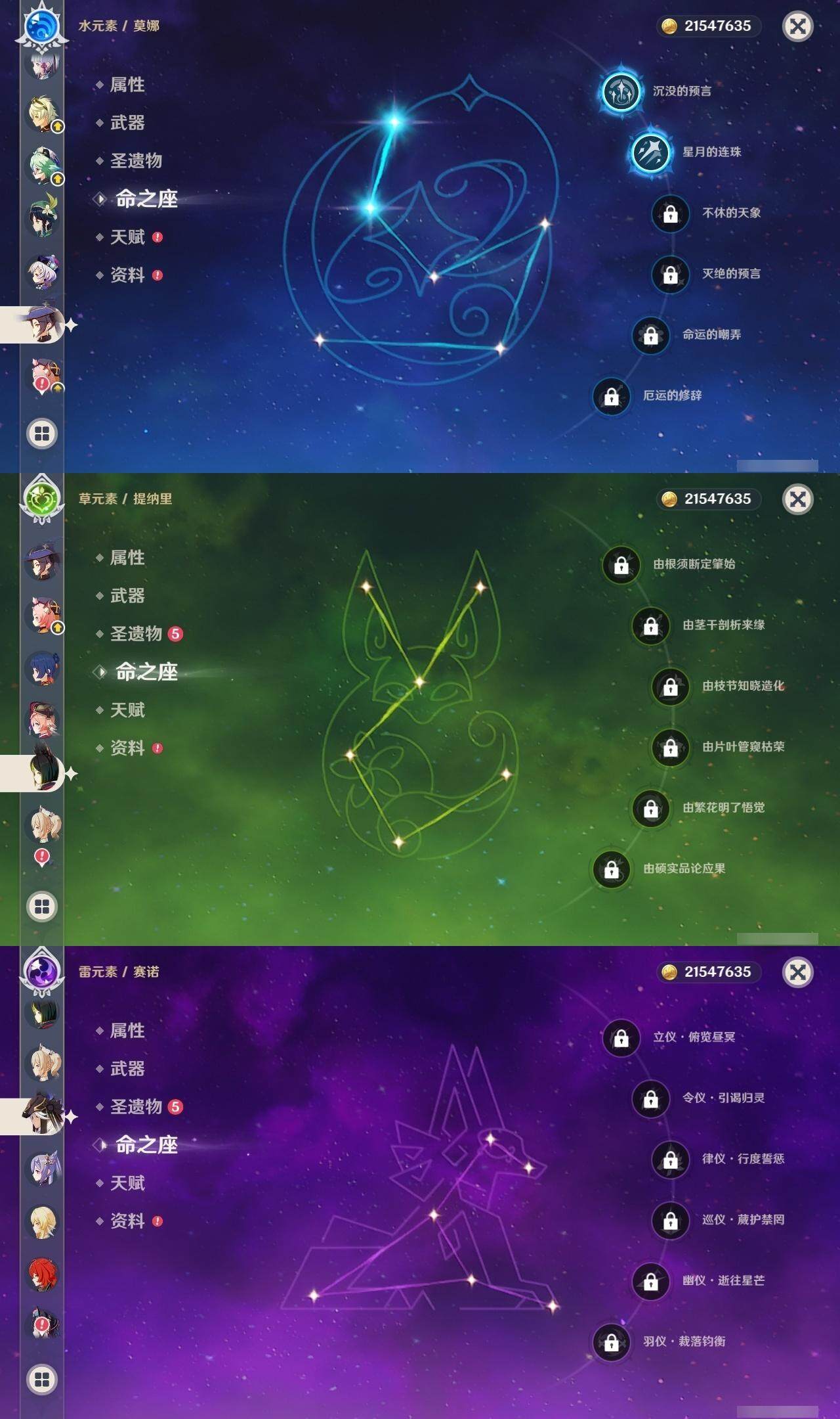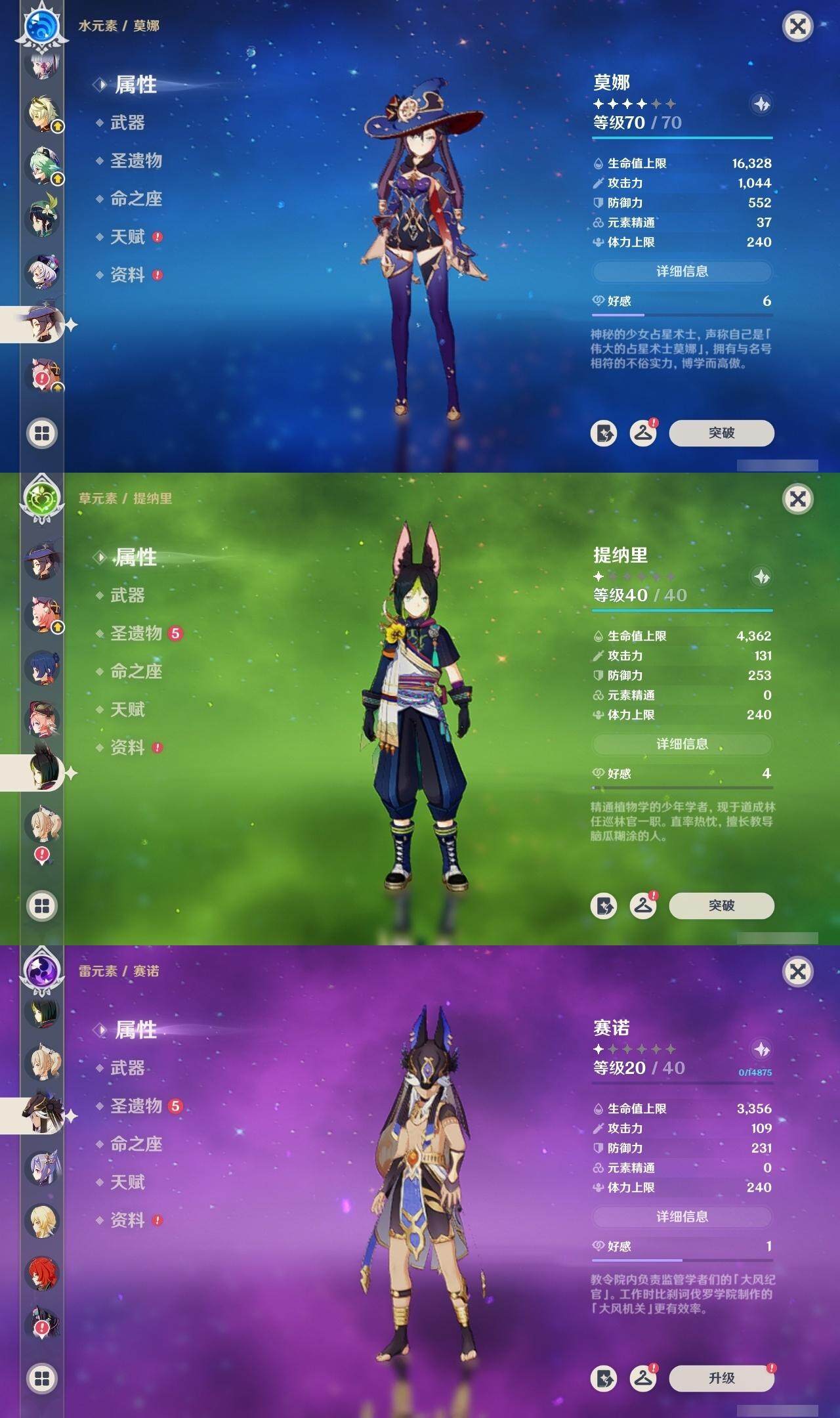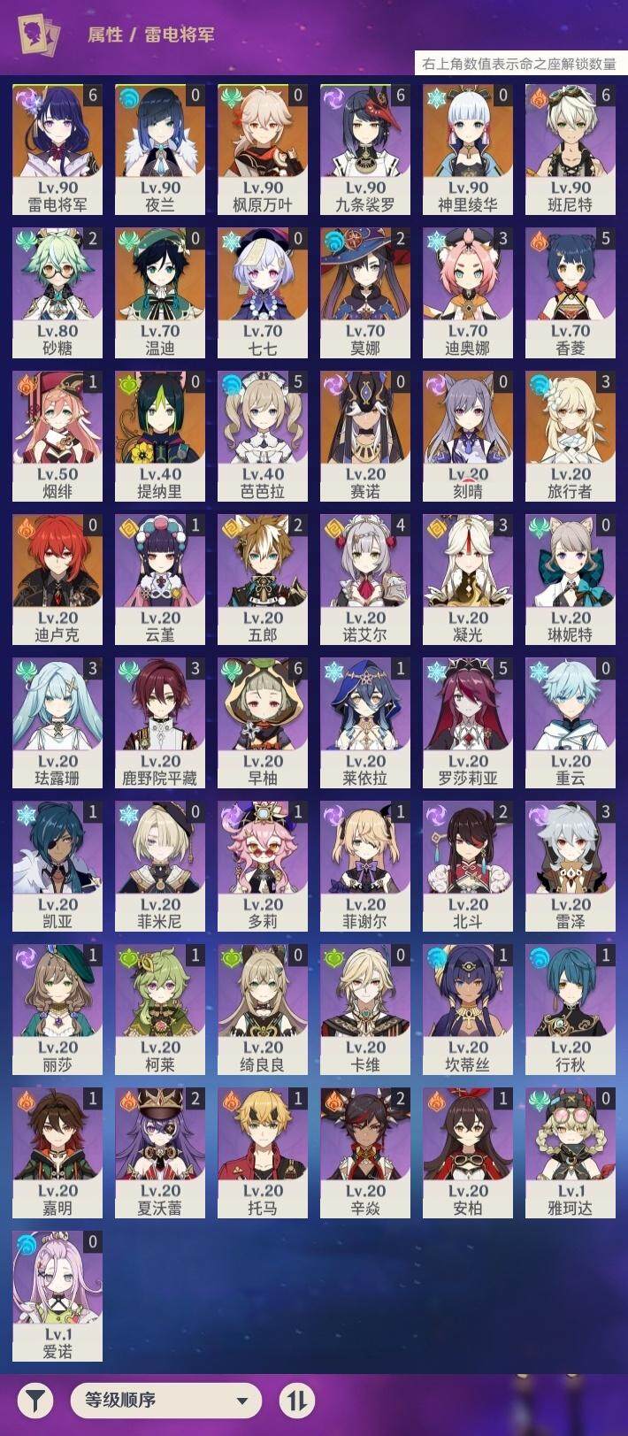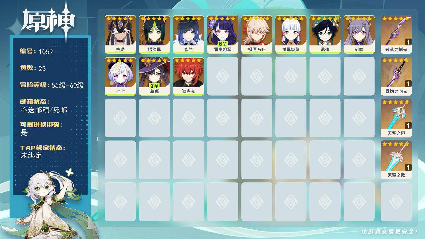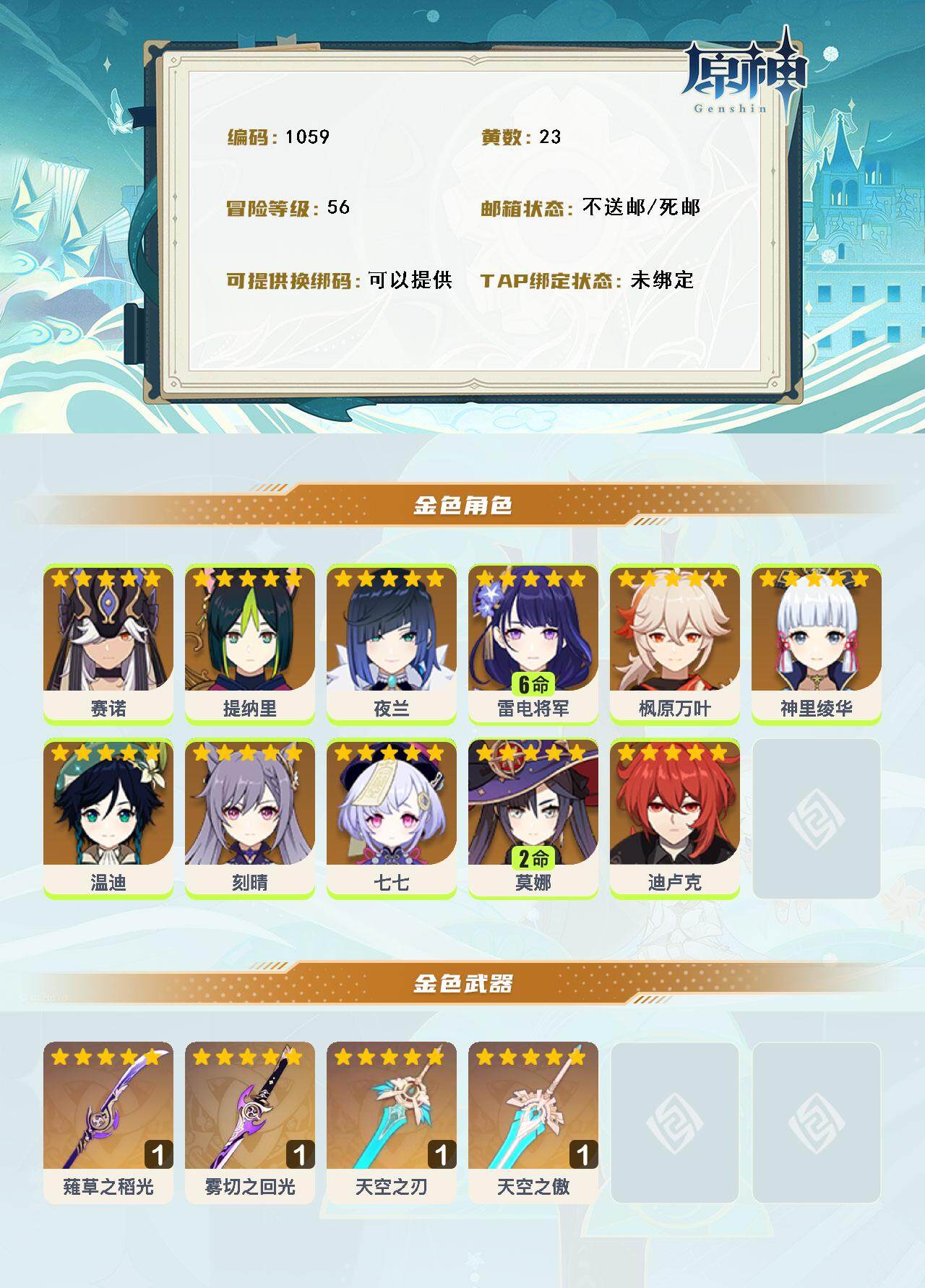 [14634703]56级/23黄/女主/11个五星角色/4个五星武器 0命赛诺0命提纳里0命夜兰满命雷电将军0命枫原万叶0命神里绫华0命温迪0命刻晴0命七七2命莫娜0命迪卢克精1薙草之稻光精1雾切之回光精1天空之刃精1天空之傲