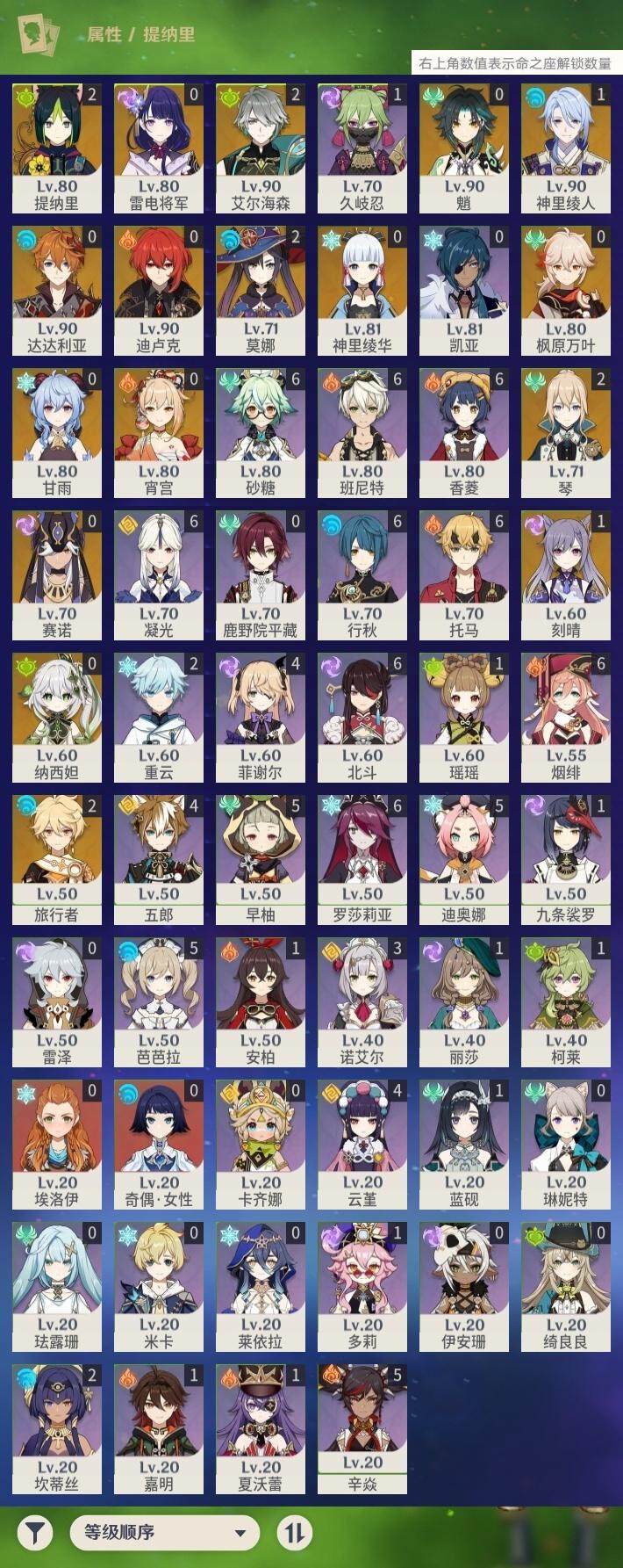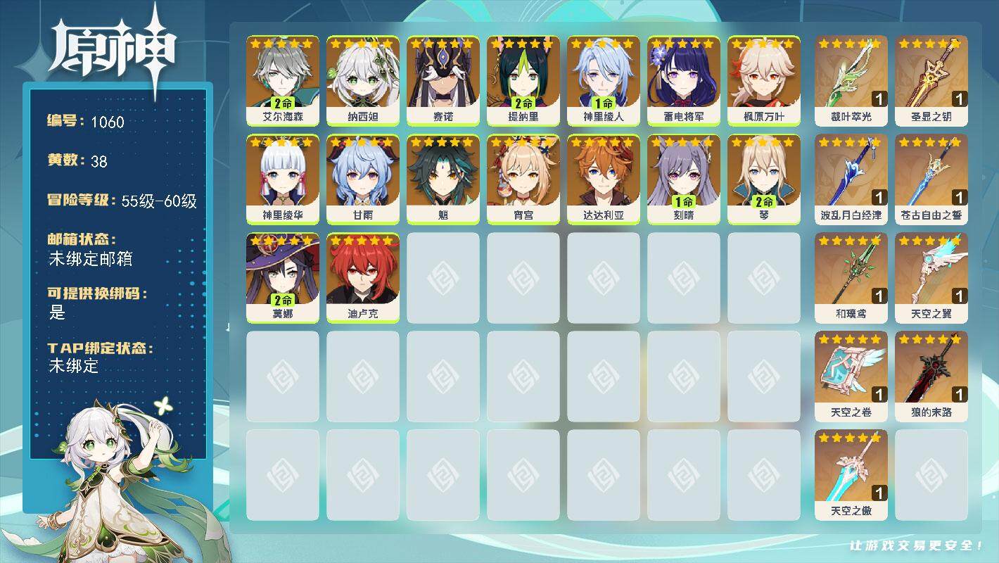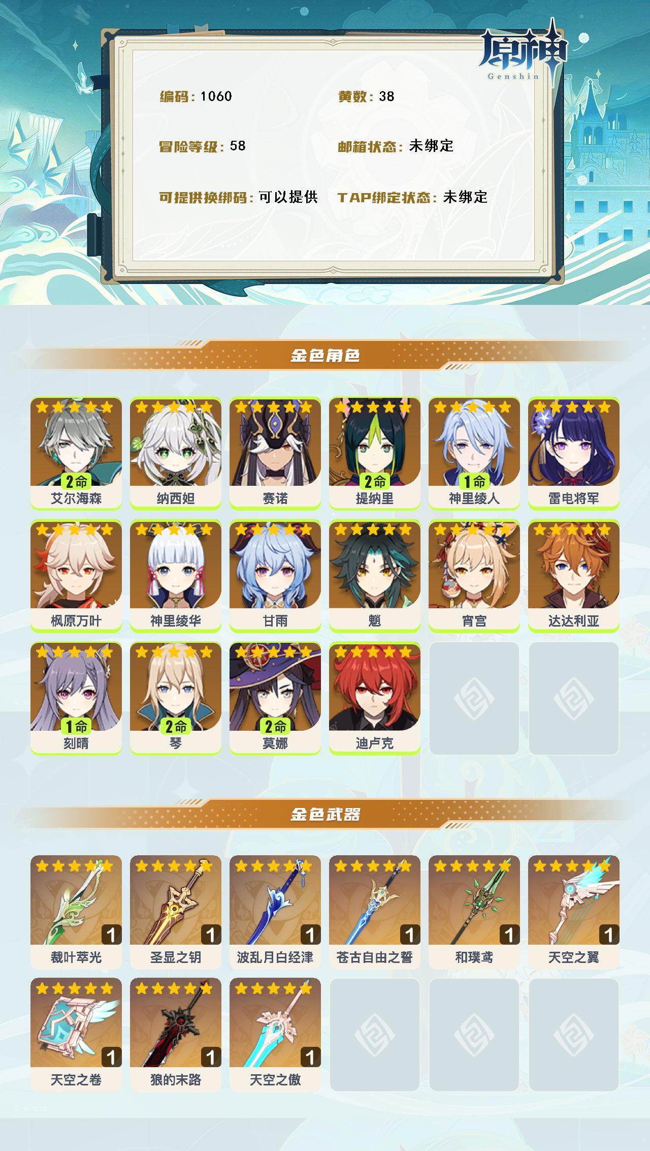 [14635354]58级/38黄/男主/16个五星角色/12个五星武器 2命艾尔海森0命纳西妲0命赛诺2命提纳里1命神里绫人0命雷电将军0命枫原万叶0命神里绫华0命甘雨0命魈0命宵宫0命达达利亚1命刻晴2命琴2命莫娜0命迪卢克精1裁叶萃光精1圣显之钥精1波乱月白经津精1苍古自由之誓精1和璞鸢精1天空之翼精1天空之卷精1狼的末路精1天空之傲