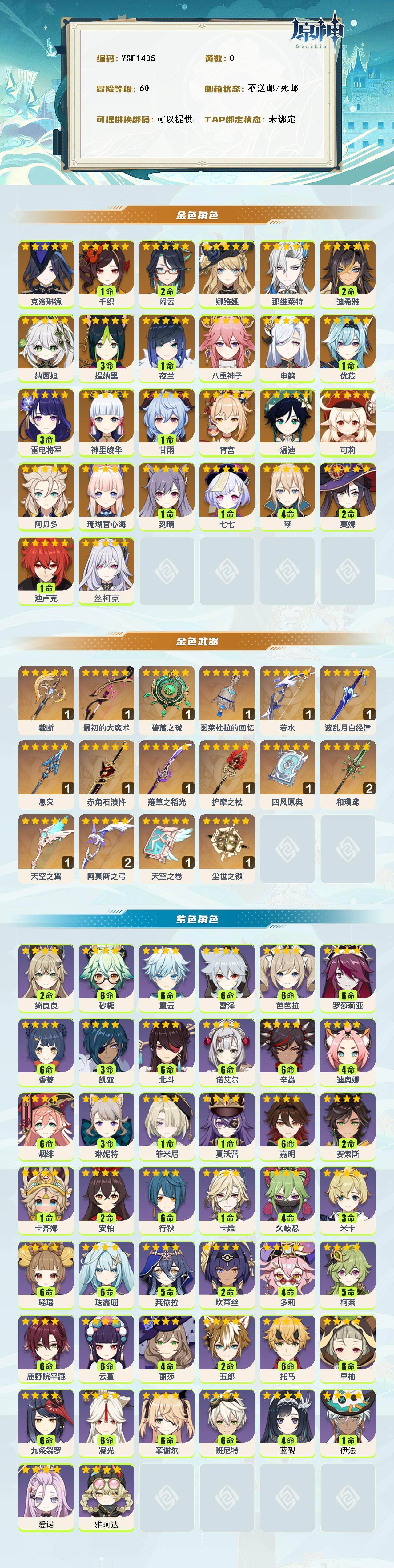 【ysf1435】60级/男主/28个五星角色/0命丝柯克/0命克洛琳德/1命千织/2命闲云/0命娜维娅/0命那维莱特/2命迪希雅/0命纳西妲/3命提纳里/1命夜兰/0命八重神子/0命申鹤/0命珊瑚宫心海/3命雷电将军/0命宵宫/0命神里绫华/1命优菈/1命甘雨/0命阿贝多/0命可莉/0命温迪/4命琴/1命刻晴/1命迪卢克/2命莫娜/1命七七/精1裁断/精1最初的大魔术/精1碧落之珑/精1图莱杜拉的回忆/精1若水/精1波乱月白经津/精1息灾/精1赤角石溃杵/精1薙草之稻光/精1护摩之杖/精1尘世之锁/精2和璞鸢/精1天空之卷/精1四风原典/精2阿莫斯之弓/精1天空之翼/0命雅珂达/0命爱诺/1命伊法/4命蓝砚/0命卡齐娜/2命赛索斯/满命嘉明/1命夏沃蕾/1命菲米尼/3命琳妮特/2命绮良良/0命卡维/3命米卡/满命瑶瑶/满命珐露珊/5命莱依拉/2命坎蒂丝/4命多莉/5命柯莱/满命鹿野院平藏/4命久岐忍/满命云堇/2命五郎/满命托马/满命九条裟罗/满命早柚/满命烟绯/满命罗莎莉亚/满命辛焱/4命迪奥娜/满命砂糖/满命雷泽/满命菲谢尔/4命丽莎/满命北斗/满命香菱/2命安柏/满命班尼特/满命行秋/满命芭芭拉/满命凝光/满命诺艾尔/3命凯亚/满命重云
