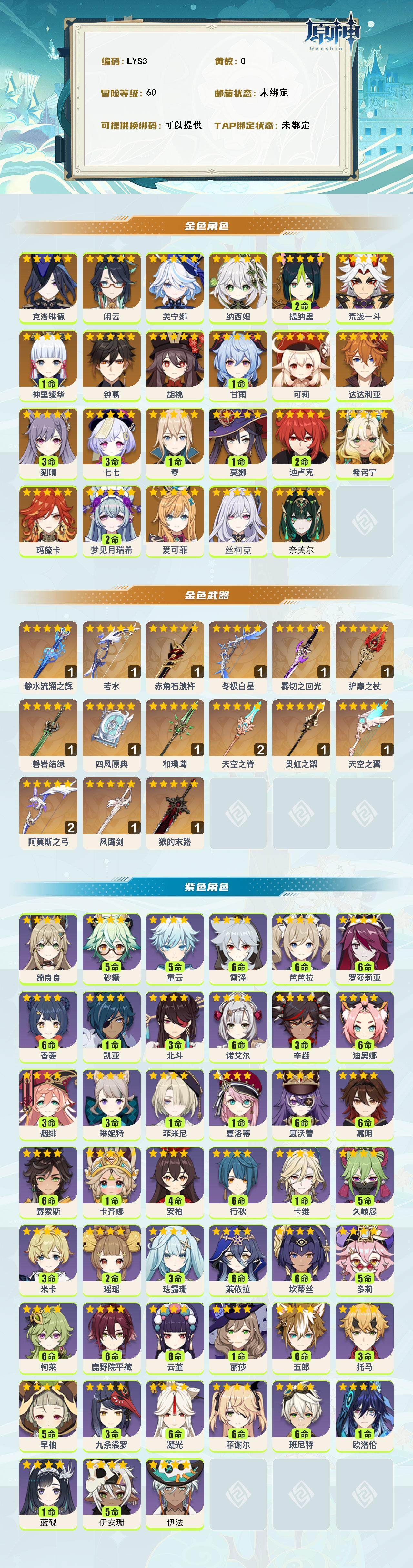 [14638977]总黄数56【金色角色】:奈芙尔0命,丝柯克0命,爱可菲0命,梦见月瑞希2命,玛薇卡0命,希诺宁0命,克洛琳德0命,闲云0命,芙宁娜0命,纳西妲0命,提纳里2命,荒泷一斗0命,神里绫华1命,胡桃0命,甘雨1命,钟离0命,达达利亚0命,可莉0命,琴1命,刻晴3命,迪卢克2命,莫娜1命,七七3命 【拥有武器】:静水流涌之辉精1,若水精1,赤角石溃杵精1,冬极白星精1,雾切之回光精1,护摩之杖精1,磐岩结绿精1,贯虹之槊精1,和璞鸢精1,四风原典精1,狼的末路精1,阿莫斯之弓精2,风鹰剑精1,天空之脊精2,天空之翼精1 【紫色角色】:伊法0命,伊安珊5命,蓝砚1命,欧洛伦0命,卡齐娜0命,赛索斯满命,嘉明满命,夏沃蕾满命,夏洛蒂1命,菲米尼0命,琳妮特3命,绮良良0命,卡维1命,米卡3命,瑶瑶2命,珐露珊3命,莱依拉满命,坎蒂丝满命,多莉5命,柯莱满命,鹿野院平藏满命,久岐忍5命,云堇满命,五郎满命,托马3命,九条裟罗3命,早柚5命,烟绯3命,罗莎莉亚满命,辛焱3命,迪奥娜满命,砂糖5命,雷泽满命,菲谢尔满命,丽莎1命,北斗3命,香菱满命,安柏4命,班尼特满命,行秋满命,芭芭拉满命,凝光满命,诺艾尔满命,凯亚0命,重云5命