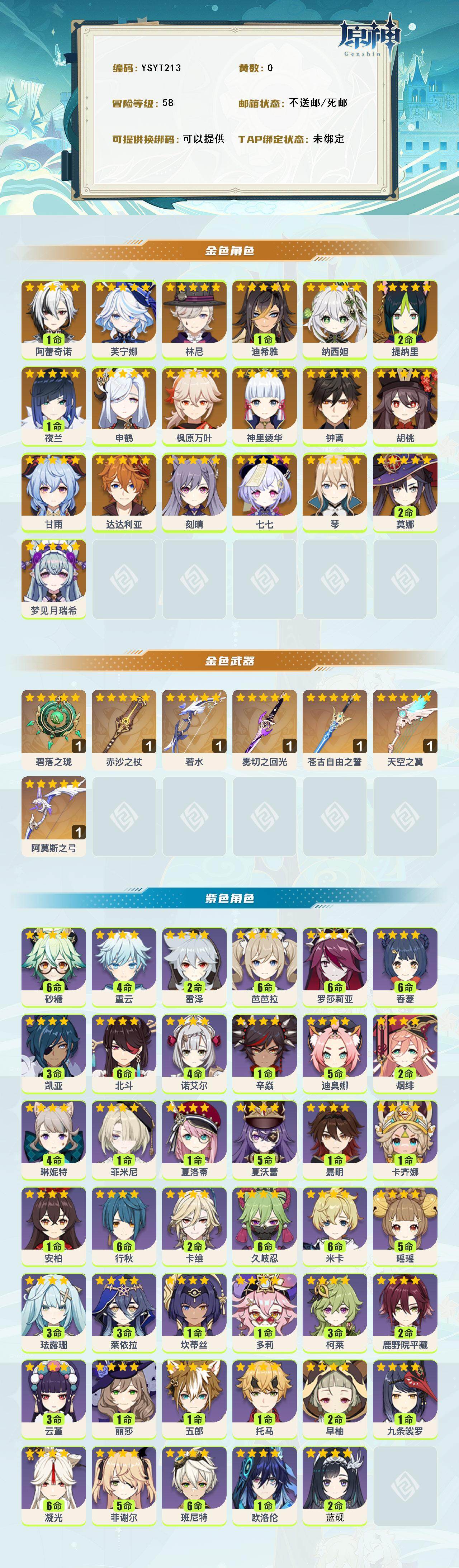 【ysyt213】58级/女主/20个五星角色/0命梦见月瑞希/1命阿蕾奇诺/0命芙宁娜/0命林尼/1命迪希雅/0命纳西妲/2命提纳里/1命夜兰/0命申鹤/0命神里绫华/0命枫原万叶/0命胡桃/0命甘雨/0命钟离/0命达达利亚/0命琴/0命刻晴/2命莫娜/0命七七/精1碧落之珑/精1赤沙之杖/精1若水/精1雾切之回光/精1苍古自由之誓/精1阿莫斯之弓/精1天空之翼/2命蓝砚/1命欧洛伦/0命卡齐娜/0命嘉明/5命夏沃蕾/0命夏洛蒂/0命菲米尼/4命琳妮特/2命卡维/满命米卡/5命瑶瑶/3命珐露珊/3命莱依拉/0命坎蒂丝/1命多莉/3命柯莱/2命鹿野院平藏/满命久岐忍/3命云堇/1命五郎/1命托马/1命九条裟罗/2命早柚/2命烟绯/满命罗莎莉亚/0命辛焱/5命迪奥娜/满命砂糖/2命雷泽/5命菲谢尔/1命丽莎/满命北斗/满命香菱/0命安柏/满命班尼特/满命行秋/满命芭芭拉/满命凝光/4命诺艾尔/3命凯亚/4命重云