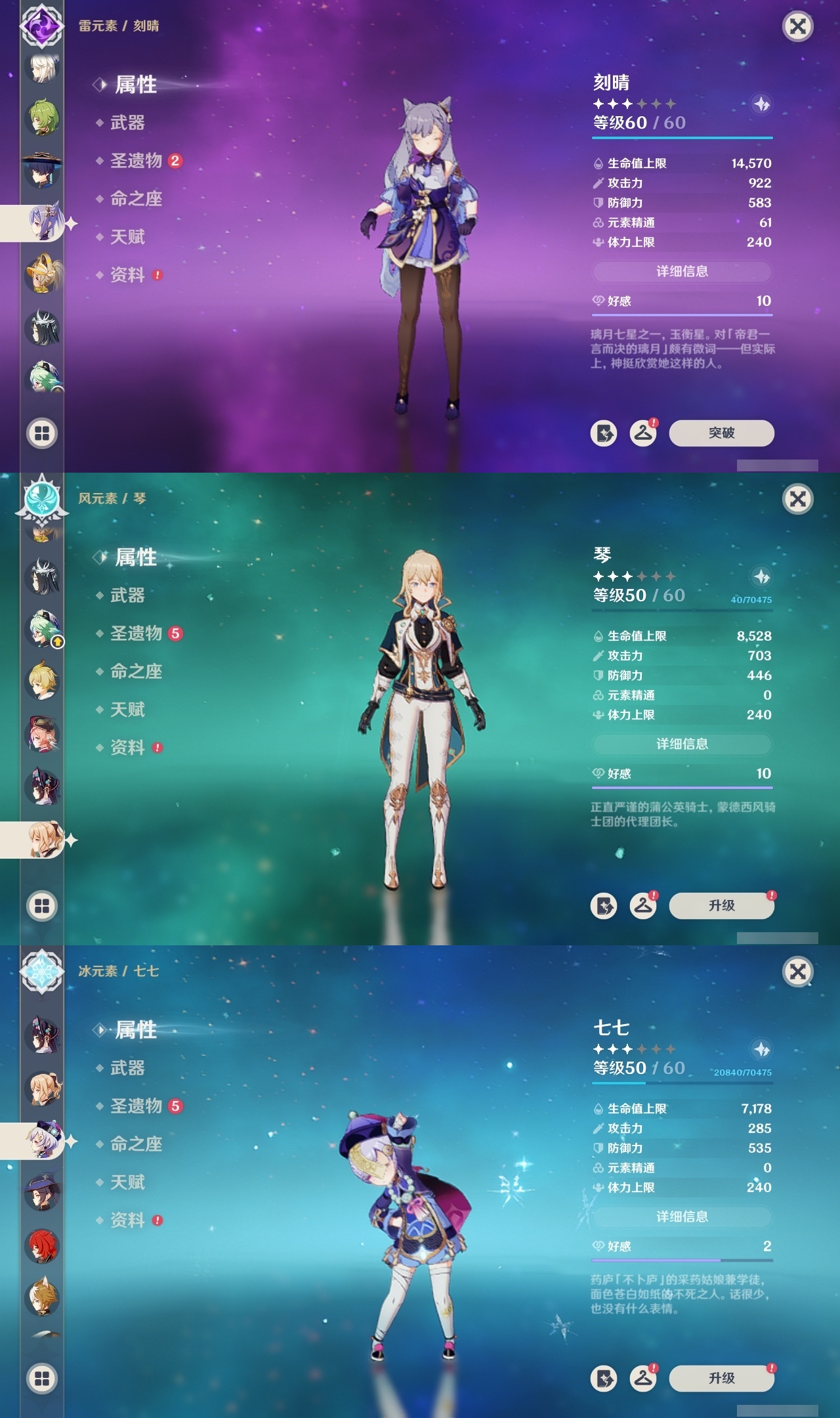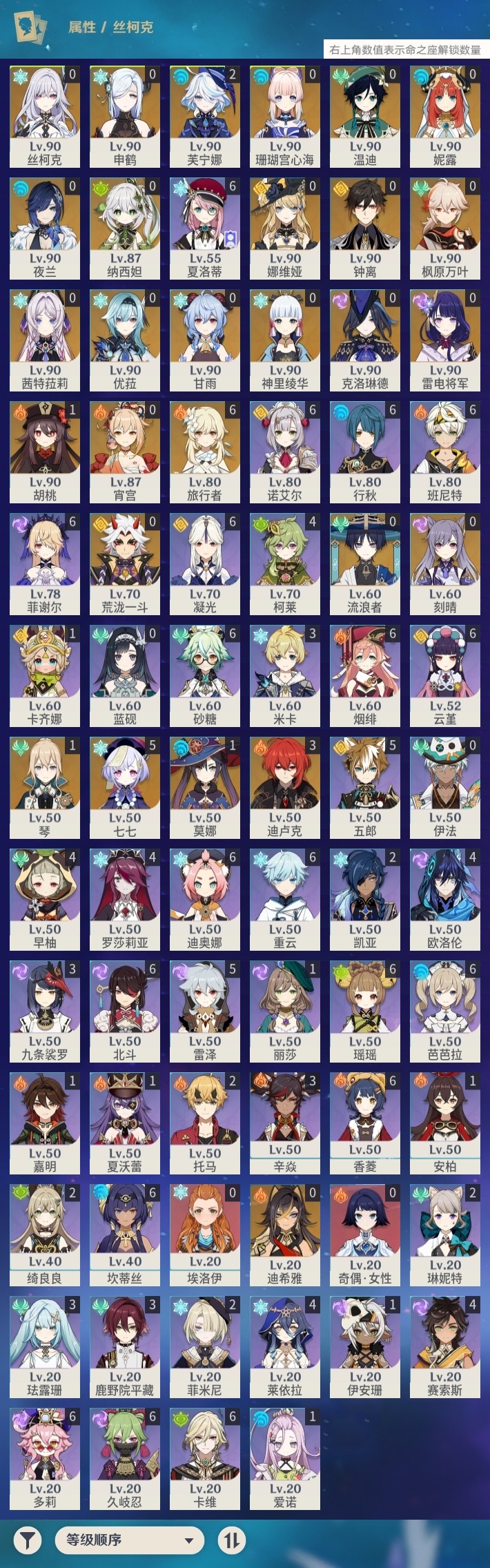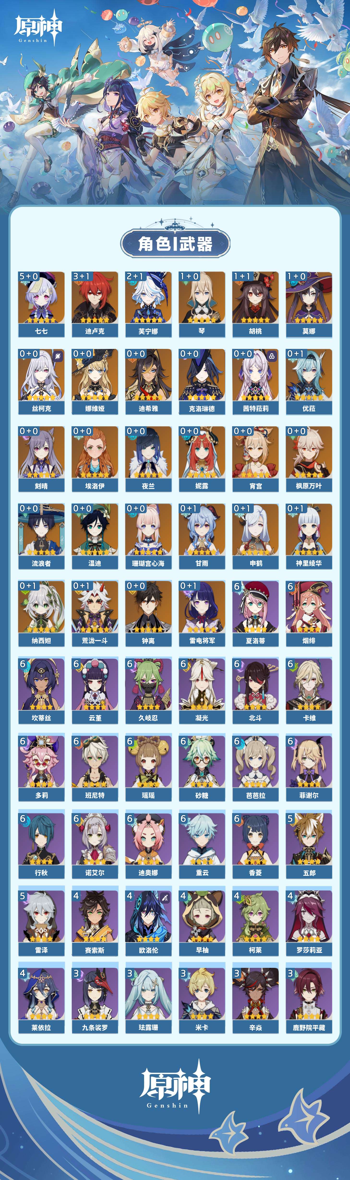 【原神】【lyys9318】冒险等级:60,五星数量:49,五星角色:七七 5命迪卢克 3命芙宁娜 2命胡桃 1命莫娜 1命琴 1命珊瑚宫心海神里绫华温迪茜特菈莉宵宫优菈迪希雅钟离荒泷一斗申鹤夜兰娜维娅丝柯克妮露纳西妲流浪者枫原万叶甘雨克洛琳德刻晴雷电将军__五星武器:风鹰剑 2精四风原典 2精天空之刃 2精柔灯挽歌静水流涌之辉裁叶萃光阿莫斯之弓和璞鸢护摩之杖狼的末路松籁响起之时天空之傲天空之脊天空之翼雾切之回光薙草之稻光赤角石溃杵息灾神乐之真意千夜浮梦__四星角色:班尼特 6命行秋 6命香菱 6命久岐忍 6命凝光 6命迪奥娜 6命砂糖 6命瑶瑶 6命坎蒂丝 6命多莉 6命卡维 6命芭芭拉 6命云堇 6命烟绯 6命重云 6命诺艾尔 6命菲谢尔 6命北斗 6命夏洛蒂 6命五郎 5命雷泽 5命莱依拉 4命柯莱 4命欧洛伦 4命早柚 4命罗莎莉亚 4命赛索斯 4命九条裟罗 3命鹿野院平藏 3命珐露珊 3命米卡 3命辛焱 3命绮良良 2命托马 2命菲米尼 2命琳妮特 2命卡齐娜 1命夏沃蕾 1命嘉明 1命伊安珊 1命爱诺 1命埃洛伊奇偶·女性蓝砚伊法