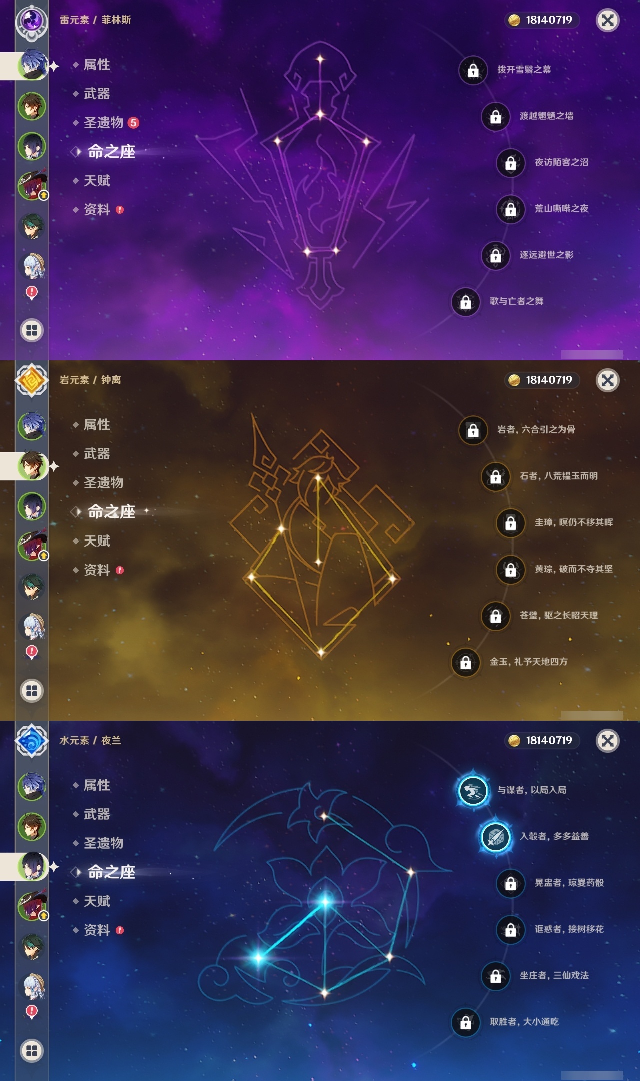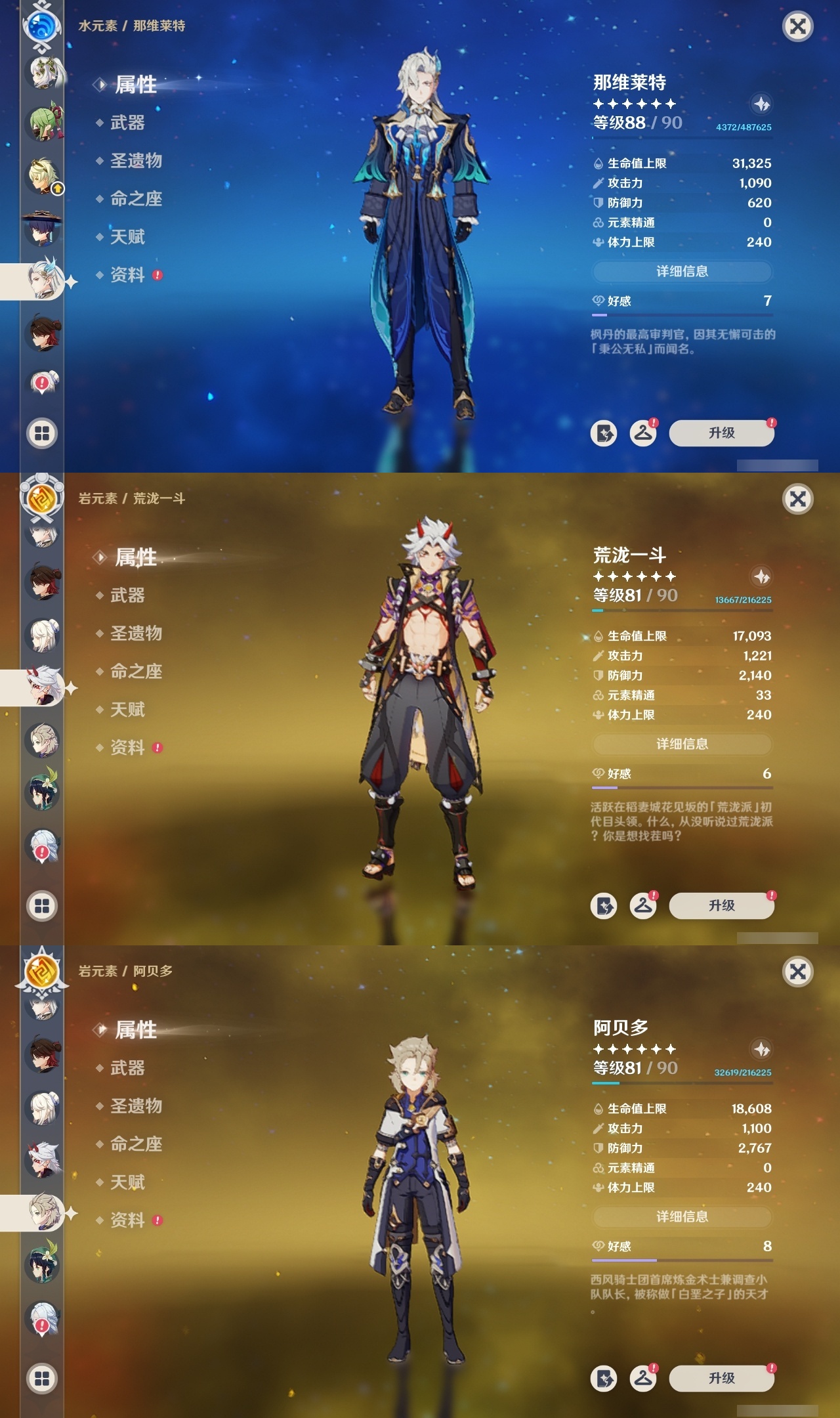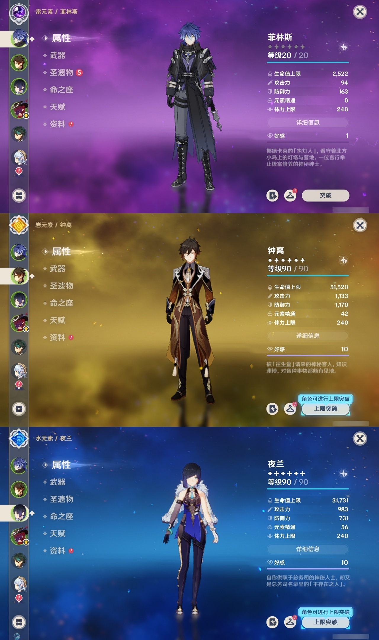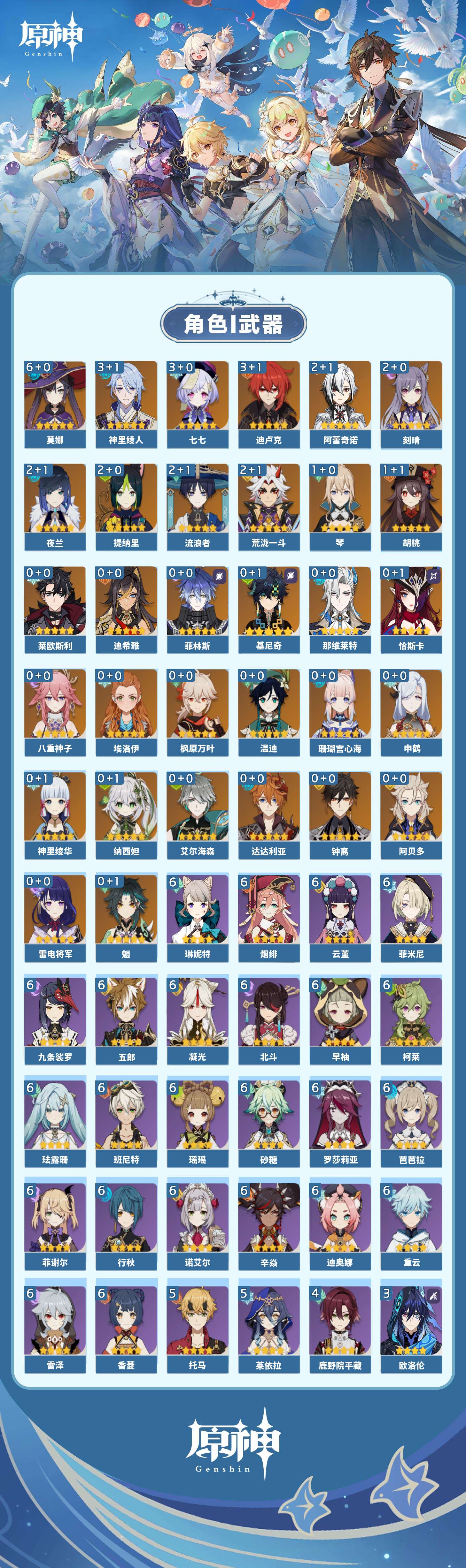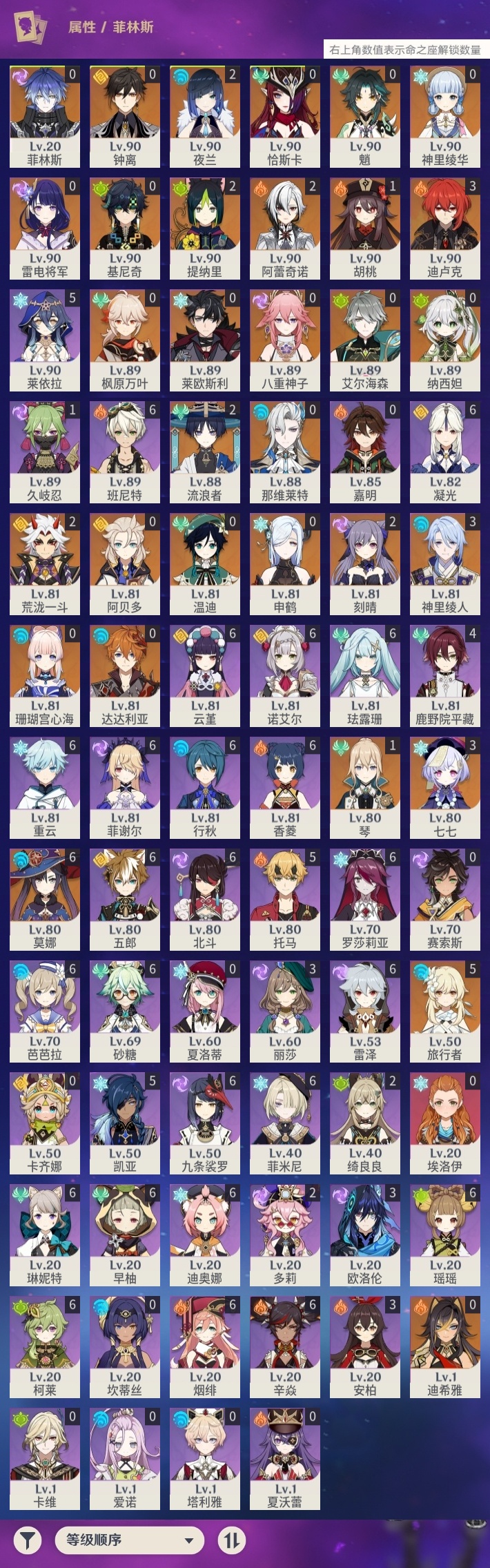 【原神】【lyys9325】冒险等级:60,五星数量:50,五星角色:莫娜 6命迪卢克 3命七七 3命神里绫人 3命阿蕾奇诺 2命刻晴 2命荒泷一斗 2命夜兰 2命提纳里 2命流浪者 2命胡桃 1命琴 1命基尼奇珊瑚宫心海神里绫华温迪恰斯卡迪希雅钟离达达利亚申鹤八重神子阿贝多那维莱特莱欧斯利纳西妲菲林斯艾尔海森枫原万叶魈雷电将军__五星武器:天空之卷 2精山王长牙星鹫赤羽赤月之形图莱杜拉的回忆风鹰剑和璞鸢护摩之杖狼的末路四风原典松籁响起之时天空之傲天空之脊雾切之回光赤角石溃杵波乱月白经津若水千夜浮梦__四星角色:班尼特 6命行秋 6命九条裟罗 6命香菱 6命珐露珊 6命凝光 6命迪奥娜 6命砂糖 6命瑶瑶 6命柯莱 6命芭芭拉 6命云堇 6命早柚 6命五郎 6命烟绯 6命重云 6命辛焱 6命诺艾尔 6命罗莎莉亚 6命雷泽 6命菲谢尔 6命北斗 6命菲米尼 6命琳妮特 6命莱依拉 5命托马 5命鹿野院平藏 4命欧洛伦 3命绮良良 2命多莉 2命久岐忍 1命埃洛伊卡齐娜坎蒂丝卡维夏洛蒂夏沃蕾嘉明塔利雅爱诺赛索斯