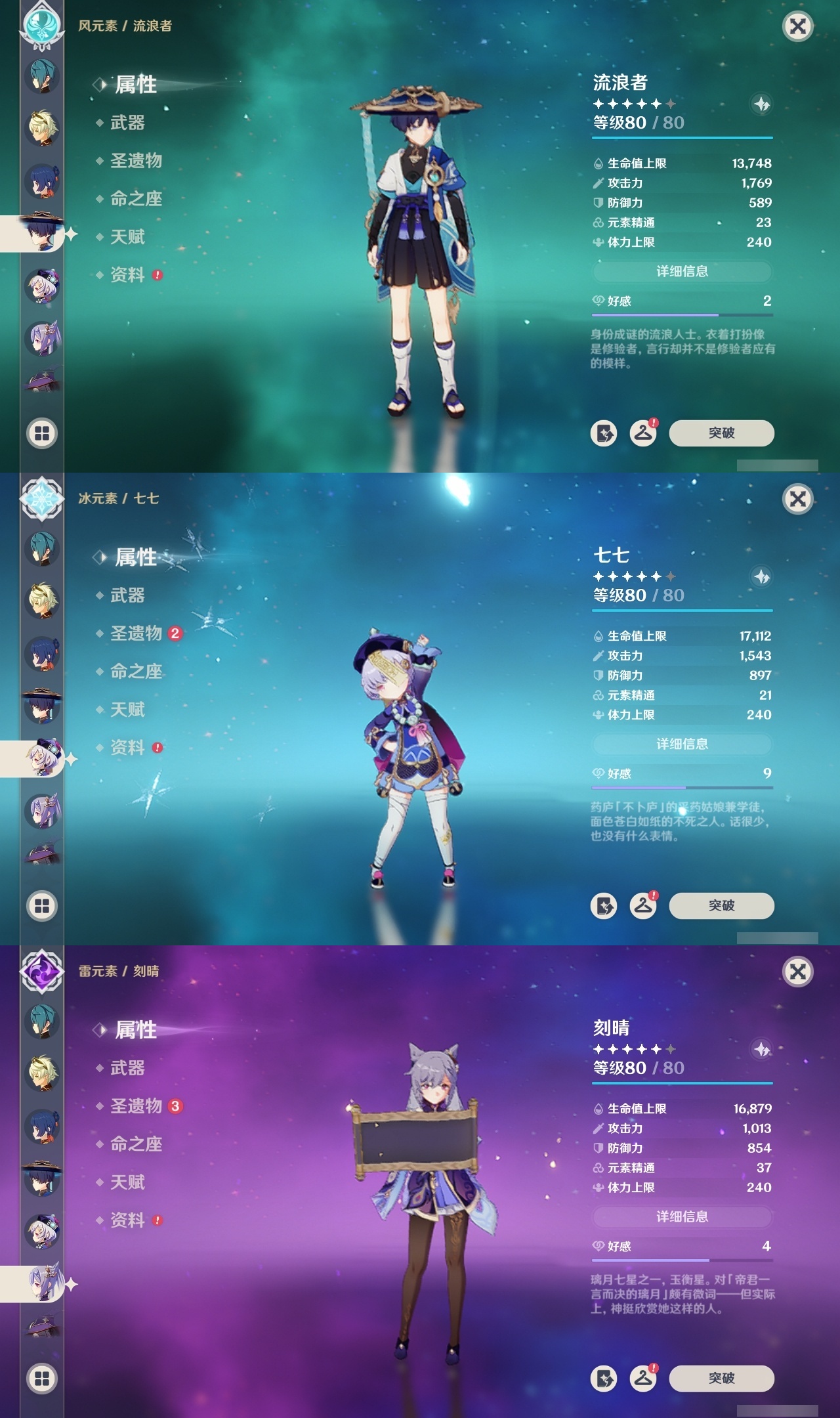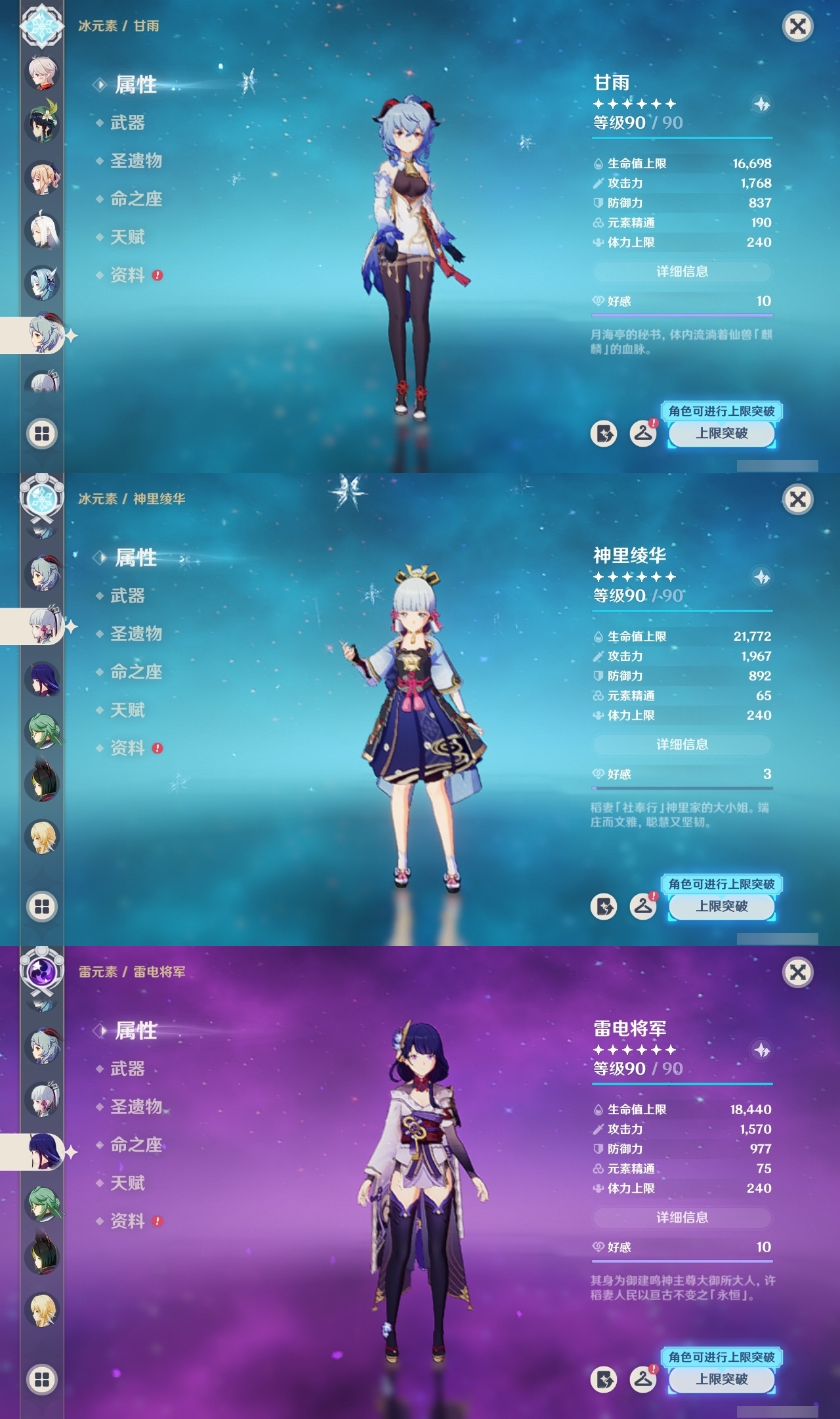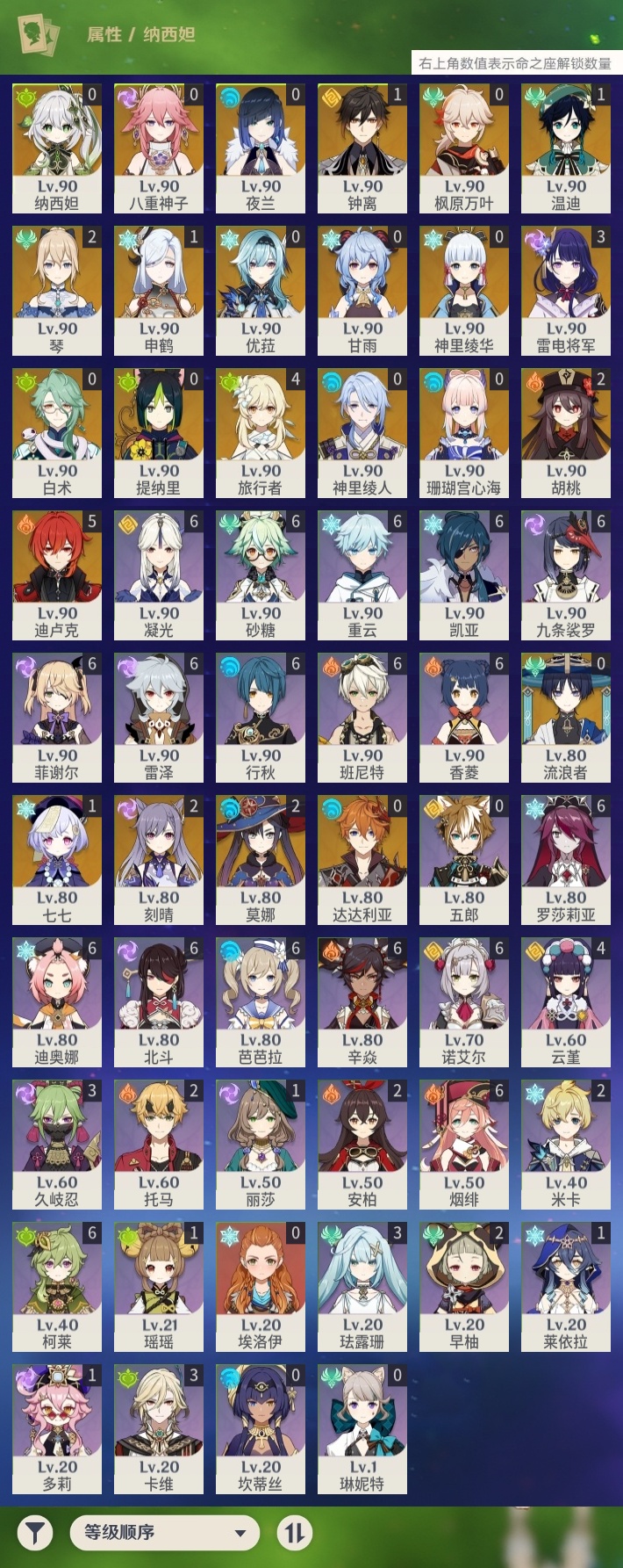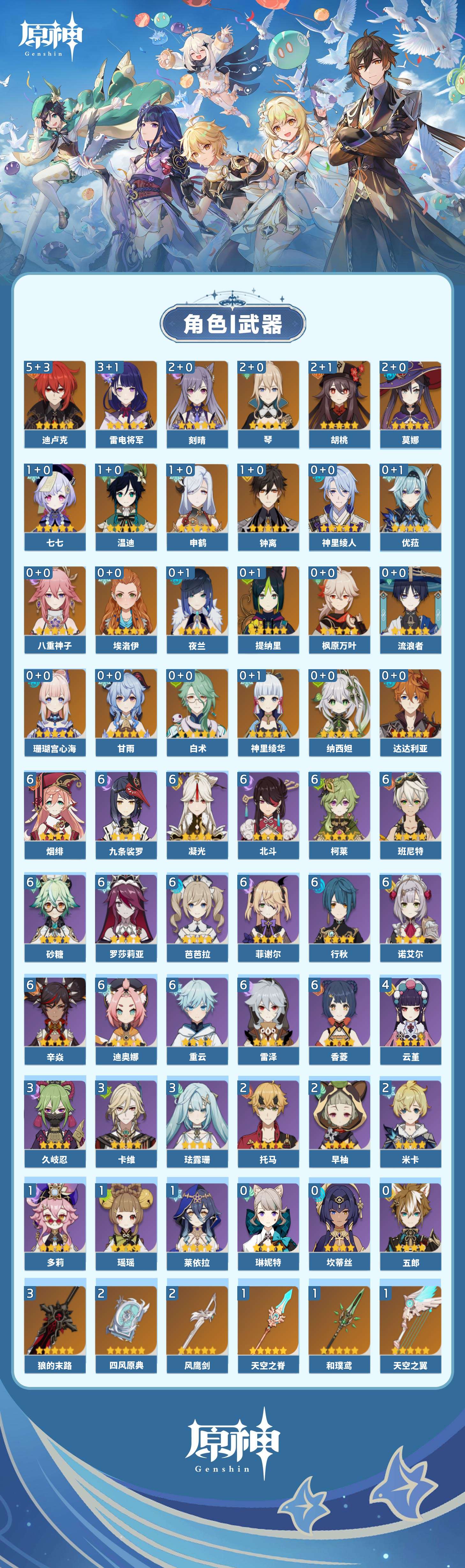 【原神】【lyys9320】冒险等级:60,五星数量:37,五星角色:迪卢克 5命雷电将军 3命胡桃 2命刻晴 2命莫娜 2命琴 2命七七 1命温迪 1命钟离 1命申鹤 1命珊瑚宫心海白术神里绫华优菈达达利亚八重神子神里绫人夜兰提纳里纳西妲流浪者枫原万叶甘雨__五星武器:狼的末路 3精风鹰剑 2精四风原典 2精和璞鸢护摩之杖松籁响起之时天空之脊天空之翼无工之剑雾切之回光薙草之稻光若水猎人之径__四星角色:班尼特 6命行秋 6命九条裟罗 6命香菱 6命凝光 6命迪奥娜 6命砂糖 6命柯莱 6命芭芭拉 6命烟绯 6命重云 6命辛焱 6命诺艾尔 6命罗莎莉亚 6命雷泽 6命菲谢尔 6命北斗 6命云堇 4命久岐忍 3命珐露珊 3命卡维 3命米卡 2命早柚 2命托马 2命瑶瑶 1命莱依拉 1命多莉 1命埃洛伊坎蒂丝五郎琳妮特