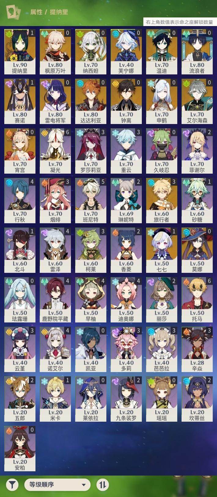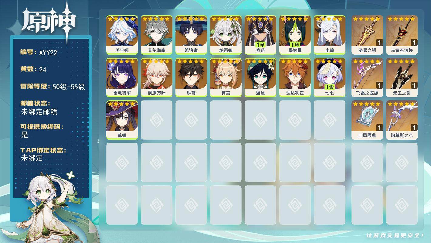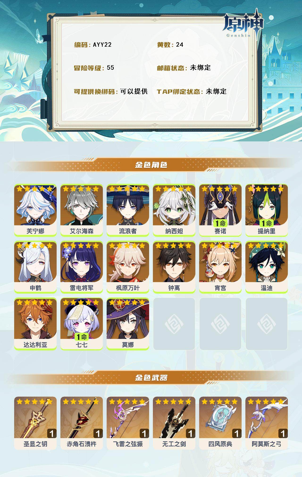 [14649779]55级/24黄/男主/15个五星角色/6个五星武器 0命芙宁娜0命艾尔海森0命流浪者0命纳西妲1命赛诺1命提纳里0命申鹤0命雷电将军0命枫原万叶0命钟离0命宵宫0命温迪0命达达利亚1命七七0命莫娜精1圣显之钥精1赤角石溃杵精1飞雷之弦振精1无工之剑精1四风原典精1阿莫斯之弓