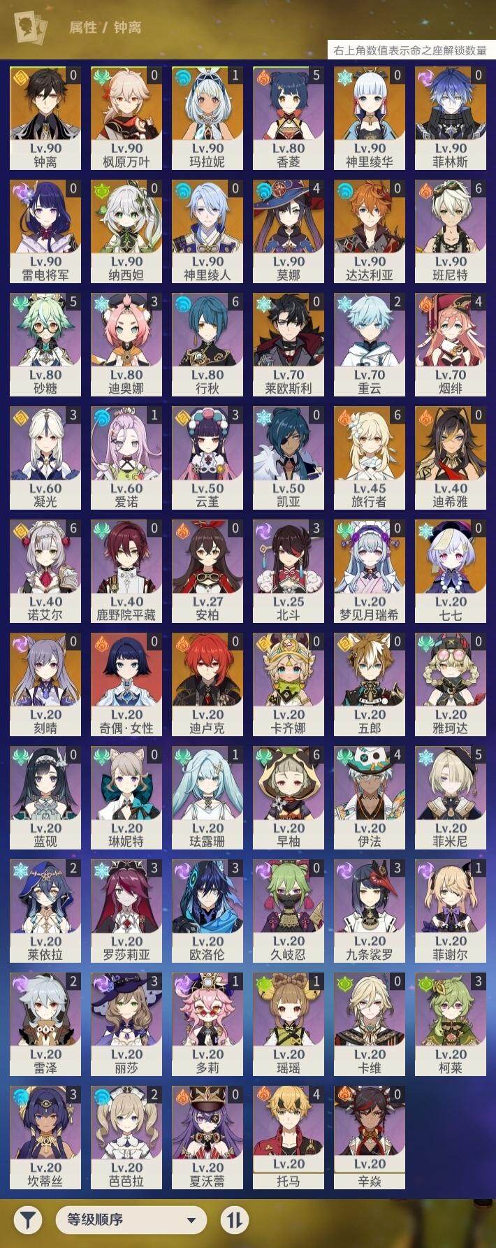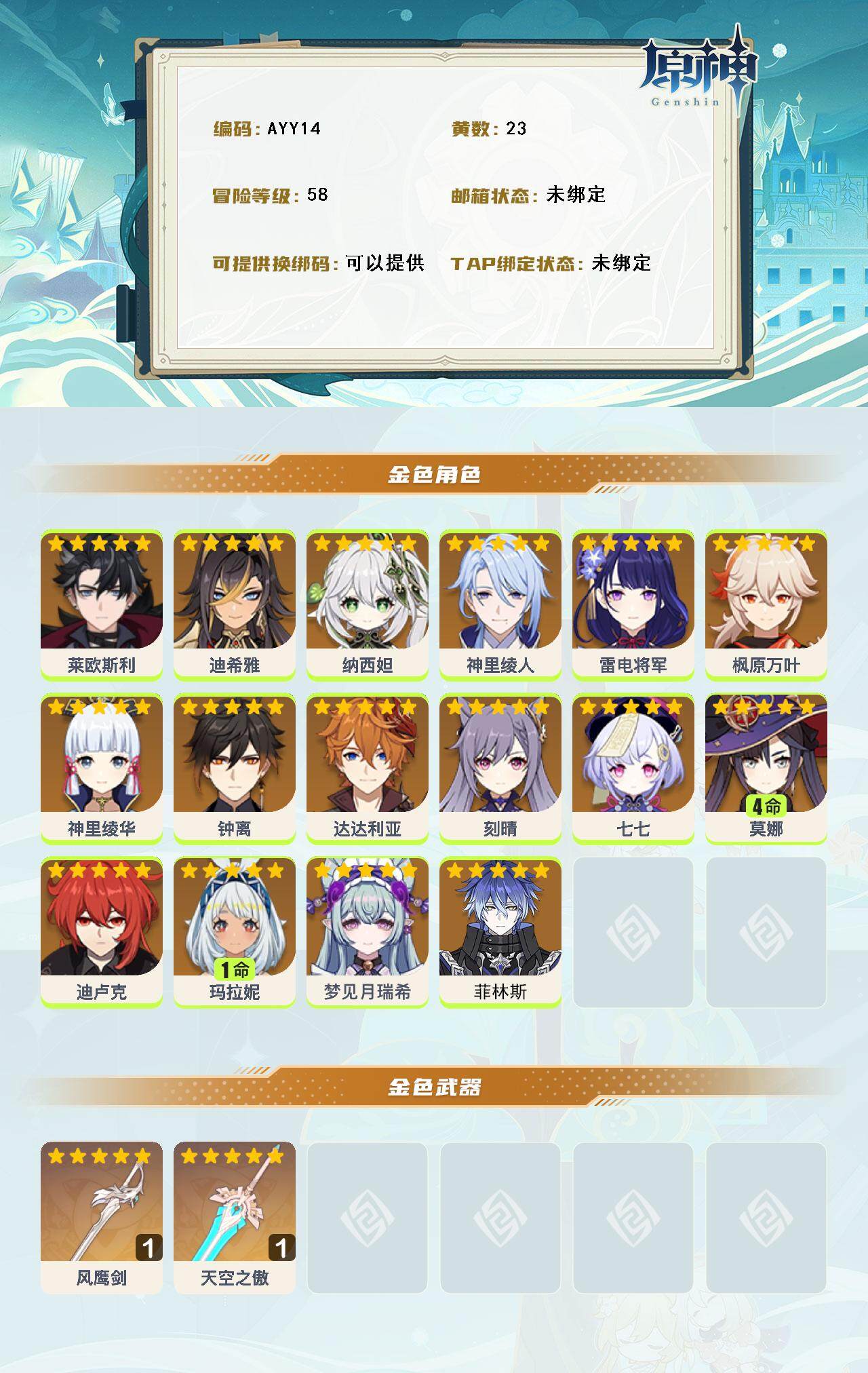 [14649798]58级/23黄/女主/16个五星角色/2个五星武器 0命莱欧斯利0命迪希雅0命纳西妲0命神里绫人0命雷电将军0命枫原万叶0命神里绫华0命钟离0命达达利亚0命刻晴0命七七4命莫娜0命迪卢克1命玛拉妮0命梦见月瑞希0命菲林斯精1风鹰剑精1天空之傲