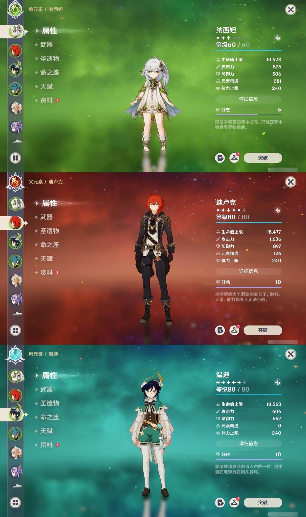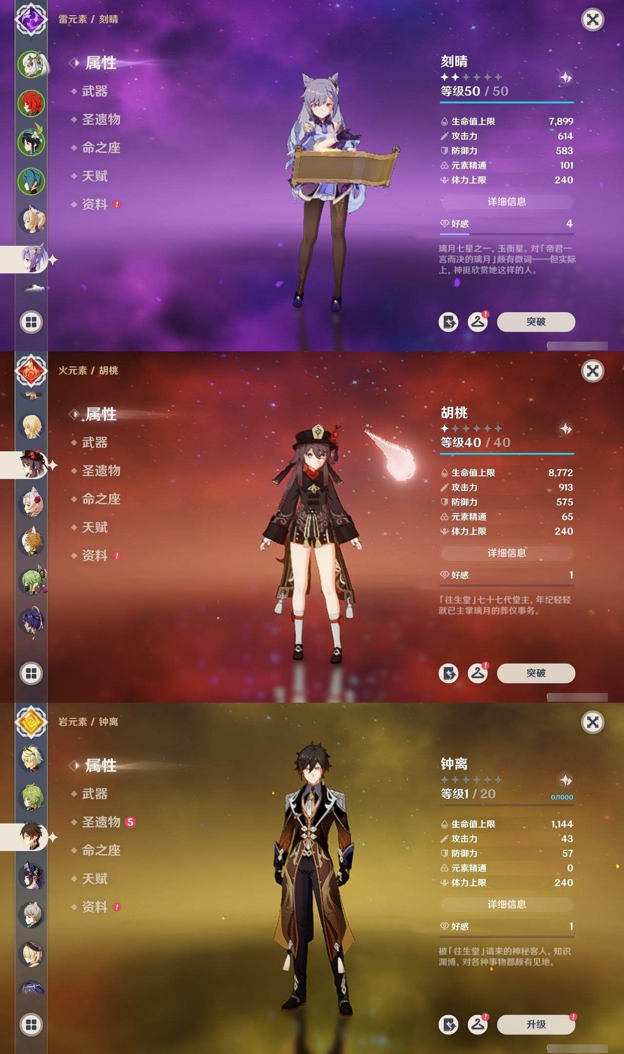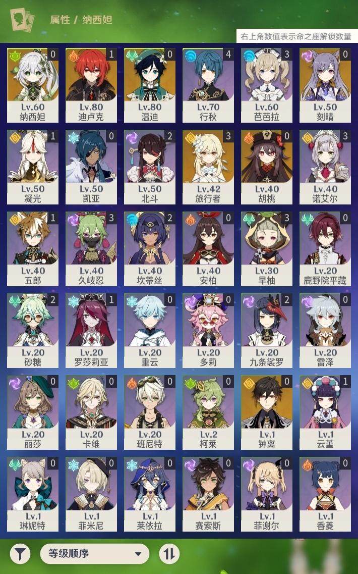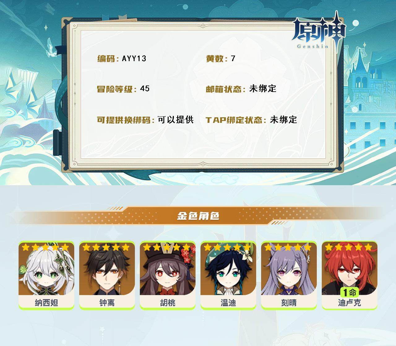 [14649803]45级/7黄/女主/6个五星角色 0命纳西妲0命钟离0命胡桃0命温迪0命刻晴1命迪卢克