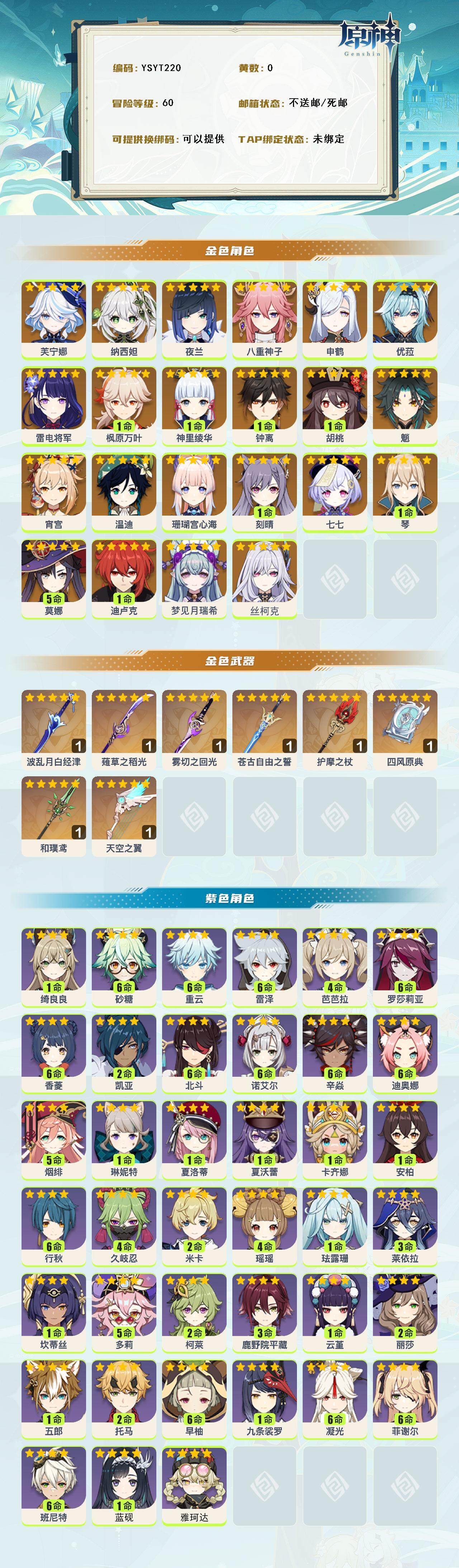 【ysyt220】60级/男主/24个五星角色/0命丝柯克/0命梦见月瑞希/0命芙宁娜/0命纳西妲/0命夜兰/0命八重神子/0命申鹤/0命珊瑚宫心海/0命雷电将军/0命宵宫/1命神里绫华/1命枫原万叶/0命优菈/1命胡桃/0命魈/1命钟离/0命温迪/1命琴/1命刻晴/1命迪卢克/5命莫娜/0命七七/精1波乱月白经津/精1薙草之稻光/精1雾切之回光/精1苍古自由之誓/精1护摩之杖/精1和璞鸢/精1四风原典/精1天空之翼/0命雅珂达/1命蓝砚/0命卡齐娜/0命夏沃蕾/1命夏洛蒂/0命琳妮特/1命绮良良/2命米卡/4命瑶瑶/1命珐露珊/3命莱依拉/0命坎蒂丝/5命多莉/2命柯莱/3命鹿野院平藏/4命久岐忍/0命云堇/1命五郎/2命托马/1命九条裟罗/满命早柚/5命烟绯/满命罗莎莉亚/满命辛焱/满命迪奥娜/满命砂糖/满命雷泽/满命菲谢尔/2命丽莎/满命北斗/满命香菱/1命安柏/满命班尼特/满命行秋/4命芭芭拉/满命凝光/满命诺艾尔/2命凯亚/满命重云