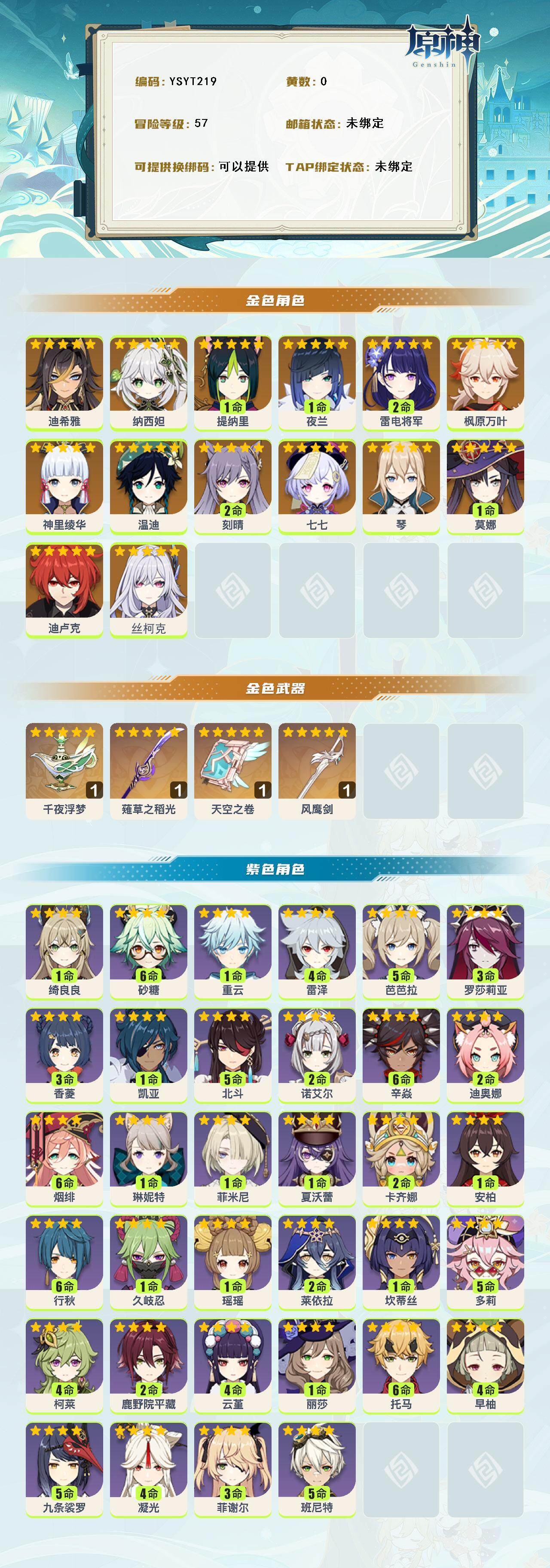 【ysyt219】57级/女主/15个五星角色/0命丝柯克/0命迪希雅/0命纳西妲/1命提纳里/1命夜兰/2命雷电将军/0命神里绫华/0命枫原万叶/0命温迪/0命琴/2命刻晴/0命迪卢克/1命莫娜/0命七七/精1千夜浮梦/精1薙草之稻光/精1天空之卷/精1风鹰剑/2命卡齐娜/1命夏沃蕾/0命菲米尼/1命琳妮特/1命绮良良/0命瑶瑶/2命莱依拉/0命坎蒂丝/5命多莉/4命柯莱/2命鹿野院平藏/1命久岐忍/4命云堇/满命托马/5命九条裟罗/4命早柚/满命烟绯/3命罗莎莉亚/满命辛焱/2命迪奥娜/满命砂糖/4命雷泽/3命菲谢尔/1命丽莎/5命北斗/3命香菱/1命安柏/5命班尼特/满命行秋/5命芭芭拉/4命凝光/2命诺艾尔/1命凯亚/1命重云