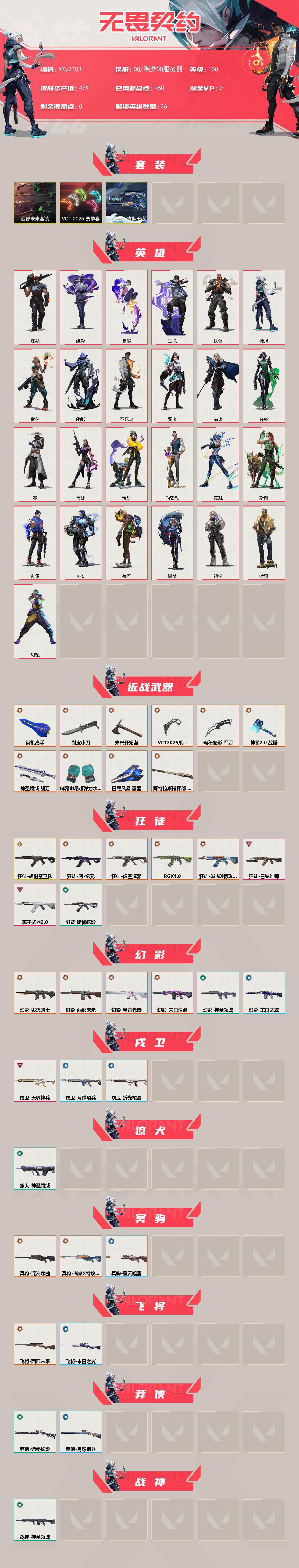 【4.7w库存vct爪刀.西部套.水呛套.电玩拳套.剥皮小刀七狂徒超时空.创纪元.虚空.虚空.狮子.离子.毁灭骑士.光谱.末日泡泡】y2703【无二次】【因赛季更新游戏段付以上号为准!】 【套装】:滋滋x特攻队套装,vct 2025 赛季套装,西部未来套装 【英雄】:幻棱,炼狱,维斯,暮蝶,钛狐,壹决,铁臂,捷风,雷兹,幽影,不死鸟,贤者,猎枭,蝰蛇,零,芮娜,奇乐,尚勃勒,霓虹,斯凯,夜