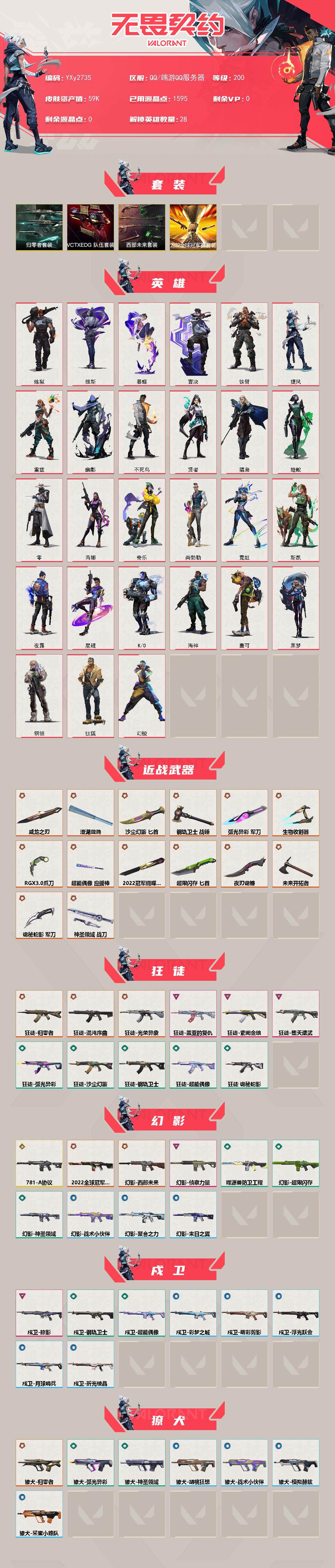 【5.9w库存22冠军套.西部套.显卡爪刀.古神镰刀.六狂徒归零者.混沌.光荣异象.盖亚.紫金.弃王.781协议.侦查】y2735【无二次】【因赛季更新游戏段付以上号为准!】 【套装】:2022全球冠军赛套装,西部未来套装,归零者套装,vctxedg 队伍套装 【英雄】:幻棱,炼狱,维斯,暮蝶,钛狐,壹决,铁臂,捷风,雷兹,幽影,不死鸟,贤者,猎枭,蝰蛇,零,芮娜,奇乐,尚勃勒,霓虹,斯凯