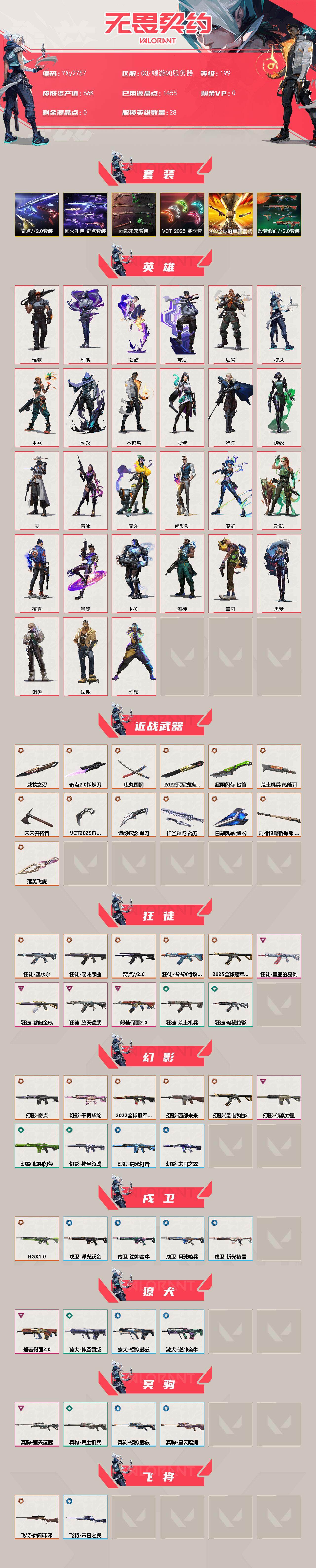【6.6w库存22冠军套.vct爪刀.西部套.恶鬼套.落英飞旋.奇点蝴蝶刀.九狂徒六幻影】y2757【无二次】【因赛季更新游戏段付以上号为准!】 【套装】:2022全球冠军赛套装,vct 2025 赛季套装,西部未来套装,奇点//2.0套装,回火礼包:奇点套装,般若假面//2.0套装 【英雄】:幻棱,炼狱,维斯,暮蝶,钛狐,壹决,铁臂,捷风,雷兹,幽影,不死鸟,贤者,猎枭,蝰蛇,零,芮娜,