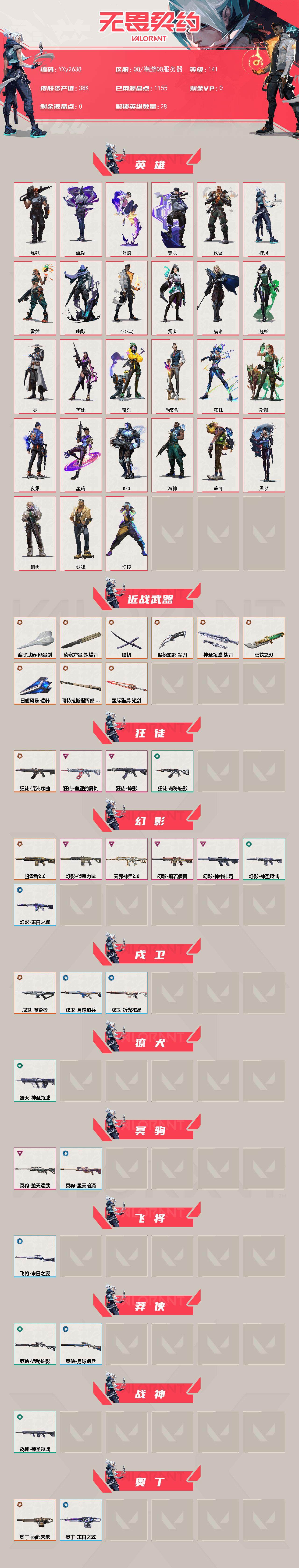 【3.8w库存镭切.五周年.混沌.盖亚.掠夺.侦查.天界.恶鬼.神中神】y2638【无二次】【因赛季更新游戏段付以上号为准!】 【英雄】:幻棱,炼狱,维斯,暮蝶,钛狐,壹决,铁臂,捷风,雷兹,幽影,不死鸟,贤者,猎枭,蝰蛇,零,芮娜,奇乐,尚勃勒,霓虹,斯凯,夜露,星礈,k/o,海神,盖可,黑梦,钢锁 【近战 武器】:近战武器-5周年//公测重制版 苍龙之刃,近战武器-侦察力量 蝴蝶刀,近