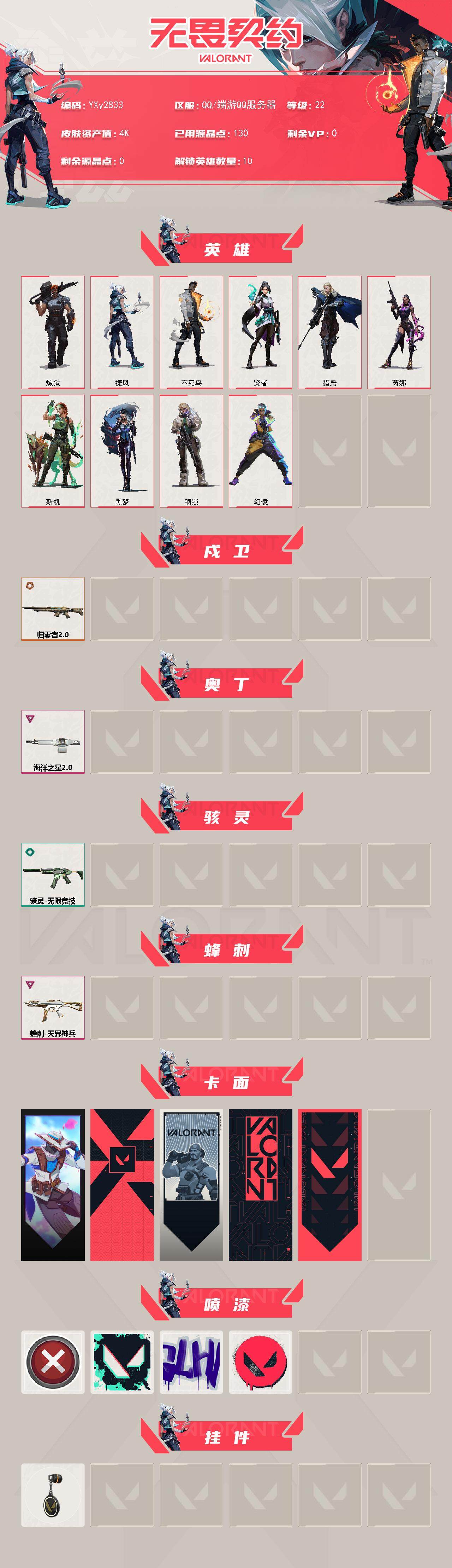 【英雄】:幻棱,炼狱,捷风,不死鸟,贤者,猎枭,芮娜,斯凯,黑梦,钢锁 【戍卫】:戍卫-归零者//2.0 【奥丁】:奥丁-海洋之星//2.0 【骇灵】:骇灵-无限竞技 【蜂刺】:蜂刺-天界神兵 【卡面】:无畏契约go!第一卷:零 卡面,代号红色 卡面,新兵报到 卡面,v契约 卡面,无畏契约 卡面 【喷漆】:买装还是存钱 喷漆,胜利属于无畏契约 喷漆,glhf 喷漆,无畏契约 喷漆 【挂饰】:无