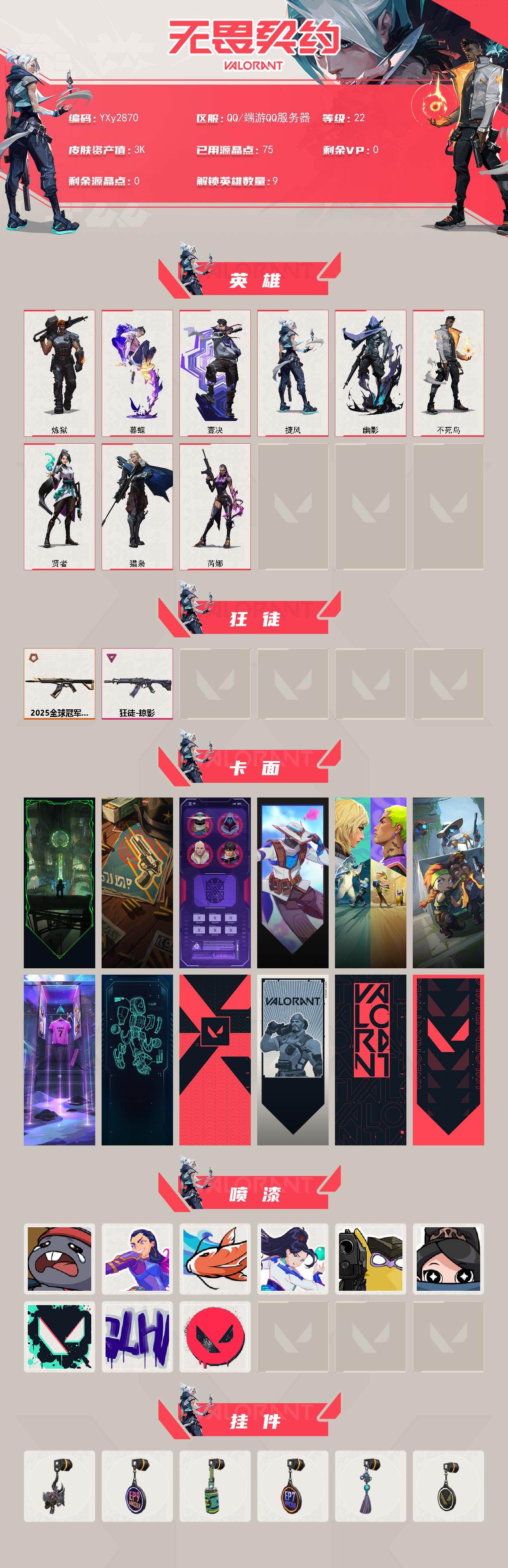【英雄】:炼狱,暮蝶,壹决,捷风,幽影,不死鸟,贤者,猎枭,芮娜 【狂徒】:狂徒-2025全球冠军赛,狂徒-掠影 【卡面】:欢迎来到底城 卡面,正义的化身 卡面,清除名单 卡面,无畏契约go!第一卷:零 卡面,钢锁vs盖可 卡面,别冒尖 卡面,"luie" 卡面,铁臂设计图 卡面,代号红色 卡面,新兵报到 卡面,v契约 卡面,无畏契约 卡面 【喷漆】:熊抱 喷漆,无畏契约go!第一卷:芮娜 喷