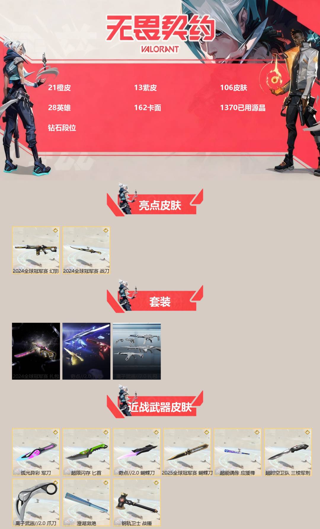[14265266]21橙皮 13紫皮 106皮肤 28英雄 162卡面 1370已用源晶 钻石段位 【亮点皮肤】:幻影-2024全球冠军赛战刀-2024全球冠军赛 【套装】:奇点//2.0套装离子武器2.02024全球冠军赛套装 【近战武器皮肤】:匕首-超限闪存战锤-钢轨卫士蝴蝶刀-奇