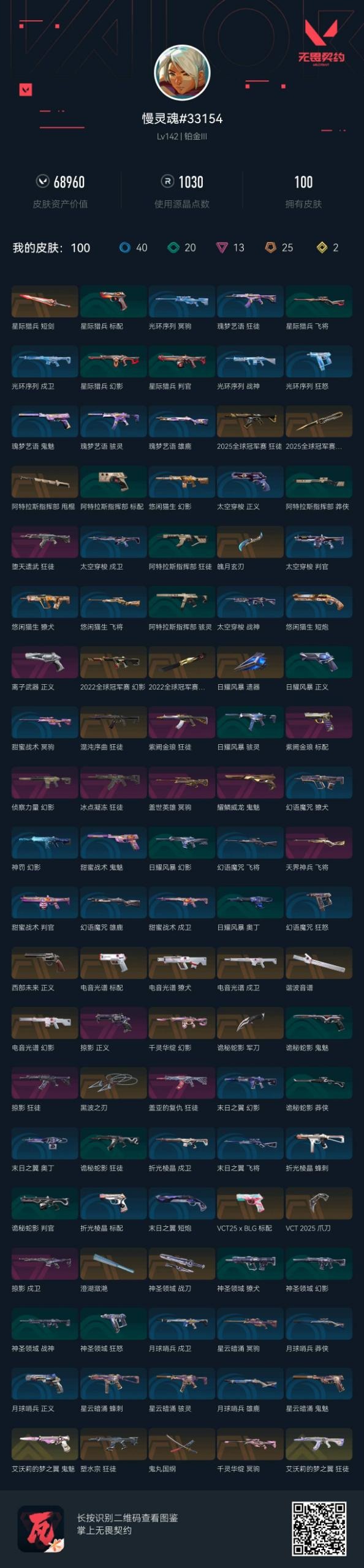 [14281351]25橙皮 2金皮 13紫皮 100皮肤 20英雄 109卡面 1030已用源晶 铂金段位 【亮点皮肤】:幻影-2022全球冠军赛蝴蝶刀-2022全球冠军赛 【套装】:电音光谱2025全球冠军赛2022全球冠军赛vct 2025赛季礼包vcn2025套装 【近战武器