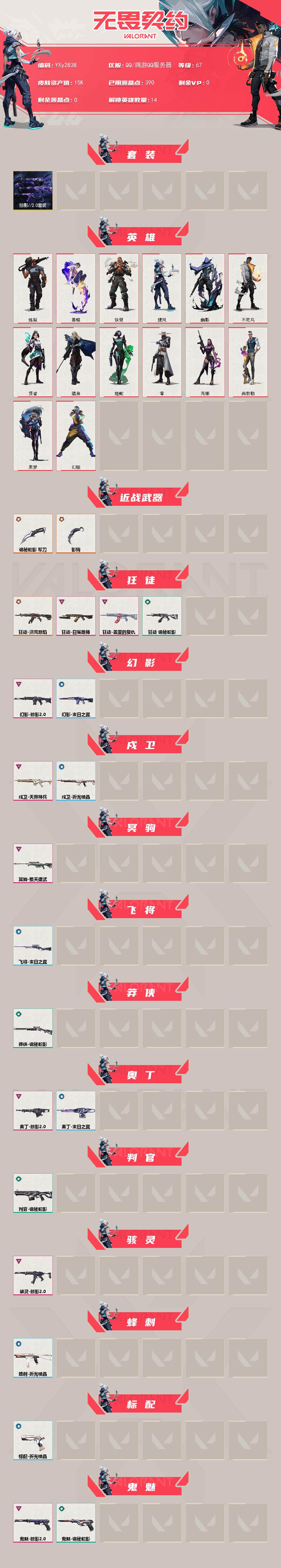 【1.5w库存掠夺2.0套装.流脓.狮子.盖亚.天界戍卫.弃王狙】y2838【无二次】【因赛季更新游戏段付以上号为准!】 【套装】:掠影//2.0套装 【英雄】:幻棱,炼狱,暮蝶,铁臂,捷风,幽影,不死鸟,贤者,猎枭,蝰蛇,零,芮娜,尚勃勒,黑梦 【近战 武器】:近战武器-影钩,近战武器-诡秘蛇影 军刀 【狂徒】:狂徒-洪荒怒焰,狂徒-盖亚的复仇,狂徒-日冕雄师,狂徒-诡秘蛇影 【幻影】: