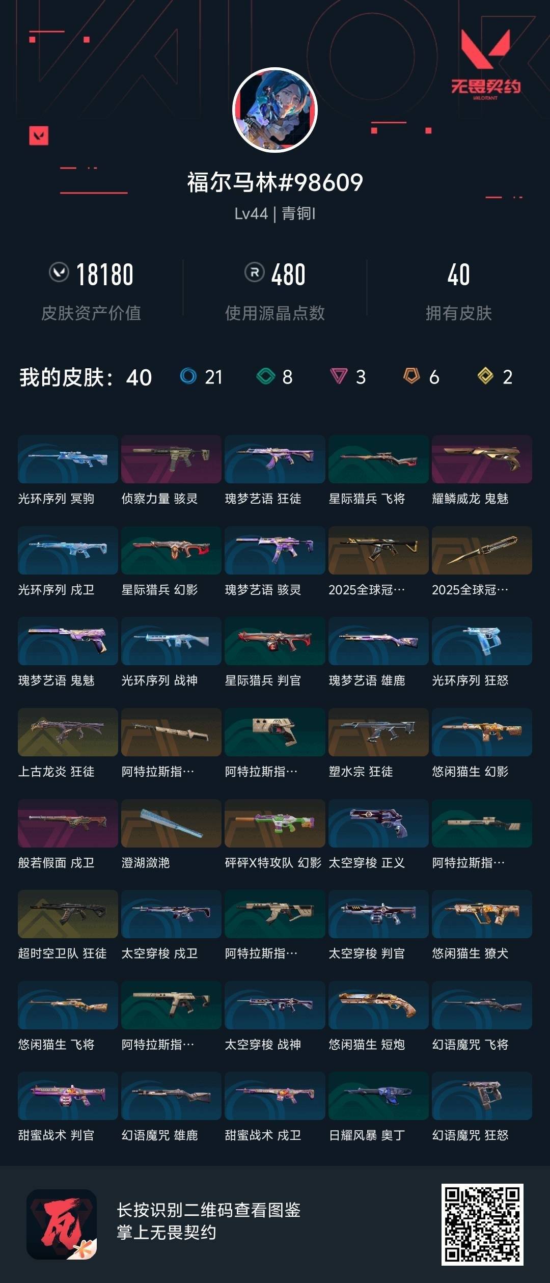 [14292503]6橙皮 2金皮 3紫皮 40皮肤 16英雄 46卡面 480已用源晶 青铜段位 【套装】:2025全球冠军赛 【近战武器皮肤】:阿特拉斯指挥部2025全球冠军赛 蝴蝶刀澄湖潋滟 【佩呛皮肤】:鬼魅-耀鳞威龙 【冲锋呛皮肤】:骇灵-侦察力量 【步呛皮肤】:狂徒-上古龙炎20