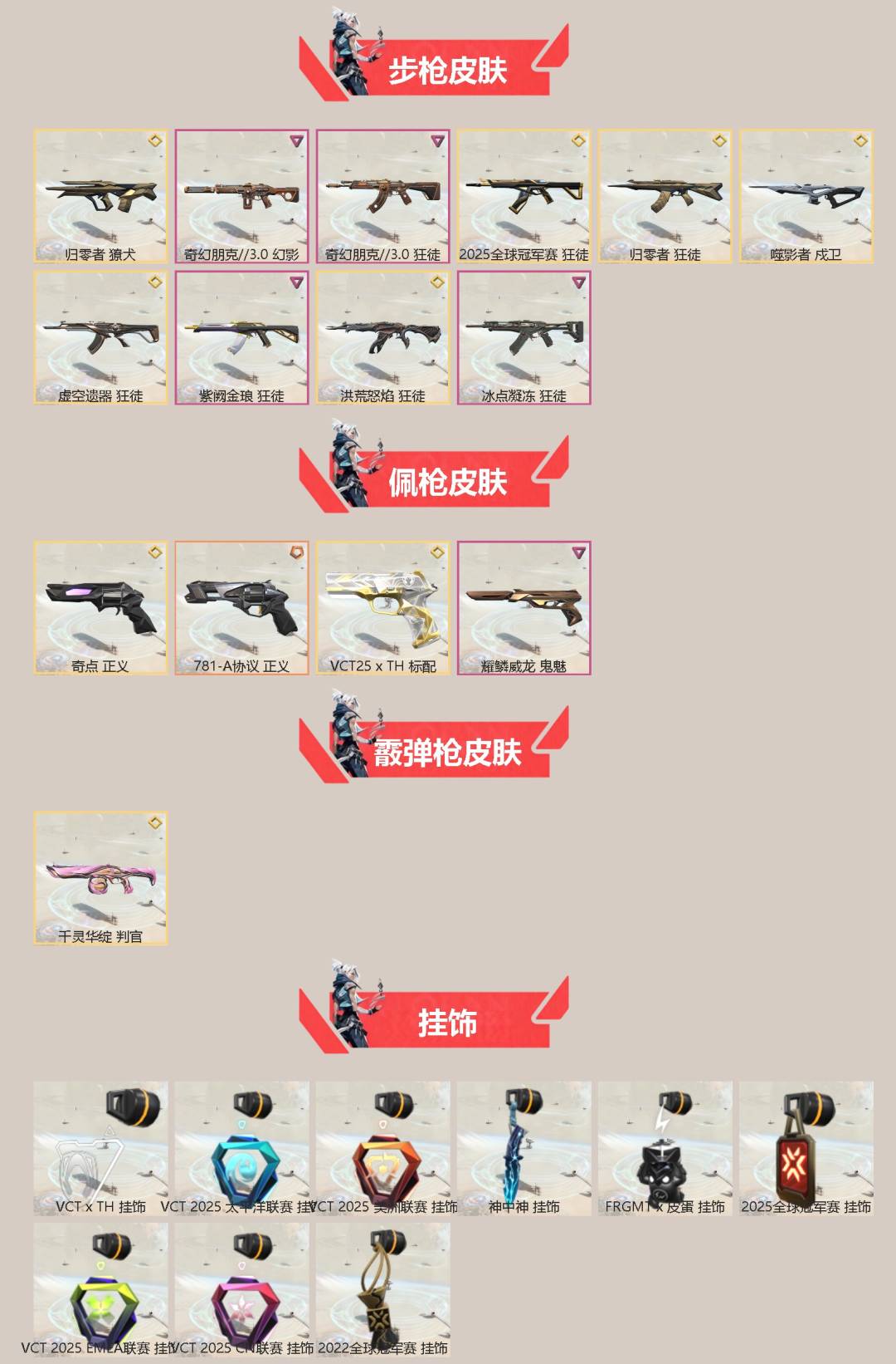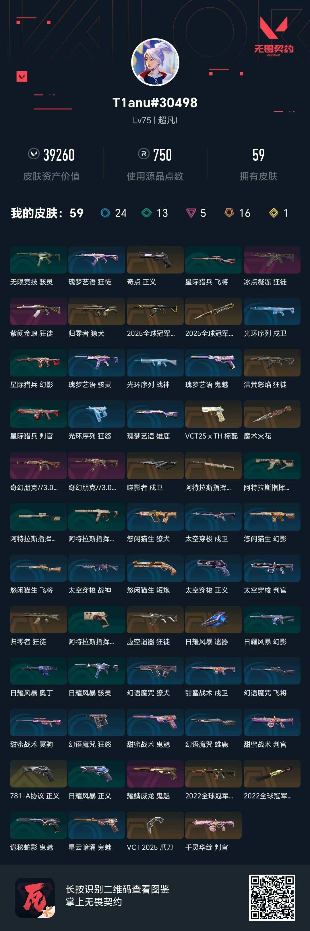 [14292644]16橙皮 1金皮 5紫皮 59皮肤 16英雄 83卡面 750已用源晶 超凡段位 【亮点皮肤】:幻影-2022全球冠军赛蝴蝶刀-2022全球冠军赛 【套装】:2025全球冠军赛2022全球冠军赛vct 2025赛季礼包vcn2025套装 【近战武器皮肤】:阿特拉斯指