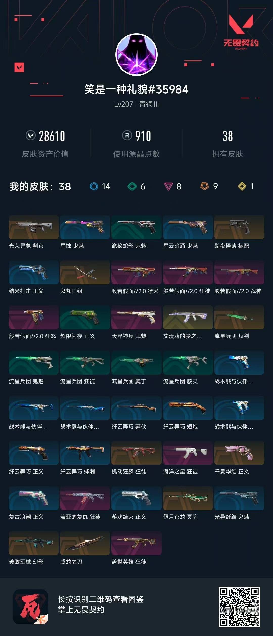 [14292768]9橙皮 1金皮 8紫皮 38皮肤 28英雄 110卡面 910已用源晶 青铜段位 【套装】:般若假面//2.0套装 【近战武器皮肤】:短剑-流星兵团鬼丸国纲威龙之刃 【佩呛皮肤】:标配-黯夜怪谈狂怒-般若假面//2.0正义-千灵华绽鬼魅-天界神兵 【霰弹呛皮肤】:判官