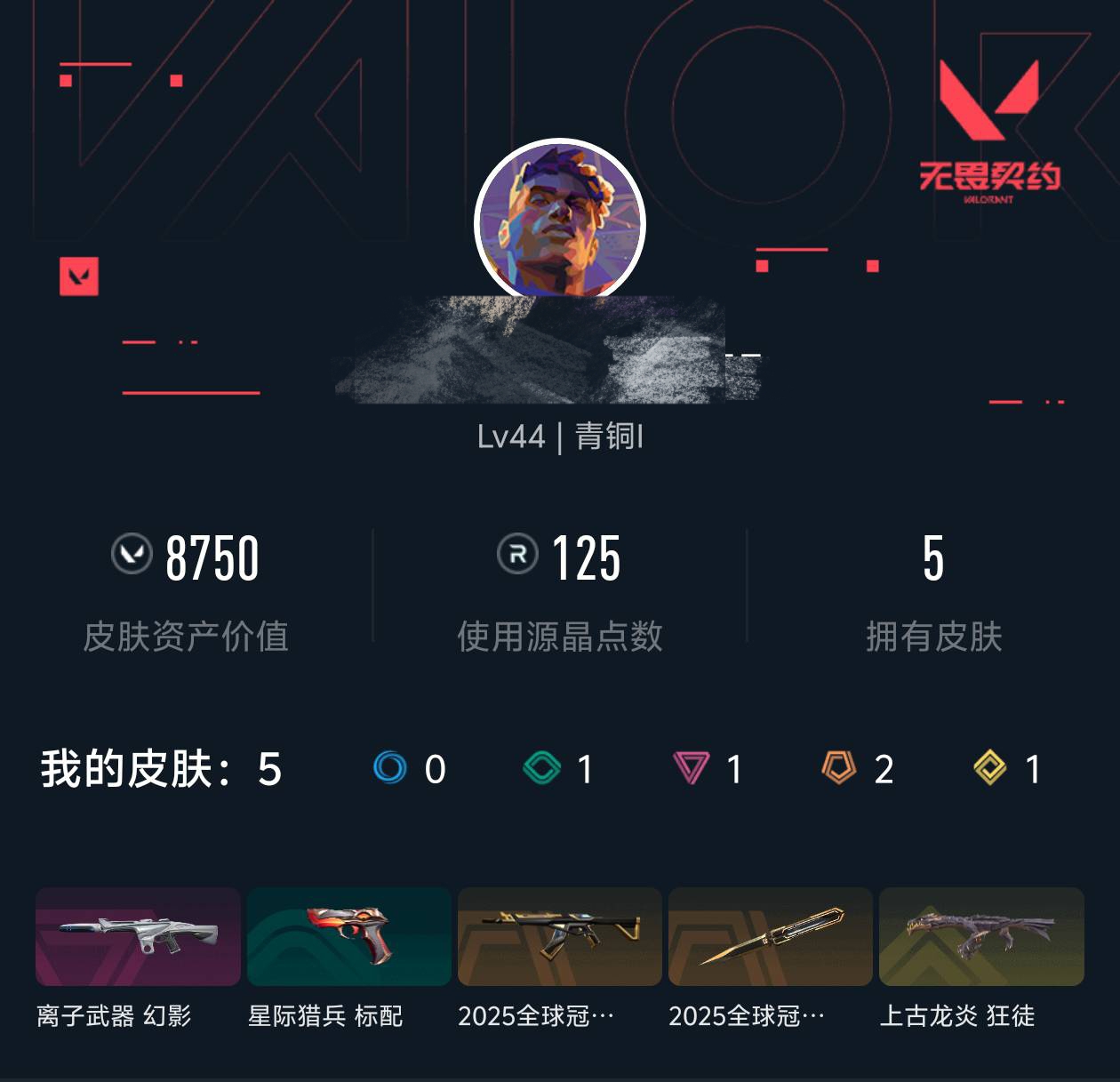 【18英雄 5皮肤 资产8750 25冠军套 离子幻影】【游戏等级】lv44 【段位】 青铜i 【r点】125 【皮肤总价值】8750 【英雄数量】18 【皮肤数量】5 【挂饰数量】18 【卡面数量】29 【喷漆数量】15 【幻影】幻影-离子武器 【标配】标配-星际猎兵 【狂徒】狂徒-2025全球冠军赛 狂徒-上古龙炎 【近战武器】近战武器-2025全球冠军赛蝴蝶刀 "