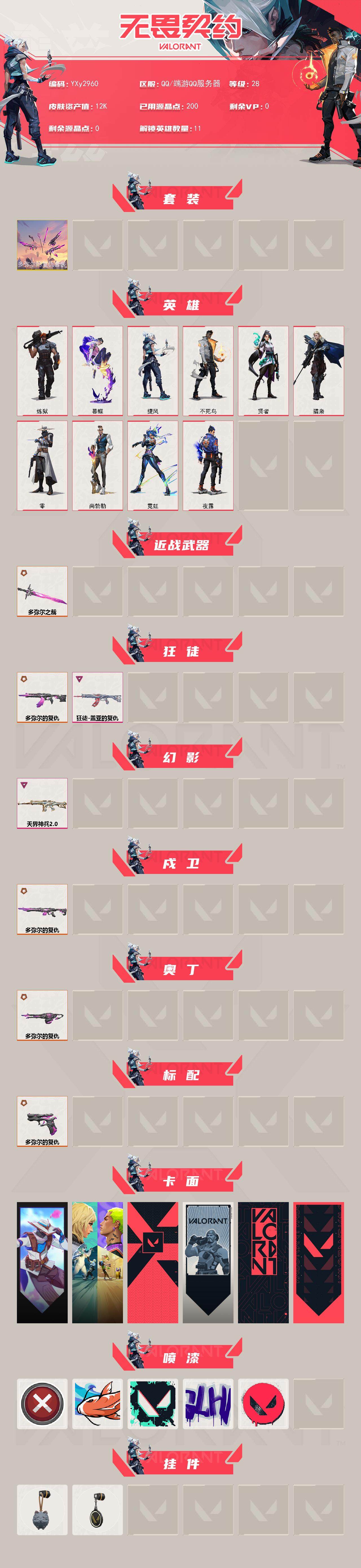 【1.2w库存多弥尔全套.盖亚.天界2.0】y2960【无二次】【因赛季更新游戏段付以上号为准!】 【套装】:多弥尔的复仇套装 【英雄】:炼狱,暮蝶,捷风,不死鸟,贤者,猎枭,零,尚勃勒,霓虹,夜露 【近战 武器】:近战武器-多弥尔之裁 【狂徒】:狂徒-多弥尔的复仇,狂徒-盖亚的复仇 【幻影】:幻影-天界神兵//2.0 【戍卫】:戍卫-多弥尔的复仇 【奥丁】:奥丁-多弥尔的复仇 【标配】:
