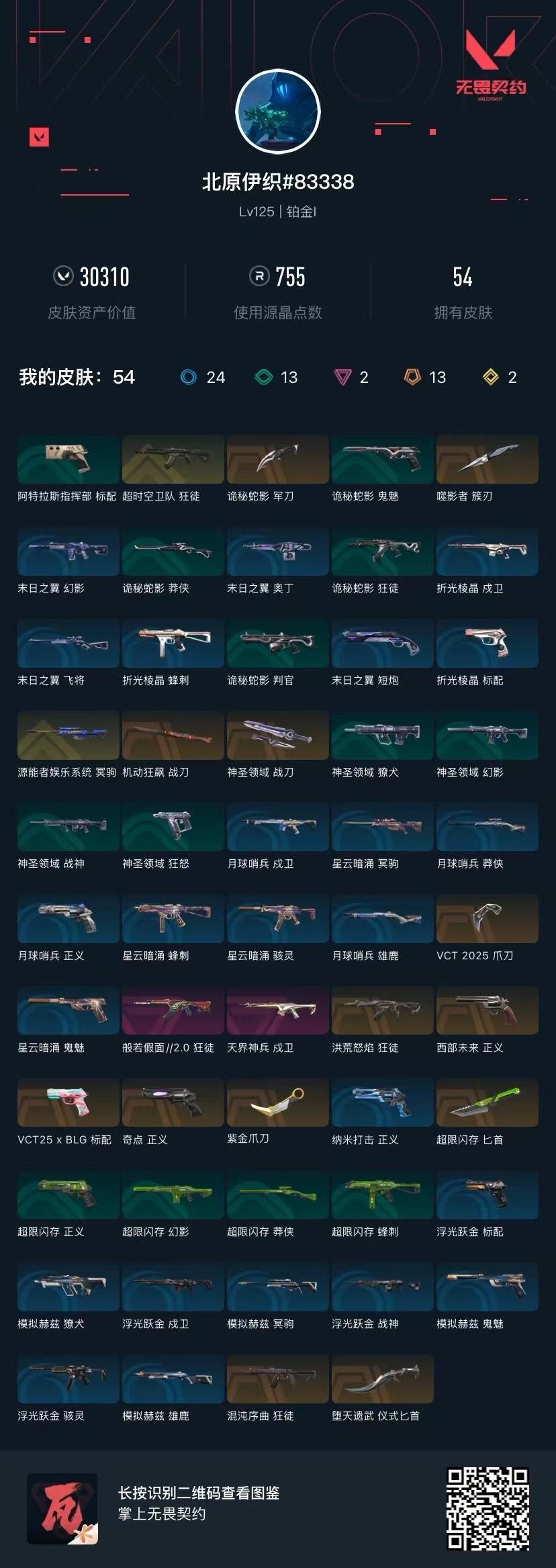 [14320493]13橙皮 2金皮 2紫皮 54皮肤 28英雄 105卡面 755已用源晶 铂金段位 【套装】:vct 2025赛季礼包vcn2025套装 【近战武器皮肤】:匕首-超限闪存神圣领域 战刀噬影者簇刃vct 2025 爪刀诡秘蛇影堕天遗武 仪式匕首机动狂飙战刀紫金