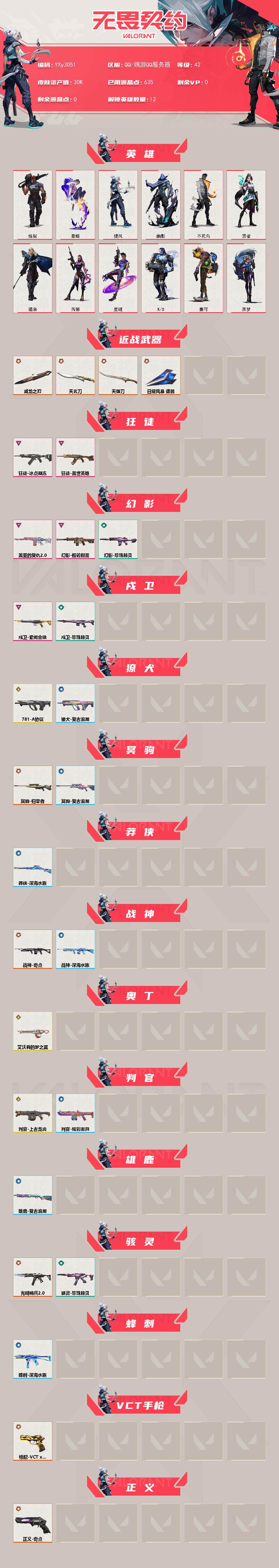 【3w库存天玄刀.天御刀.威龙之刃.猴子.冰点.恶鬼幻影.紫金戍卫.781獠犬.猫猫奥丁.奇点战神】y3051【无二次】【因赛季更新游戏段付以上号为准!】 【英雄】:炼狱,暮蝶,捷风,幽影,不死鸟,贤者,猎枭,芮娜,星礈,k/o,盖可,黑梦 【近战 武器】:近战武器-威龙之刃,近战武器-天玄刀,近战武器-天御刀,近战武器-日耀风暴 遗器 【狂徒】:狂徒-冰点凝冻,狂徒-盖世英雄 【幻影】: