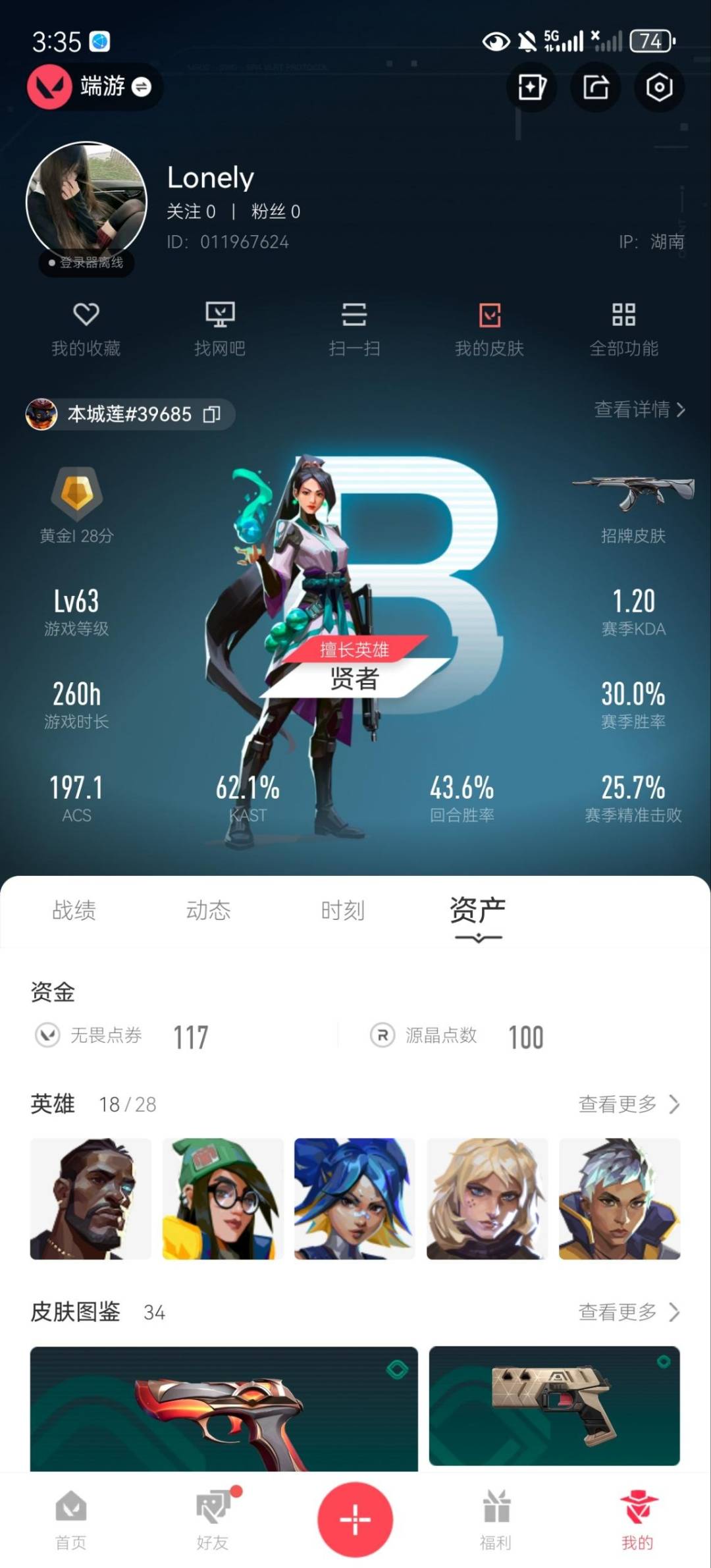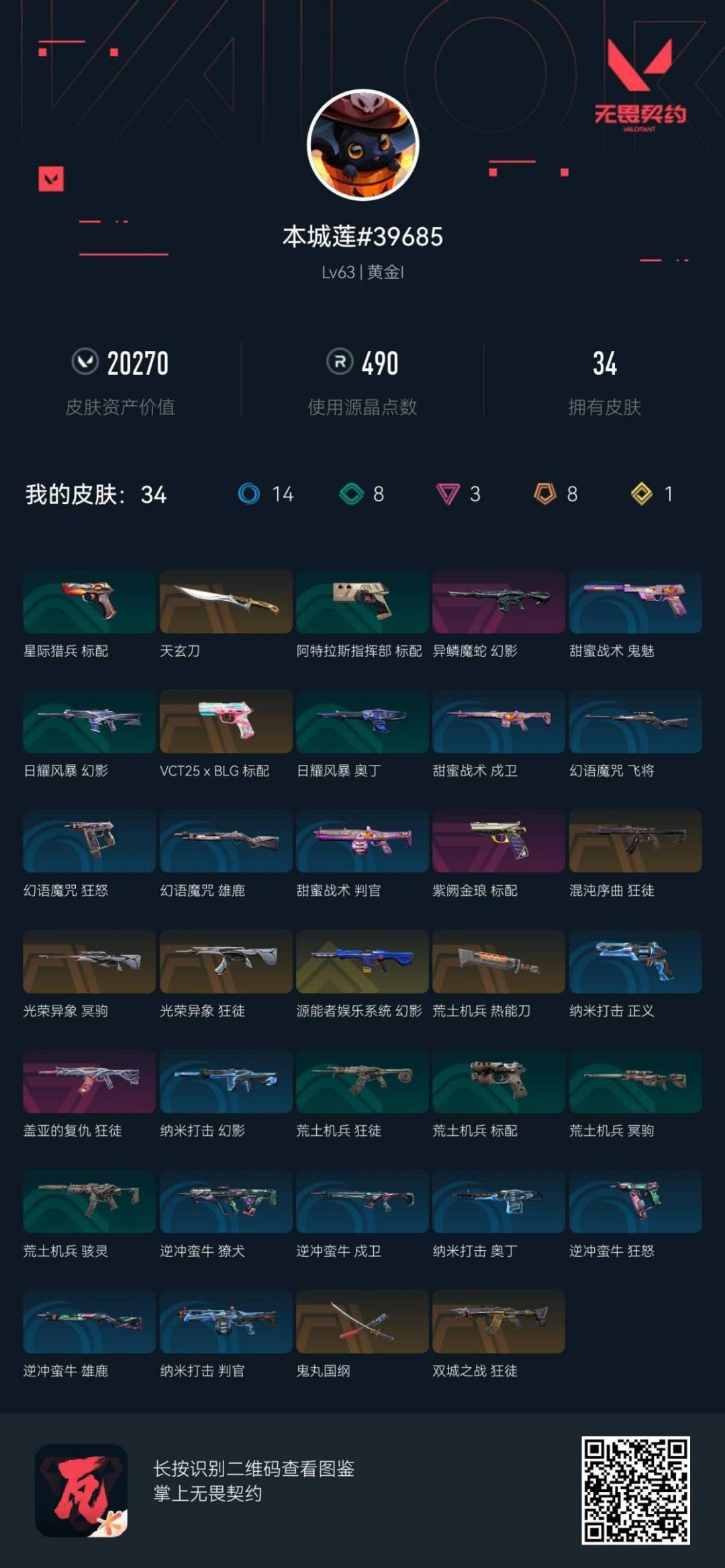 [14343901]8橙皮 1金皮 3紫皮 34皮肤 18英雄 65卡面 490已用源晶 黄金段位 【近战武器皮肤】:荒土机兵热能刀鬼丸国纲天玄刀 【佩呛皮肤】:标配-vct25xblg标配-紫阙金琅 【步呛皮肤】:狂徒-双城之战狂徒-混沌序曲幻影-异鳞魔蛇狂徒-光荣异象狂徒-盖亚的