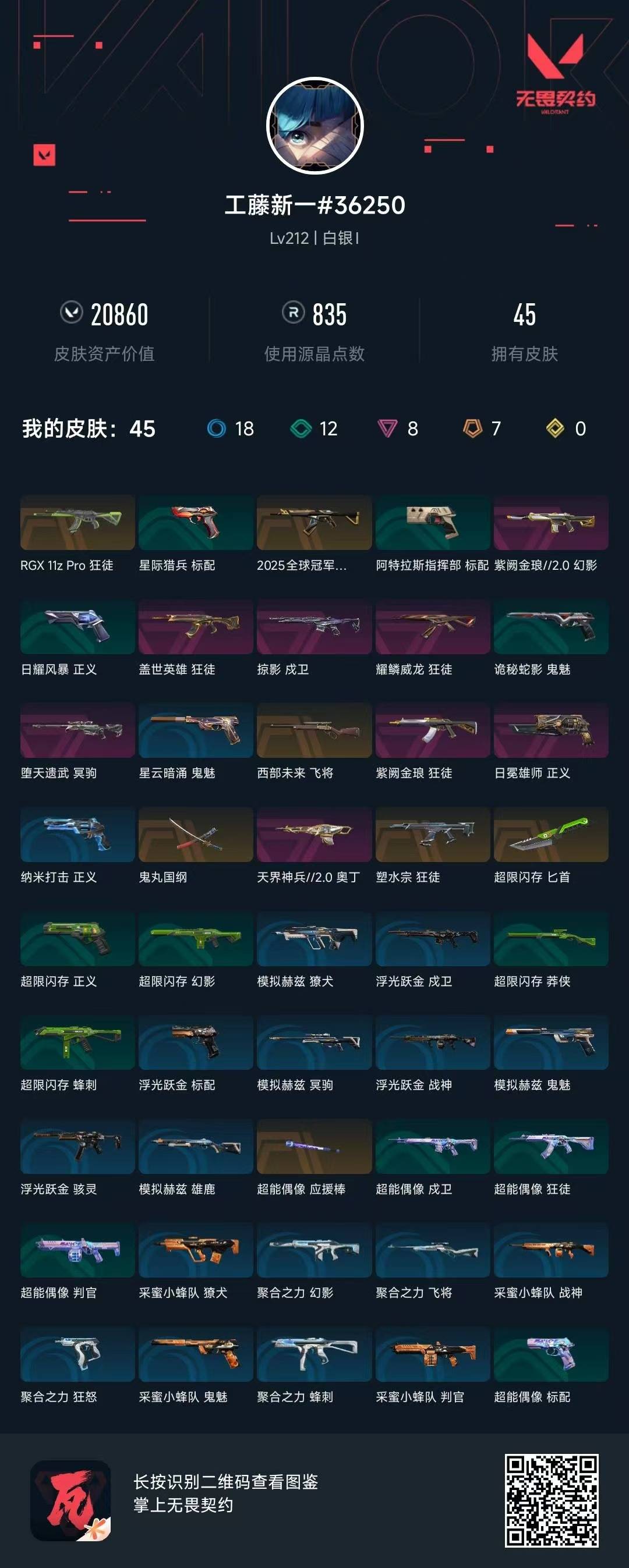[14344658]7橙皮 8紫皮 45皮肤 28英雄 108卡面 835已用源晶 白银段位 【近战武器皮肤】:匕首-超限闪存鬼丸国纲超能偶像 应援棒 【佩呛皮肤】:正义-日冕雄师 【步呛皮肤】:戍卫-掠影2025全球冠军赛 狂徒狂徒-rgx 11z pro狂徒-紫阙金琅狂徒-塑水宗