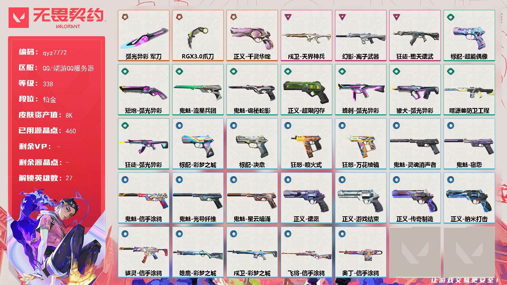 铂金多热门号-嘎嘎香-速出-qyz7772-近战武器皮肤:-军刀-弧光异彩爪刀-rgx-11z-pro-30-步呛皮肤:-戍卫-天界神兵狂徒-堕天遗武幻影-离子武器-佩呛皮肤:-正义-千灵华绽-亮点:-【qyz7772】【英雄】:幻棱,炼狱,维斯,暮蝶,钛狐,壹决,铁臂,捷风,雷兹,幽影,不死鸟,贤者,猎枭,蝰蛇,零,芮娜,奇乐,尚勃勒,霓虹,斯凯,夜露,星礈,k/o,海神,盖可,黑梦,钢锁【近战-武器】:近战武器-rgx-11z-pro//30-爪刀,近战武器-弧光异彩-军刀【狂徒】:狂徒-堕天遗武,狂徒-弧光异彩【幻影】:幻影-离子武器,幻影-噬源兽防卫工程【戍卫】:戍卫-天界神兵,戍卫-彩梦之城【獠犬】:獠犬-弧光异彩【飞将】:飞将-信手涂鸦【奥丁】:奥丁-信手涂鸦【雄鹿】:雄鹿-彩梦之城【骇灵】:骇灵-信手涂鸦【蜂刺】:蜂刺-弧光异彩【标配】:标配-超能偶像,标配-彩梦之城,标配-决意【正义】:正义-千灵华绽,正义-超限闪存,正义-传奇制造,正义-纳米打击,正义-遗愿,正义-游戏结束【鬼魅】:鬼魅-流星兵团,鬼魅-诡秘蛇影,鬼魅-光导纤维,鬼魅-灵魂消声者,鬼魅-宿怨,鬼魅-信手涂鸦,鬼魅-星云暗涌【狂怒】:狂怒-喷火式,狂怒-万花棱镜【短炮】:短炮-弧光异彩【卡面】:终章:激斗汉堡-卡面,进入射程-卡面,《双城之战》拥抱-卡面,精灵大战-卡面,欢迎来到底城-卡面,南瓜盛典-卡面,无畏契约:暮蝶-卡面,修车达人-卡面,正义的化身-卡面,铁之华-卡面,时间到-卡面,最高舞台-卡面,声感陷阱设计图-卡面,梦幻奶茶-卡面,趁热吃-卡面,源能反应-卡面,零点嗅探设计图-卡面,沙雕爆能器-卡面,无畏契约go!第一卷:芮娜-卡面,清除名单-卡面,无畏契约go!第一卷:零-卡面,终章:同步耍酷-卡面,龍记-卡面,化茧成蝶-卡面,《双城之战》金克丝-卡面,完美调谐-卡面-,暗呛-卡面,夯实根基-卡面,铁臂设计图-卡面,代号红色-卡面,冰淇淋店-卡面,新兵报到-卡面,友军火力-卡面,v契约-卡面,无畏契约-卡面【喷漆】:嗨宝南瓜灯-喷漆,嘭!-喷漆,都算到了-喷漆,控场勿近-喷漆,伤心心-喷漆,小丑猫-喷漆,熊抱-喷漆,超级粉丝-喷漆,捷风差距-喷漆,惊声尖叫-喷漆,拼一呛-喷漆,我觉得不行-喷漆,我的刀呢?-喷漆,uwu-喷漆,双击点赞-喷漆,