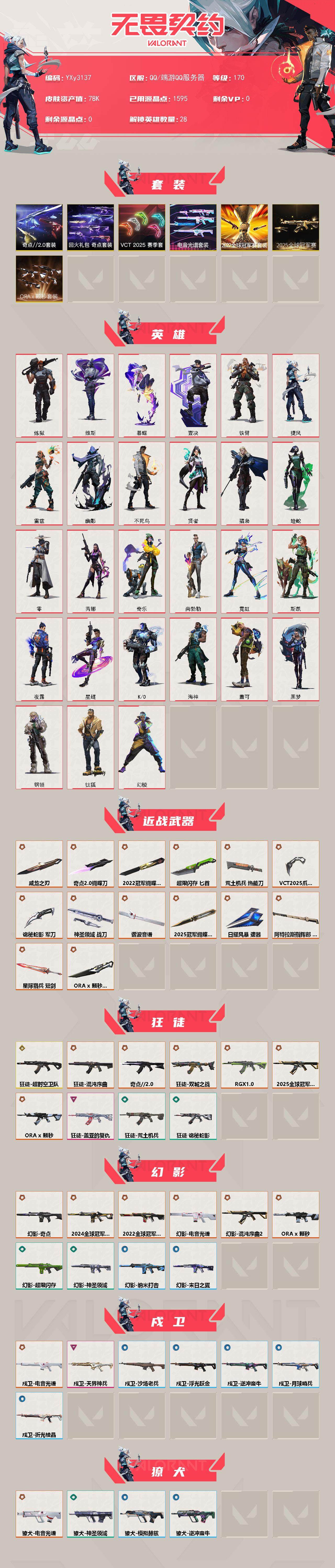 【7.8w库存22冠军套.25冠军套.颗秒套.光谱套.vct爪刀.八狂徒六幻影超时空.混沌.显卡.双城.24冠军.混沌2.0】y3137【无二次】【因赛季更新游戏段付以上号为准!】 【套装】:2025全球冠军赛套装,2022全球冠军赛套装,a x 颗秒套装,电音光谱套装,vct 2025 赛季套装,奇点//2.0套装,回火礼包:奇点套装 【英雄】:幻棱,炼狱,维斯,暮蝶,钛狐,壹决,铁