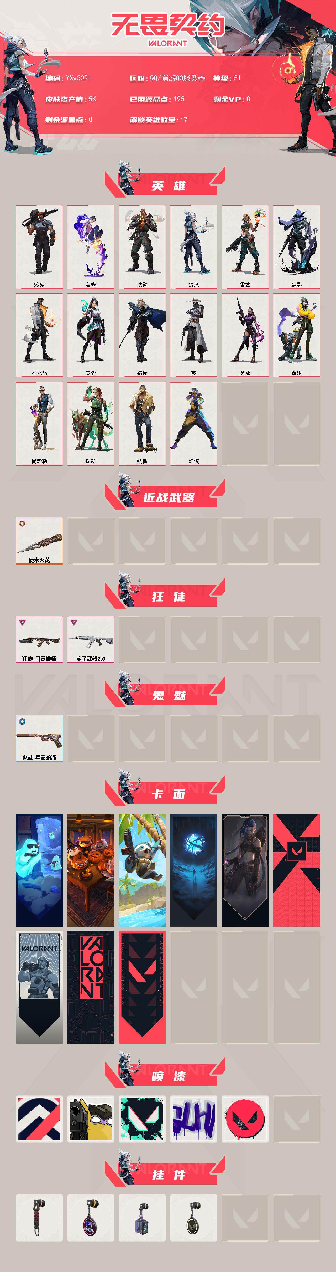 【英雄】:幻棱,炼狱,暮蝶,钛狐,铁臂,捷风,雷兹,幽影,不死鸟,贤者,猎枭,零,芮娜,奇乐,尚勃勒,斯凯 【近战 武器】:近战武器-魔术火花,近战武器-魔术火花 【狂徒】:狂徒-日冕雄师,狂徒-离子武器//2.0 【鬼魅】:鬼魅-星云暗涌 【卡面】:精灵大战 卡面,南瓜盛典 卡面,树懒大作战 卡面,无垠星环 卡面,《双城之战》金克丝 卡面,代号红色 卡面,新兵报到 卡面,v契约 卡面,无畏契