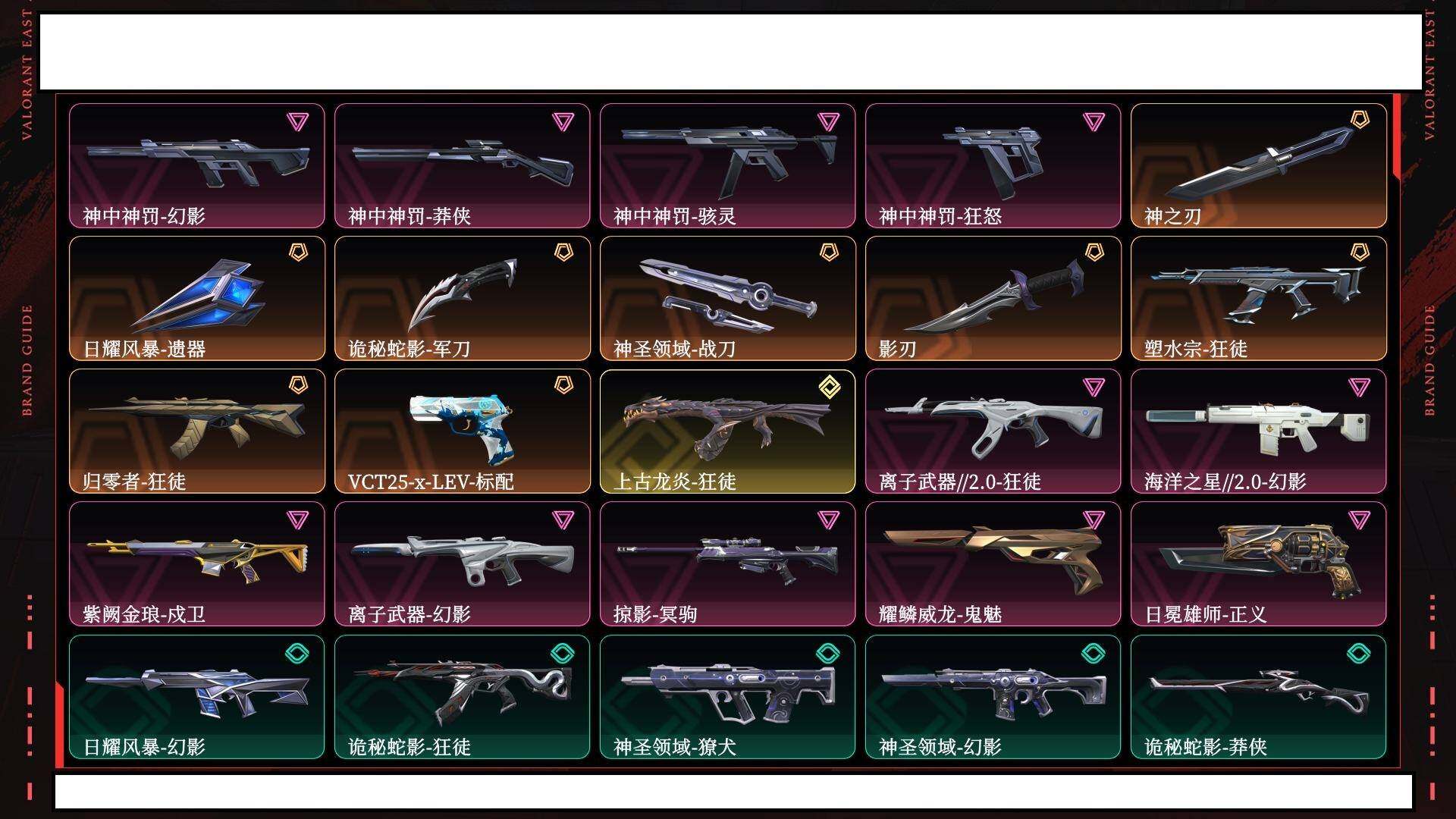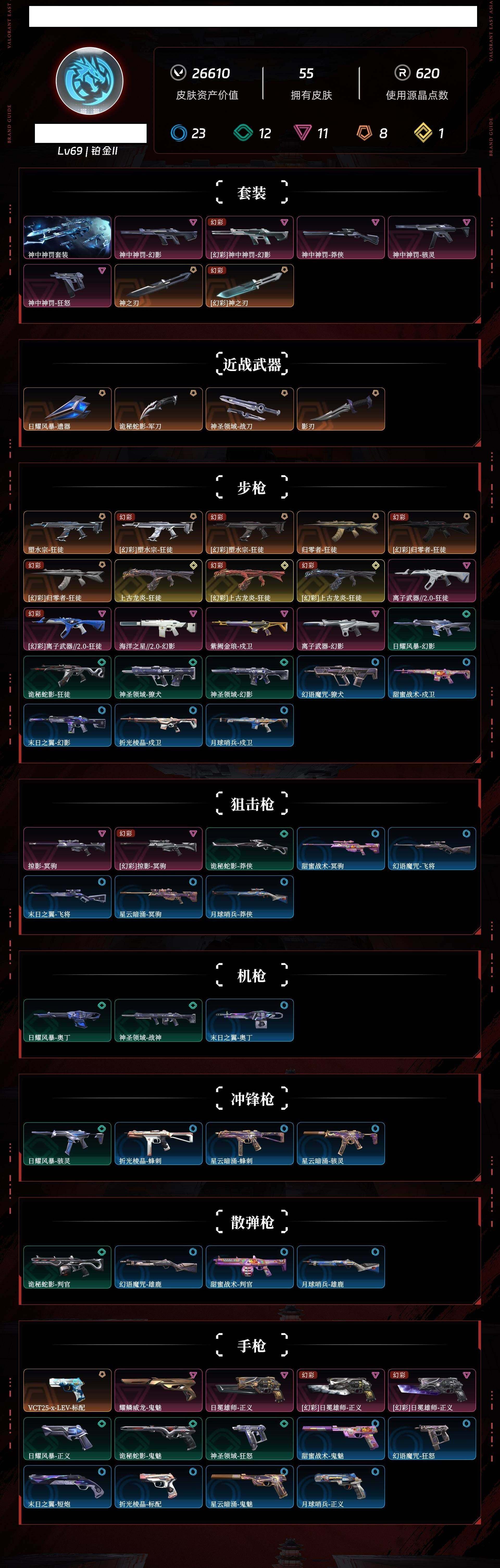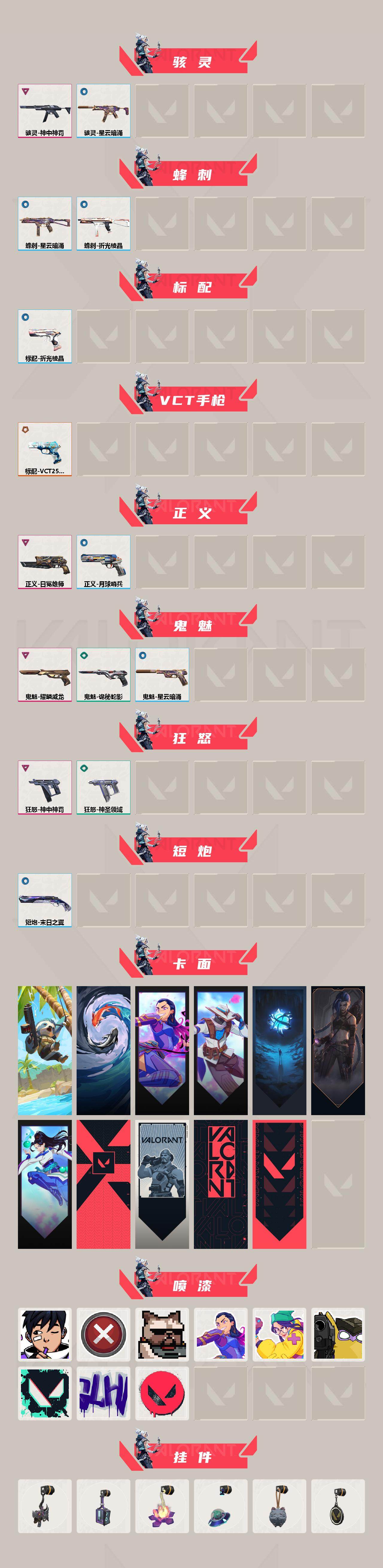 【1107】欢 172416【套装】:神中神罚套装 【英雄】:幻棱,炼狱,维斯,暮蝶,钛狐,壹决,铁臂,捷风,幽影,不死鸟,贤者,猎枭,蝰蛇,零,芮娜,奇乐,斯凯,k/o,盖可,钢锁 【近战 武器】:近战武器-神之刃,近战武器-影刃,近战武器-诡秘蛇影 军刀,近战武器-神圣领域 战刀,近战武器-日耀风暴 遗器 【狂徒】:狂徒-上古龙炎,狂徒-归零者,狂徒-塑水宗,狂徒-离子武器//2.0,狂徒-诡秘蛇影 【幻影】:幻影-离子武器,幻影-海洋之星//2.0,幻影-神中神罚,幻影-神圣领域,幻影-末日之翼 【戍卫】:戍卫-紫阙金琅,戍卫-月球哨兵,戍卫-折光棱晶 【獠犬】:獠犬-神圣领域 【冥驹】:冥驹-掠影,冥驹-星云暗涌 【飞将】:飞将-末日之翼 【莽侠】:莽侠-神中神罚,莽侠-诡秘蛇影,莽侠-月球哨兵 【战神】:战神-神圣领域 【奥丁】:奥丁-末日之翼 【判官】:判官-诡秘蛇影 【雄鹿】:雄鹿-月球哨兵 【骇灵】:骇灵-神中神罚,骇灵-星云暗涌 【蜂刺】:蜂刺-星云暗涌,蜂刺-折光棱晶 【标配】:标配-折光棱晶 【vct手呛】:标配-vct25 x lev 【正义】:正义-日冕雄师,正义-月球哨兵 【鬼魅】:鬼魅-耀鳞威龙,鬼魅-诡秘蛇影,鬼魅-星云暗涌 【狂怒】:狂怒-神中神罚,狂怒-神圣领域 【短炮】:短炮-末日之翼 【卡面】:树懒大作战 卡面,红鳞松叶 卡面,无畏契约go!第一卷:芮娜 卡面,无畏契约go!第一卷:零 卡面,无垠星环 卡面,《双城之战》金克丝 卡面,无畏契约go!第一卷:贤者 卡面,代号红色 卡面,新兵报到 卡面,v契约 卡面,无畏契约 卡面 【喷漆】:吸一口快乐 喷漆,买装还是存钱 喷漆,关门放狗 喷漆,无畏契约go!第一卷:芮娜 喷漆,无畏契约go!第一卷:奇乐 喷漆,放下武器 喷漆,胜利属于无畏契约 喷漆,glhf 喷漆,无畏契约 喷漆 【挂饰】:鱼骨头 挂饰,动力机箱 挂饰,传世莲华 挂饰,天外飞客 挂饰,《双城之战》魄罗 挂饰,无畏契约 纪念币 挂饰