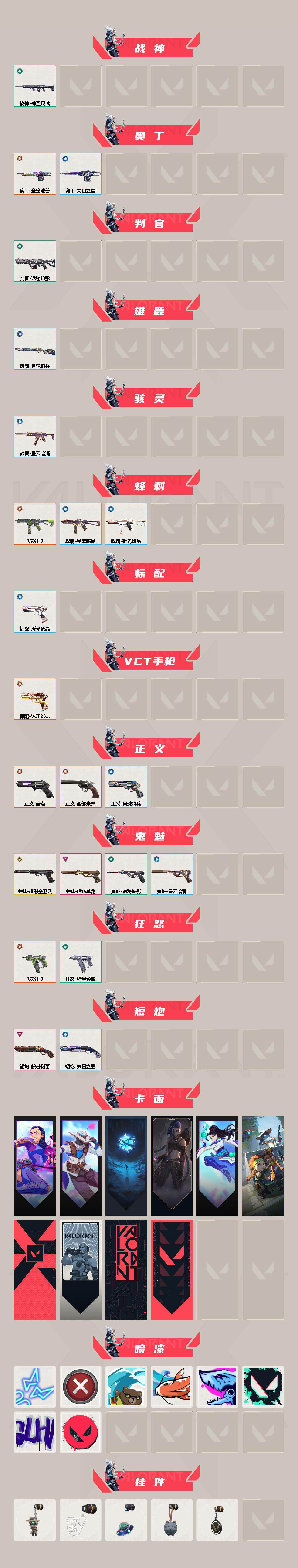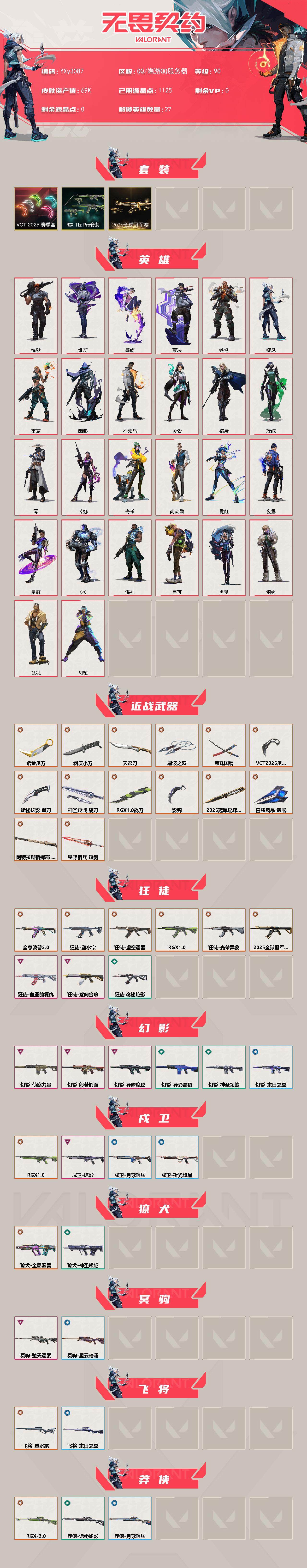 【6.9w库存25冠军套.显卡套.vct爪刀.黑波之刃.掠夺爪刀.太刀.天玄刀.剥皮小刀.紫金爪刀.八狂徒双幻影塑水宗.虚空.光荣异象.侦查.恶鬼】y3087【可二次】【因赛季更新游戏段付以上号为准!】 【套装】:2025全球冠军赛套装,rgx 11z pro套装,vct 2025 赛季套装 【英雄】:幻棱,炼狱,维斯,暮蝶,钛狐,壹决,铁臂,捷风,雷兹,幽影,不死鸟,贤者,猎枭,蝰蛇,零