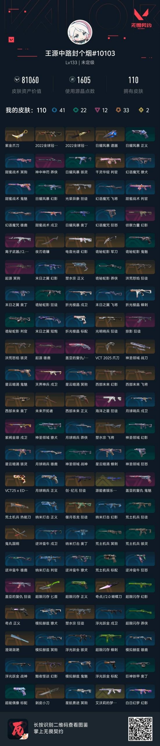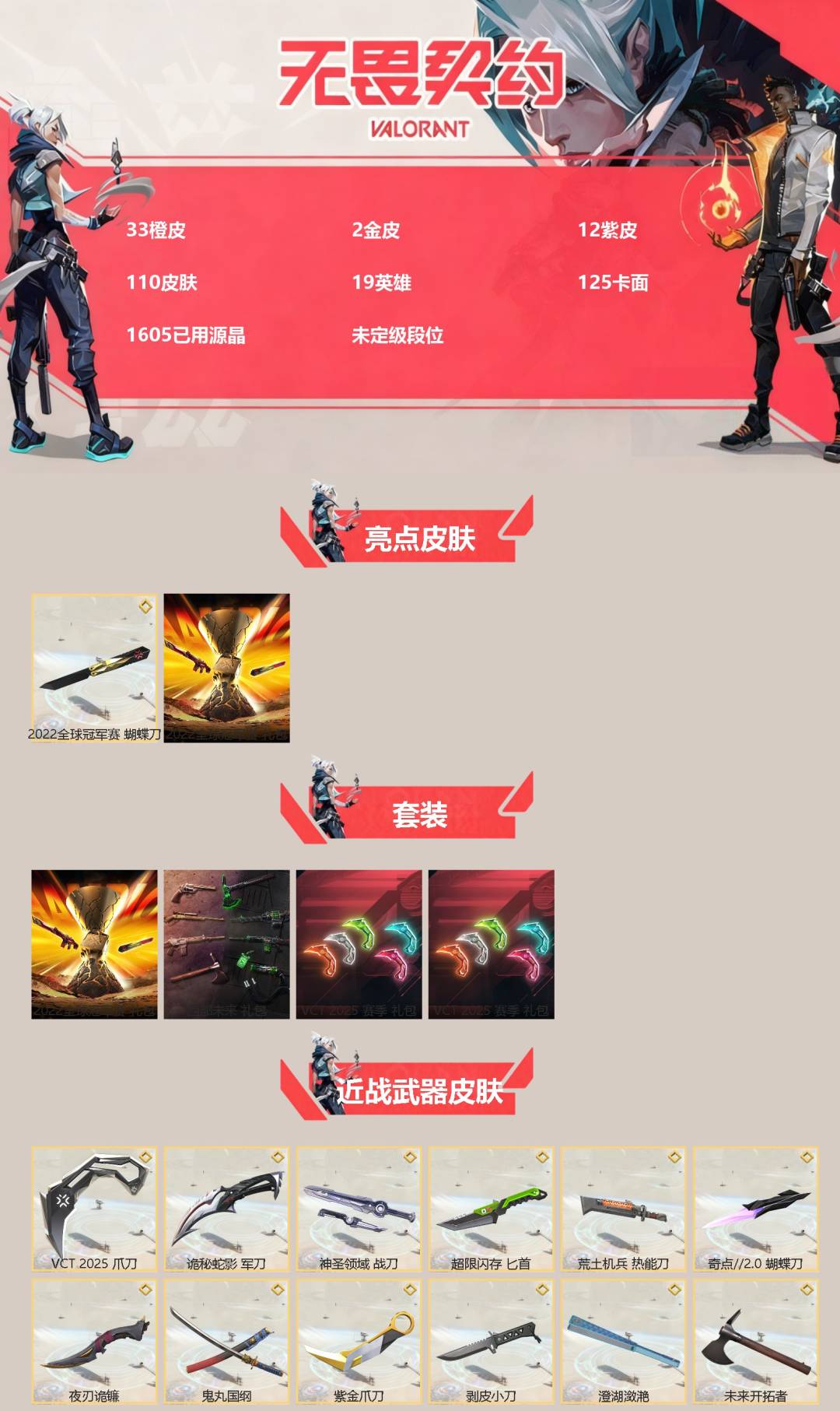 [14359644]33橙皮 2金皮 12紫皮 110皮肤 19英雄 125卡面 1605已用源晶 未定级段位 【亮点皮肤】:幻影-2022全球冠军赛蝴蝶刀-2022全球冠军赛 【套装】:2022全球冠军赛vct 2025赛季礼包西部未来vcn2025套装 【近战武器皮肤】:神圣领域