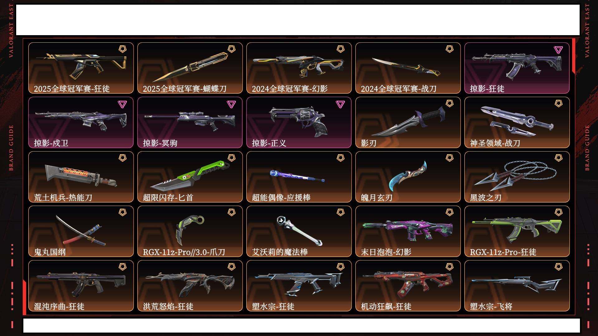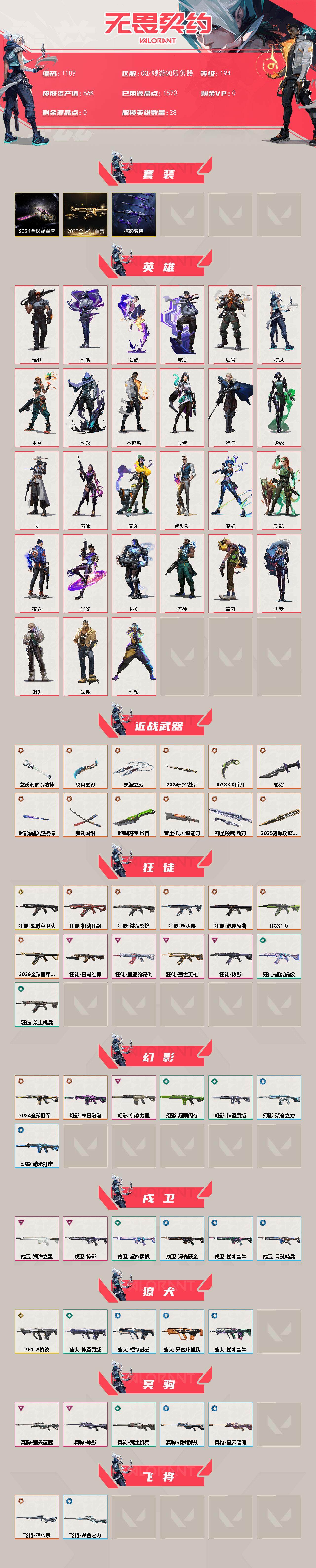 【1109】欢 248006【套装】:2025全球冠军赛套装,2024全球冠军赛套装,掠影套装 【英雄】:幻棱,炼狱,维斯,暮蝶,钛狐,壹决,铁臂,捷风,雷兹,幽影,不死鸟,贤者,猎枭,蝰蛇,零,芮娜,奇乐,尚勃勒,霓虹,斯凯,夜露,星礈,k/o,海神,盖可,黑梦,钢锁 【近战 武器】:近战武器-2025全球冠军赛 蝴蝶刀,近战武器-2024全球冠军赛 战刀,近战武器-rgx 11z pro//3.0 爪刀,近战武器-黑波之刃,近战武器-艾沃莉的魔法棒,近战武器-鬼丸国纲,近战武器-超能偶像 应援棒,近战武器-超限闪存 匕首,近战武器-荒土机兵 热能刀,近战武器-魄月玄刃,近战武器-影刃,近战武器-神圣领域 战刀 【狂徒】:狂徒-超时空卫队,狂徒-2025全球冠军赛,狂徒-洪荒怒焰,狂徒-混沌序曲,狂徒-机动狂飙,狂徒-塑水宗,狂徒-rgx 11z pro,狂徒-掠影,狂徒-盖世英雄,狂徒-盖亚的复仇,狂徒-日冕雄师,狂徒-超能偶像,狂徒-荒土机兵 【幻影】:幻影-2024全球冠军赛,幻影-末日泡泡,幻影-侦察力量,幻影-超限闪存,幻影-神圣领域,幻影-聚合之力,幻影-纳米打击 【戍卫】:戍卫-掠影,戍卫-海洋之星,戍卫-超能偶像,戍卫-浮光跃金,戍卫-逆冲蛮牛,戍卫-月球哨兵 【獠犬】:獠犬-781-a协议,獠犬-神圣领域,獠犬-采蜜小蜂队,獠犬-模拟赫兹,獠犬-逆冲蛮牛 【冥驹】:冥驹-堕天遗武,冥驹-掠影,冥驹-荒土机兵,冥驹-模拟赫兹,冥驹-星云暗涌 【飞将】:飞将-塑水宗,飞将-聚合之力 【莽侠】:莽侠-超限闪存,莽侠-月球哨兵 【战神】:战神-神圣领域,战神-采蜜小蜂队,战神-浮光跃金 【奥丁】:奥丁-纳米打击 【判官】:判官-超能偶像,判官-采蜜小蜂队,判官-纳米打击x 【雄鹿】:雄鹿-模拟赫兹,雄鹿-逆冲蛮牛,雄鹿-月球哨兵 【骇灵】:骇灵-荒土机兵,骇灵-浮光跃金,骇灵-星云暗涌 【蜂刺】:蜂刺-超限闪存,蜂刺-聚合之力,蜂刺-星云暗涌 【标配】:标配-堕天遗武,标配-超能偶像,标配-荒土机兵,标配-浮光跃金 【正义】:正义-奇点,正义-塑水宗,正义-掠影,正义-超限闪存,正义-复古浪潮,正义-纳米打击,正义-月球哨兵 【鬼魅】:鬼魅-天界神兵,鬼魅-诡秘蛇影,鬼魅-采蜜小蜂队,鬼魅-模拟赫兹,鬼魅-数码咒术,鬼魅-星云暗涌 【狂怒】:狂怒-神圣领域,狂怒-聚合之力,狂怒-逆冲蛮牛 【短炮】:短炮-混沌序曲,短炮-好搭档 【卡面】:终章:激斗汉堡 卡面,进入射程 卡面,分崩离析 卡面,纳米打击 卡面,抑制技术 卡面,激斗汉堡 卡面,瓦娃脸雪糕 p2 卡面,从黄昏到黎明 卡面,荒土机兵 卡面,银弹猎手 卡面,逆冲蛮牛 卡面,《双城之战》拥抱 卡面,精灵大战 卡面,欢迎来到底城 卡面,南瓜盛典 卡面,唱片的故事 卡面,钢弓与箭弦 卡面,排除故障 卡面,战术桌游 卡面,悠享食光 卡面,修车达人 卡面,模拟赫兹 卡面,浮光跃金 卡面,超限闪存 卡面,维斯工牌 卡面,正义的化身 卡面,铁之华 卡面,2024全球冠军赛 卡面,失而复得 卡面,时间到 卡面,最高舞台 卡面,复活专家 卡面,归乡 // 蝰蛇 卡面,超能偶像 卡面,生意人麦宝 卡面,声感陷阱设计图 卡面,钢锁工牌 卡面,战术小伙伴的夏日 卡面,采蜜小蜂队 卡面,聚合之力 卡面,梦幻奶茶 卡面,源能反应 卡面,零点嗅探设计图 卡面,表象之下 卡面,沙雕爆能器 卡面,无畏契约go!第一卷:芮娜 卡面,清除名单 卡面,无畏契约go!第一卷:零 卡面,龍记 卡面,《双城之战》金克丝 卡面,完美调谐 卡面 ,暗呛 卡面,夯实根基 卡面,热烈欢迎 卡面,铁臂设计图 卡面,代号红色 卡面,冰淇淋店 卡面,新兵报到 卡面,友军火力 卡面,v契约 卡面,无畏契约 卡面 【喷漆】:小小心意 喷漆,战“素”兔 喷漆,宇宙的指引 喷漆,请求重启 喷漆,逆冲蛮牛 喷漆,纳米打击 喷漆,鼻尖上的蝴蝶 喷漆,简笔画黯兽 喷漆,独守蝰腹 喷漆,他们将落荒而逃 喷漆,通缉:战术企鹅 喷漆,荒土机兵 喷漆,别挡我吃球! 喷漆,嗨宝南瓜灯 喷漆,嘭! 喷漆,都算到了 喷漆,控场勿近 喷漆,皮蛋呼呼 喷漆,像素星礈 喷漆,图谋不轨的零 喷漆,小丑猫 喷漆,模拟赫兹 喷漆,高丽风情小熊 喷漆,蹲到一个 喷漆,全力集中 喷漆,超限闪存 喷漆,rua一下 喷漆,熊抱 喷漆,高丽风情小虎 喷漆,记在小本本 喷漆,防弹企鹅 喷漆,高丽风情小蛙 喷漆,2024全球冠军赛 喷漆,又被闪了 喷漆,终极羞辱 喷漆,超级粉丝 喷漆,黯兽卖萌 喷漆,捷风差距 喷漆,惊声尖叫 喷漆,五人成星 喷漆,超能偶像 喷漆,放我出去 喷漆,掩护我 喷漆,大佬发呛 喷漆,边缘试探 喷漆,拼一呛 喷漆,聚合之力 喷漆,采蜜小蜂队 喷漆,梦幻小队 喷漆,五个全都齐了 喷漆,我的刀呢? 喷漆,uwu 喷漆,新潮流 喷漆,双击点赞 喷漆,买装还是存钱 喷漆,醒狮贺春 喷漆,无畏契约go!第一卷:芮娜 喷漆,红鳞 喷漆,无畏契约go!第一卷:零 喷漆,无畏契约go!第一卷:捷风 喷漆,无畏契约go!第一卷:贤者 喷漆,暴走萝莉 喷漆,松叶 喷漆,无畏契约go!第一卷:奇乐 喷漆,旅行小熊 喷漆,蕊形灯 喷漆,老铁困了 喷漆,口袋贤者 喷漆,胜利属于无畏契约 喷漆,glhf 喷漆,无畏契约 喷漆 【挂饰】:终章:猫猫木乃伊 挂饰,荒土机兵 挂饰,悠闲鸡块 挂饰,猫猫木乃伊 挂饰,水壶 挂饰,纳米打击 挂饰,逆冲蛮牛 挂饰,可爱糖糖 挂饰,伞绳 挂饰,《双城之战》小蛋糕 挂饰,第九季//第三幕 纪念币 挂饰,拳击战术熊 挂饰,工具腰带 挂饰,无畏契约go!第一卷 芮娜 挂饰,无畏契约go!第一卷 零 挂饰,暗藏猫腻 挂饰,高丽风情 挂饰,鱼骨头 挂饰,熔岩灯 挂饰,超限闪存 挂饰,迷你k/o 挂饰,模拟赫兹 挂饰,第九季//第二幕 纪念币 挂饰,终章:这瓜保熟 挂饰,2