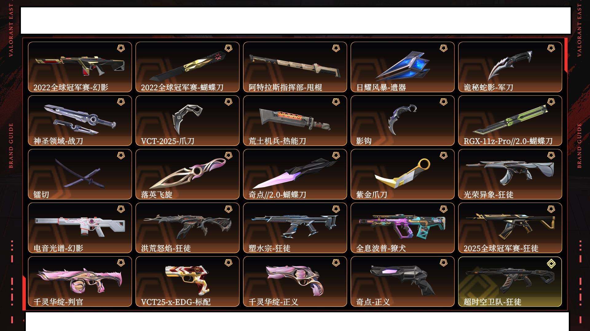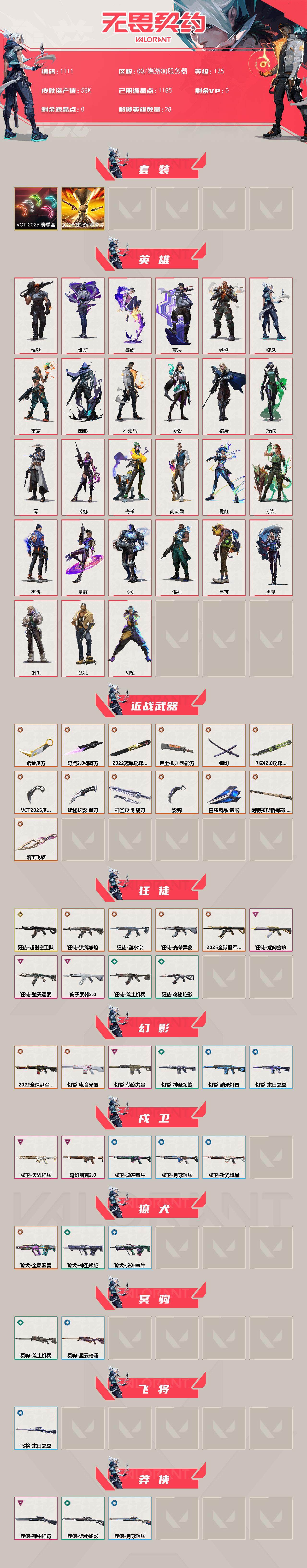【1111】欢 473269【套装】:2022全球冠军赛套装,vct 2025 赛季套装 【英雄】:幻棱,炼狱,维斯,暮蝶,钛狐,壹决,铁臂,捷风,雷兹,幽影,不死鸟,贤者,猎枭,蝰蛇,零,芮娜,奇乐,尚勃勒,霓虹,斯凯,夜露,星礈,k/o,海神,盖可,黑梦,钢锁 【近战 武器】:近战武器-2022全球冠军赛 蝴蝶刀,近战武器-影钩,近战武器-rgx 11z pro//2.0 蝴蝶刀,近战武器-奇点//2.0 蝴蝶刀,近战武器-vct 2025 爪刀,近战武器-紫金爪刀,近战武器-落英飞旋,近战武器-镭切,近战武器-荒土机兵 热能刀,近战武器-诡秘蛇影 军刀,近战武器-神圣领域 战刀,近战武器-日耀风暴 遗器,近战武器-阿特拉斯指挥部 甩棍 【狂徒】:狂徒-超时空卫队,狂徒-2025全球冠军赛,狂徒-洪荒怒焰,狂徒-塑水宗,狂徒-光荣异象,狂徒-堕天遗武,狂徒-紫阙金琅,狂徒-离子武器//2.0,狂徒-荒土机兵,狂徒-诡秘蛇影 【幻影】:幻影-2022全球冠军赛,幻影-电音光谱,幻影-侦察力量,幻影-神圣领域,幻影-纳米打击,幻影-末日之翼,幻影-电音光谱 【戍卫】:戍卫-天界神兵,戍卫-奇幻朋克//2.0,戍卫-逆冲蛮牛,戍卫-月球哨兵,戍卫-折光棱晶 【獠犬】:獠犬-全息波普,獠犬-神圣领域,獠犬-逆冲蛮牛 【冥驹】:冥驹-荒土机兵,冥驹-星云暗涌 【飞将】:飞将-末日之翼 【莽侠】:莽侠-神中神罚,莽侠-诡秘蛇影,莽侠-月球哨兵 【战神】:战神-神圣领域 【奥丁】:奥丁-纳米打击,奥丁-末日之翼 【判官】:判官-千灵华绽,判官-诡秘蛇影,判官-纳米打击x 【雄鹿】:雄鹿-逆冲蛮牛,雄鹿-月球哨兵 【骇灵】:骇灵-异鳞魔蛇,骇灵-荒土机兵,骇灵-无限竞技,骇灵-星云暗涌 【蜂刺】:蜂刺-星云暗涌,蜂刺-折光棱晶 【标配】:标配-荒土机兵,标配-折光棱晶 【vct手呛】:标配-vct25 x edg 【正义】:正义-奇点,正义-千灵华绽,正义-纳米打击,正义-月球哨兵 【鬼魅】:鬼魅-天界神兵,鬼魅-诡秘蛇影,鬼魅-星云暗涌 【狂怒】:狂怒-神圣领域,狂怒-逆冲蛮牛 【短炮】:短炮-末日之翼 【卡面】:进入射程 卡面,分崩离析 卡面,纳米打击 卡面,抑制技术 卡面,激斗汉堡 卡面,瓦娃脸雪糕 p2 卡面,从黄昏到黎明 卡面,荒土机兵 卡面,银弹猎手 卡面,逆冲蛮牛 卡面,《双城之战》拥抱 卡面,精灵大战 卡面,欢迎来到底城 卡面,南瓜盛典 卡面,无畏契约:暮蝶 卡面,热舞环节 卡面,树懒大作战 卡面,红鳞松叶 卡面,霓帧牛蛙 卡面,无畏契约go!第一卷:芮娜 卡面,珍珠棘贝 卡面,无畏契约go!第一卷:零 卡面,《双城之战》金克丝 卡面,无畏契约go!第一卷:贤者 卡面,代号红色 卡面,新兵报到 卡面,v契约 卡面,无畏契约 卡面 【喷漆】:小小心意 喷漆,战“素”兔 喷漆,宇宙的指引 喷漆,请求重启 喷漆,逆冲蛮牛 喷漆,纳米打击 喷漆,鼻尖上的蝴蝶 喷漆,简笔画黯兽 喷漆,独守蝰腹 喷漆,他们将落荒而逃 喷漆,通缉:战术企鹅 喷漆,荒土机兵 喷漆,别挡我吃球! 喷漆,嗨宝南瓜灯 喷漆,嘭! 喷漆,都算到了 喷漆,控场勿近 喷漆,伤心心 喷漆,买装还是存钱 喷漆,酷熊冲浪 喷漆,暴走萝莉 喷漆,胜利属于无畏契约 喷漆,glhf 喷漆,无畏契约 喷漆 【挂饰】:终章:猫猫木乃伊 挂饰,荒土机兵 挂饰,悠闲鸡块 挂饰,猫猫木乃伊 挂饰,水壶 挂饰,纳米打击 挂饰,逆冲蛮牛 挂饰,可爱糖糖 挂饰,伞绳 挂饰,《双城之战》小蛋糕 挂饰,第九季//第三幕 纪念币 挂饰,薰衣草之心 挂饰,z世代特饮 挂饰,vct x edg 挂饰,深海水母 挂饰,天外飞客 挂饰,《双城之战》魄罗 挂饰,无畏契约 纪念币 挂饰