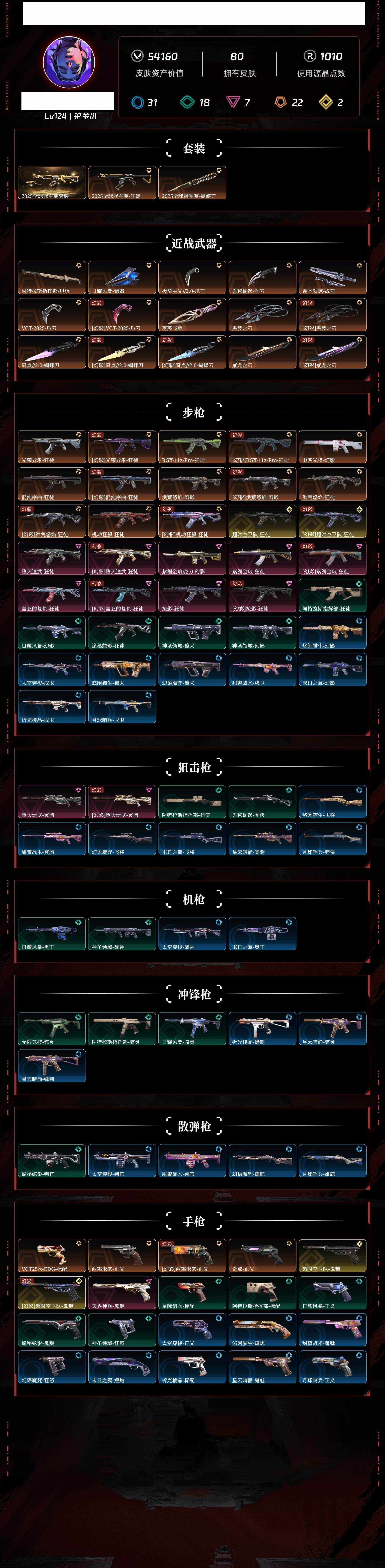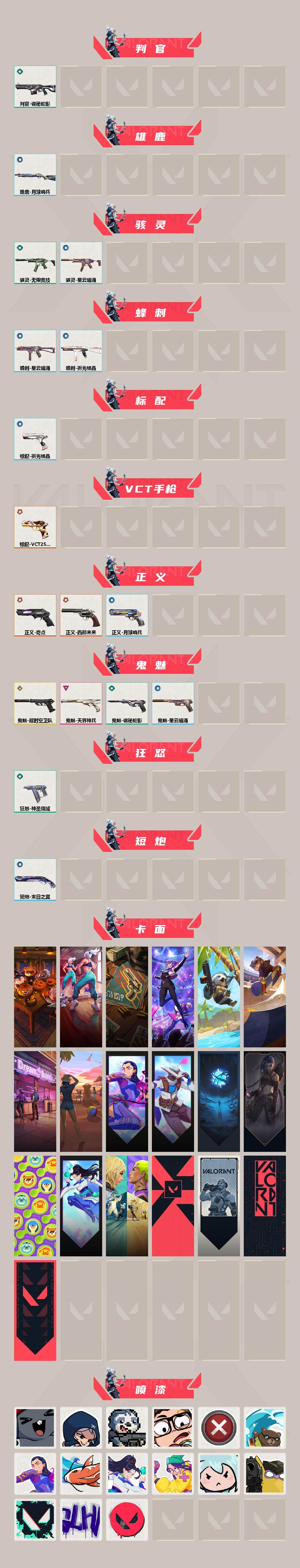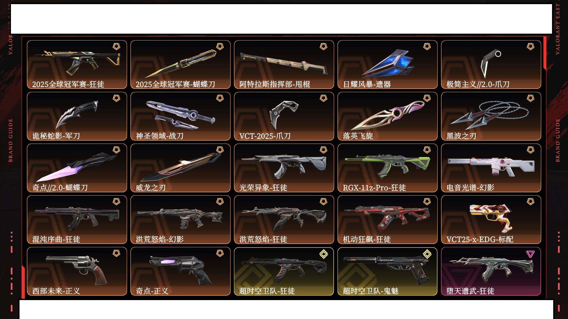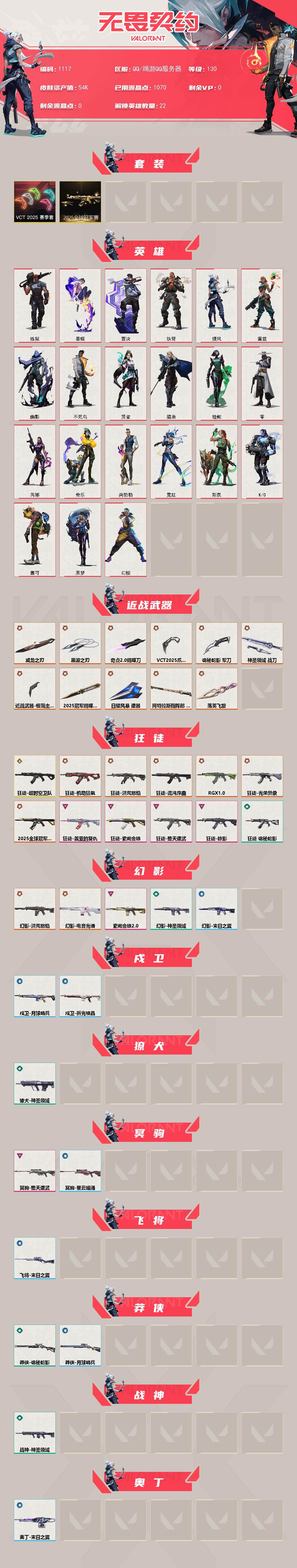 【1117】欢 228979【套装】:2025全球冠军赛套装,vct 2025 赛季套装 【英雄】:幻棱,炼狱,暮蝶,壹决,铁臂,捷风,雷兹,幽影,不死鸟,贤者,猎枭,蝰蛇,零,芮娜,奇乐,尚勃勒,霓虹,斯凯,k/o,盖可,黑梦 【近战 武器】:近战武器-2025全球冠军赛 蝴蝶刀,近战武器-奇点//2.0 蝴蝶刀,近战武器-vct 2025 爪刀,近战武器-黑波之刃,近战武器-落英飞旋,近战武器-威龙之刃,近战武器-极简主义//2.0 爪刀,近战武器-诡秘蛇影 军刀,近战武器-神圣领域 战刀,近战武器-日耀风暴 遗器,近战武器-阿特拉斯指挥部 甩棍 【狂徒】:狂徒-超时空卫队,狂徒-2025全球冠军赛,狂徒-洪荒怒焰,狂徒-混沌序曲,狂徒-机动狂飙,狂徒-rgx 11z pro,狂徒-光荣异象,狂徒-堕天遗武,狂徒-掠影,狂徒-盖亚的复仇,狂徒-紫阙金琅,狂徒-诡秘蛇影 【幻影】:幻影-洪荒怒焰,幻影-电音光谱,幻影-紫阙金琅//2.0,幻影-神圣领域,幻影-末日之翼,幻影-电音光谱 【戍卫】:戍卫-月球哨兵,戍卫-折光棱晶 【獠犬】:獠犬-神圣领域 【冥驹】:冥驹-堕天遗武,冥驹-星云暗涌 【飞将】:飞将-末日之翼 【莽侠】:莽侠-诡秘蛇影,莽侠-月球哨兵 【战神】:战神-神圣领域 【奥丁】:奥丁-末日之翼 【判官】:判官-诡秘蛇影 【雄鹿】:雄鹿-月球哨兵 【骇灵】:骇灵-无限竞技,骇灵-星云暗涌 【蜂刺】:蜂刺-星云暗涌,蜂刺-折光棱晶 【标配】:标配-折光棱晶 【vct手呛】:标配-vct25 x edg 【正义】:正义-奇点,正义-西部未来,正义-月球哨兵 【鬼魅】:鬼魅-超时空卫队,鬼魅-天界神兵,鬼魅-诡秘蛇影,鬼魅-星云暗涌 【狂怒】:狂怒-神圣领域 【短炮】:短炮-末日之翼 【卡面】:南瓜盛典 卡面,热舞环节 卡面,正义的化身 卡面,超能偶像 卡面,树懒大作战 卡面,clutch 卡面,梦幻奶茶 卡面,沙雕爆能器 卡面,无畏契约go!第一卷:芮娜 卡面,无畏契约go!第一卷:零 卡面,无垠星环 卡面,《双城之战》金克丝 卡面,战术小伙伴 卡面,无畏契约go!第一卷:贤者 卡面,钢锁vs盖可 卡面,代号红色 卡面,新兵报到 卡面,v契约 卡面,无畏契约 卡面 【喷漆】:超级粉丝 喷漆,捷风差距 喷漆,审判之爪 喷漆,新潮流 喷漆,买装还是存钱 喷漆,酷熊冲浪 喷漆,无畏契约go!第一卷:芮娜 喷漆,红鳞 喷漆,无畏契约go!第一卷:贤者 喷漆,无畏契约go!第一卷:奇乐 喷漆,飓刃涂鸦 喷漆 ,放下武器 喷漆,胜利属于无畏契约 喷漆,glhf 喷漆,无畏契约 喷漆 【挂饰】:鱼骨头 挂饰,薰衣草之心 挂饰,袖珍捷风 挂饰,z世代特饮 挂饰,第九季//第一幕 纪念币 挂饰,vct x edg 挂饰,传世莲华 挂饰,天外飞客 挂饰,红鳞松叶 挂饰,《双城之战》魄罗 挂饰,海豹的认可 挂饰,无畏契约 纪念币 挂饰