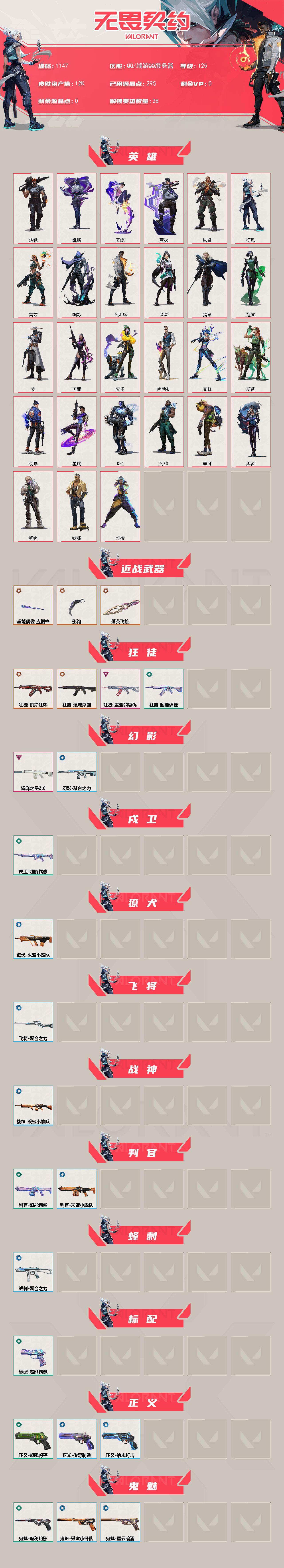 【1147】欢 160977【英雄】:幻棱,炼狱,维斯,暮蝶,钛狐,壹决,铁臂,捷风,雷兹,幽影,不死鸟,贤者,猎枭,蝰蛇,零,芮娜,奇乐,尚勃勒,霓虹,斯凯,夜露,星礈,k/o,海神,盖可,黑梦,钢锁 【近战 武器】:近战武器-影钩,近战武器-落英飞旋,近战武器-超能偶像 应援棒 【狂徒】:狂徒-混沌序曲,狂徒-机动狂飙,狂徒-盖亚的复仇,狂徒-超能偶像 【幻影】:幻影-海洋之星//2.0,幻影-聚合之力 【戍卫】:戍卫-超能偶像 【獠犬】:獠犬-采蜜小蜂队 【飞将】:飞将-聚合之力 【战神】:战神-采蜜小蜂队 【判官】:判官-超能偶像,判官-采蜜小蜂队 【蜂刺】:蜂刺-聚合之力 【标配】:标配-超能偶像 【正义】:正义-超限闪存,正义-传奇制造,正义-纳米打击 【鬼魅】:鬼魅-诡秘蛇影,鬼魅-采蜜小蜂队,鬼魅-星云暗涌 【狂怒】:狂怒-聚合之力 【卡面】:终章:激斗汉堡 卡面,进入射程 卡面,《双城之战》拥抱 卡面,精灵大战 卡面,欢迎来到底城 卡面,南瓜盛典 卡面,修车达人 卡面,正义的化身 卡面,终章:生意人麦宝 卡面,铁之华 卡面,失而复得 卡面,时间到 卡面,最高舞台 卡面,复活专家 卡面,归乡 // 蝰蛇 卡面,超能偶像 卡面,生意人麦宝 卡面,声感陷阱设计图 卡面,红鳞松叶 卡面,钢锁工牌 卡面,战术小伙伴的夏日 卡面,采蜜小蜂队 卡面,聚合之力 卡面,梦幻奶茶 卡面,源能反应 卡面,零点嗅探设计图 卡面,无畏契约go!第一卷:芮娜 卡面,清除名单 卡面,无畏契约go!第一卷:零 卡面,一击全倒 卡面,代号红色 卡面,新兵报到 卡面,v契约 卡面,无畏契约 卡面 【喷漆】:嗨宝南瓜灯 喷漆,嘭! 喷漆,都算到了 喷漆,控场勿近 喷漆,小丑猫 喷漆,熊抱 喷漆,又被闪了 喷漆,终极羞辱 喷漆,超级粉丝 喷漆,黯兽卖萌 喷漆,捷风差距 喷漆,惊声尖叫 喷漆,五人成星 喷漆,超能偶像 喷漆,放我出去 喷漆,掩护我 喷漆,大佬发呛 喷漆,边缘试探 喷漆,拼一呛 喷漆,聚合之力 喷漆,采蜜小蜂队 喷漆,梦幻小队 喷漆,五个全都齐了 喷漆,我觉得不行 喷漆,我的刀呢? 喷漆,买装还是存钱 喷漆,胜利属于无畏契约 喷漆,glhf 喷漆,无畏契约 喷漆 【挂饰】:终章:猫猫木乃伊 挂饰,悠闲鸡块 挂饰,伞绳 挂饰,《双城之战》小蛋糕 挂饰,第九季//第三幕 纪念币 挂饰,工具腰带 挂饰,无畏契约go!第一卷 芮娜 挂饰,无畏契约go!第一卷 零 挂饰,熔岩灯 挂饰,第九季//第二幕 纪念币 挂饰,终章:这瓜保熟 挂饰,炼狱雪糕 挂饰,糖葫芦 挂饰,袖珍捷风 挂饰,冲上云霄 挂饰,超能偶像 挂饰,迷你浓缩 挂饰,这瓜保熟 挂饰,z世代特饮 挂饰,采蜜小蜂队 挂饰,第九季//第一幕 纪念币 挂饰,聚合之力 挂饰,荧光棒 挂饰,第八季//第三幕 纪念币 挂饰,天外飞客 挂饰,无畏契约 纪念币 挂饰